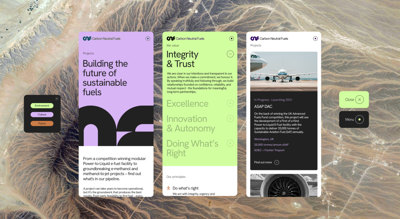 Carbon Neutral Fuels (CNF) exists at the forefront of this shift. As a pioneering SAF producer, their mission is to make clean aviation the standard rather than the exception. But their existing identity didn’t reflect the ambition or authority of a business working to transform an entire sector. They needed a brand that could embody their vision, showcase their technical rigour, and inspire belief in their ability to lead the change.