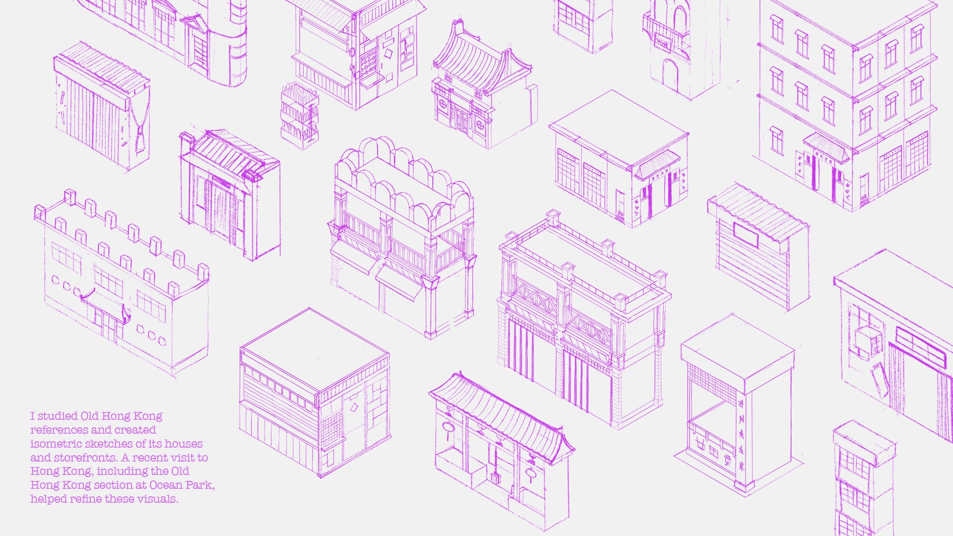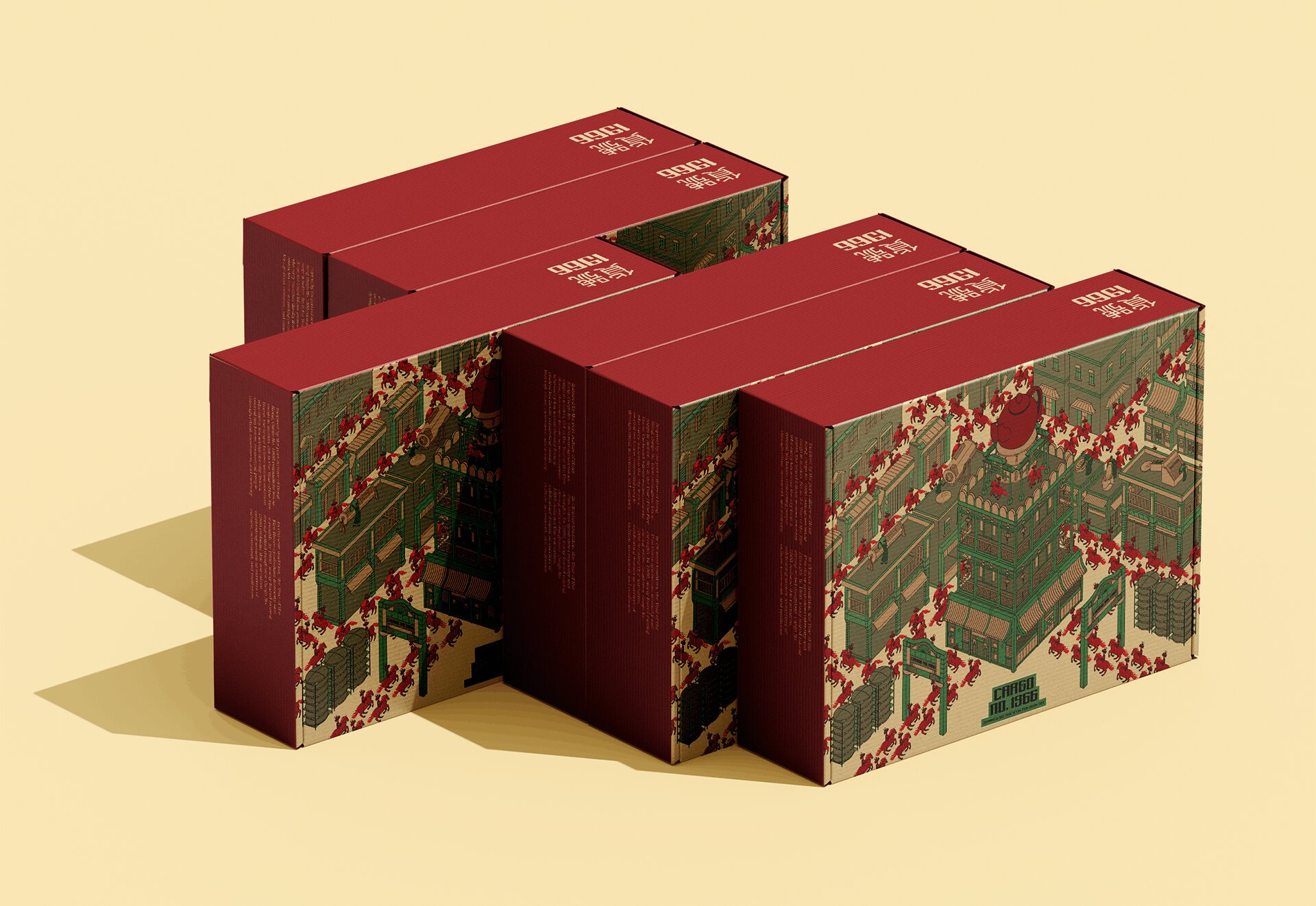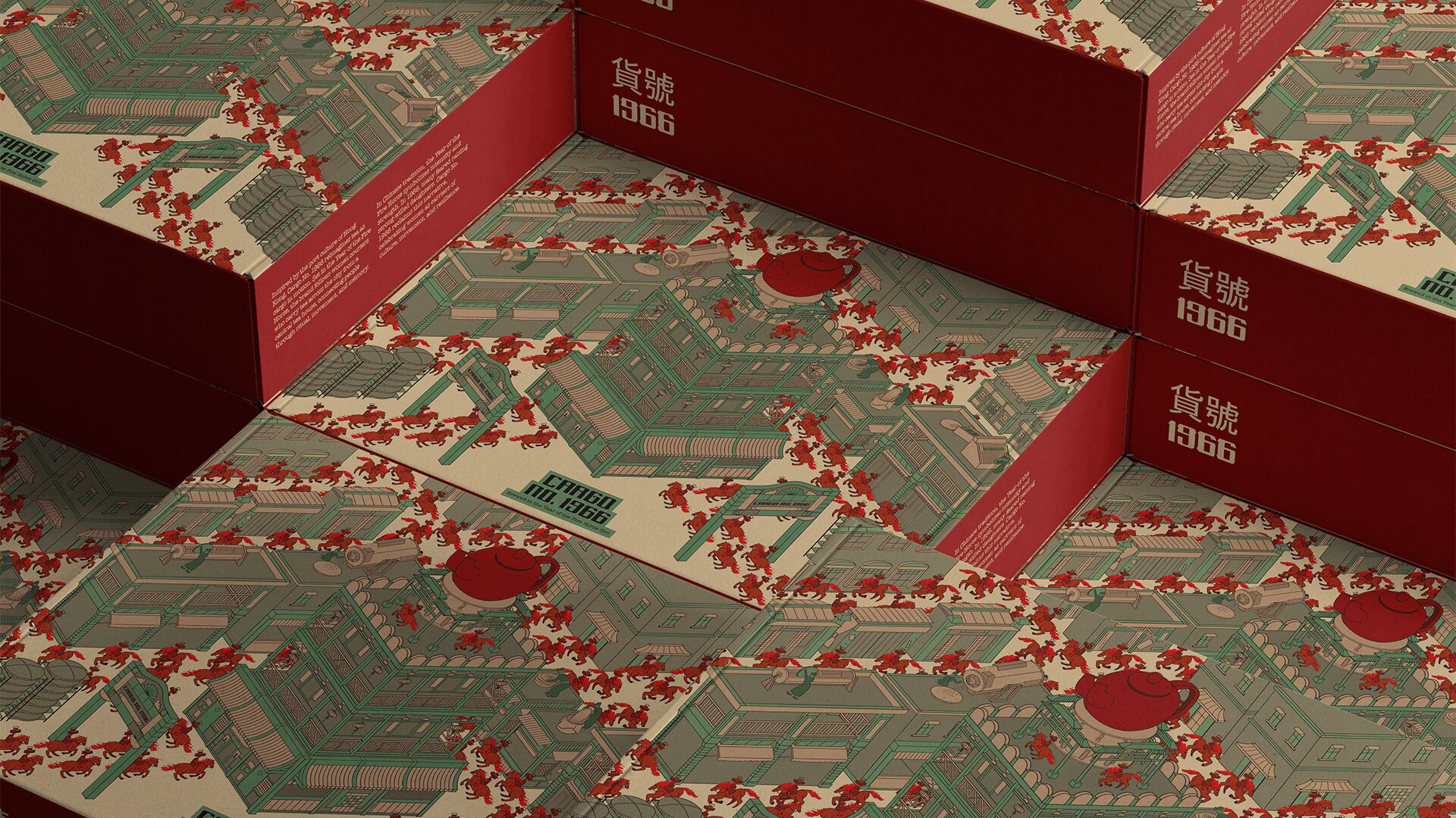 The solution was to design an immersive packaging system that translates Hong Kong’s urban and cultural identity into a detailed isometric illustration. The composition centers around a main tea house—Cargo No. 1966, from which tea is distributed across the city by women riding symbolic fire horses. The surrounding environment is built using architectural references from old Hong Kong, creating a dense yet structured cityscape. A muted color palette inspired by archival visuals was chosen to evoke a sense of history and restraint, while bold red accents highlight movement and narrative through the riders and the central teapot. The packaging includes five tea variants—green, black, oolong, white, and pu’erh.