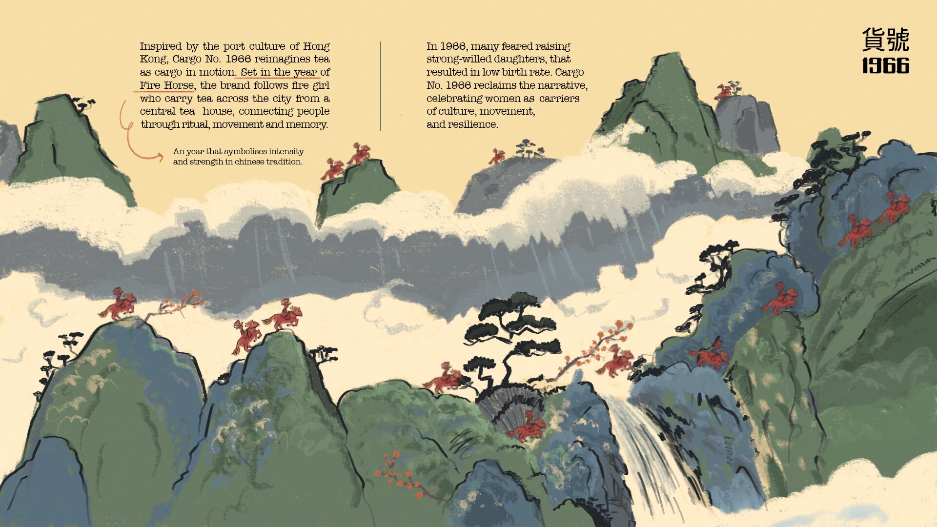 The result is a storytelling-driven packaging system that blends cultural depth with contemporary design. The illustration acts as both a visual centerpiece and a narrative map, guiding the viewer through a city in motion. By combining subtle color, detailed linework, and symbolic elements, the design moves away from conventional luxury aesthetics and instead embraces a quieter, more immersive approach. Each element, from the fire horse riders to the architectural forms contributes to a cohesive brand world where tea becomes a medium of connection and storytelling. Cargo No. 1966 transforms a simple act of brewing into an experience of place, memory, and movement, offering users a way to engage with Hong Kong beyond geography.