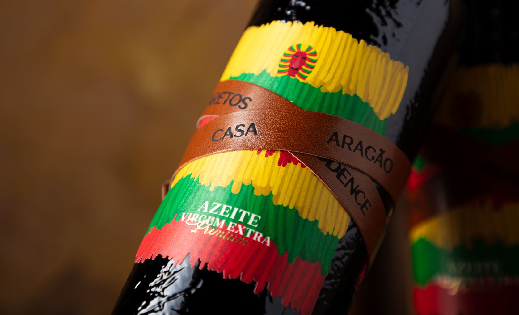Another defining feature is the reinterpretation of the leather bandoliers that cross the Caretos’ torsos. This element was translated with functional accuracy, wrapping around the bottle and creating a tactile interaction with the piece. The leather, engraved with the Casa Aragão name as well as the reference to Caretos de Podence, adds depth and authenticity to the overall design.