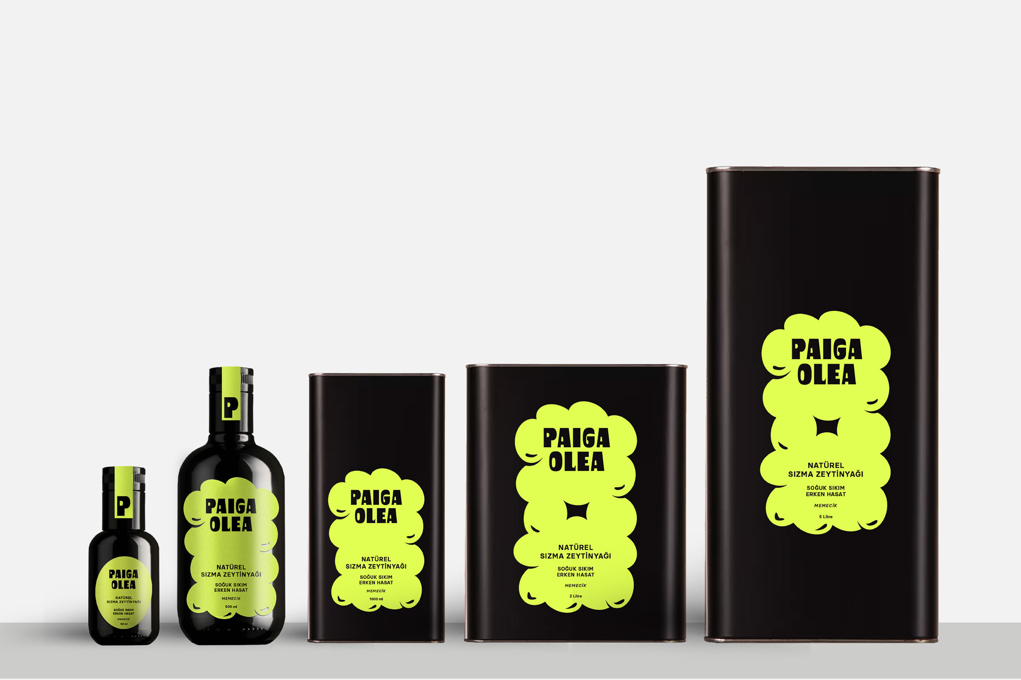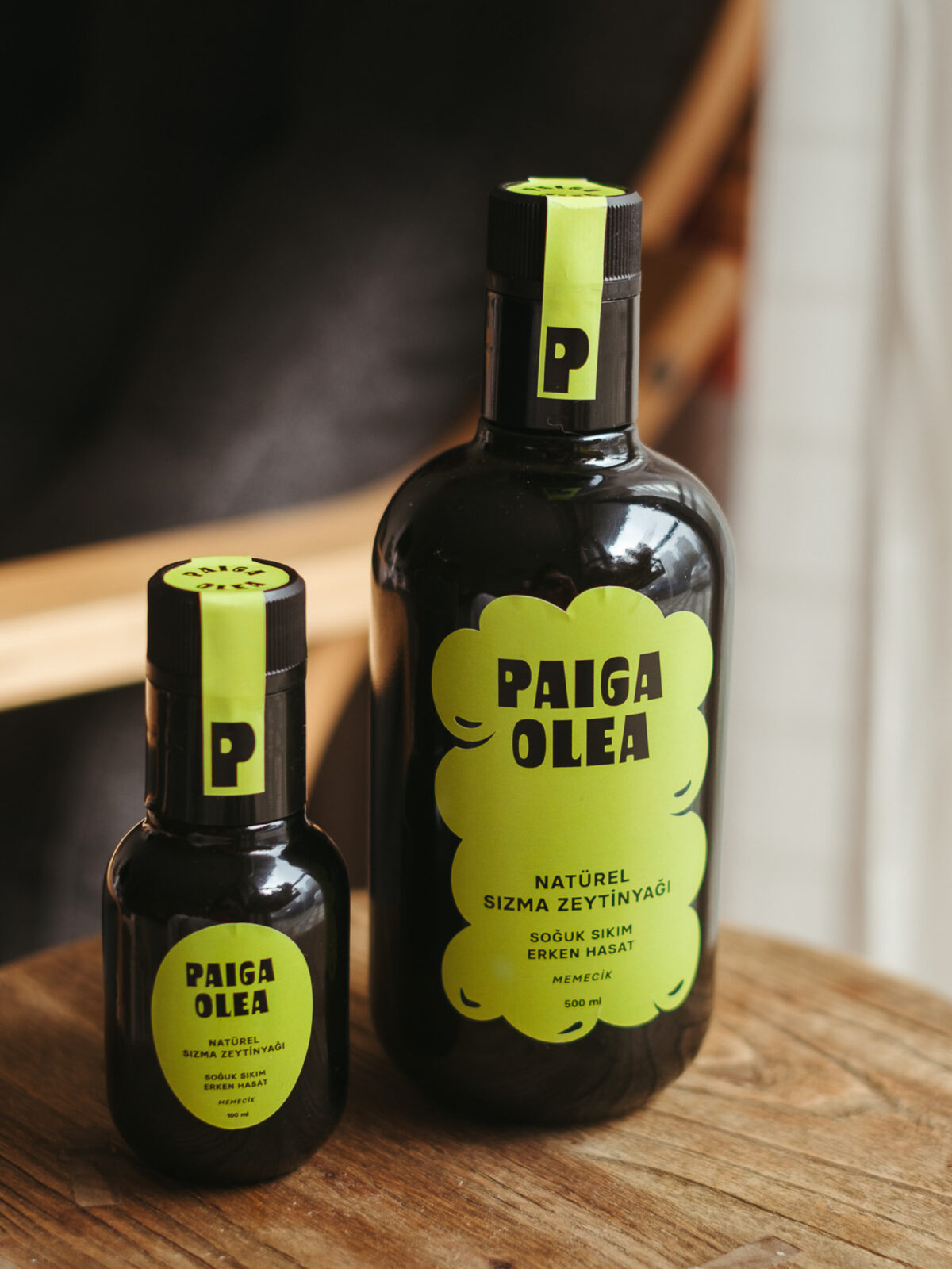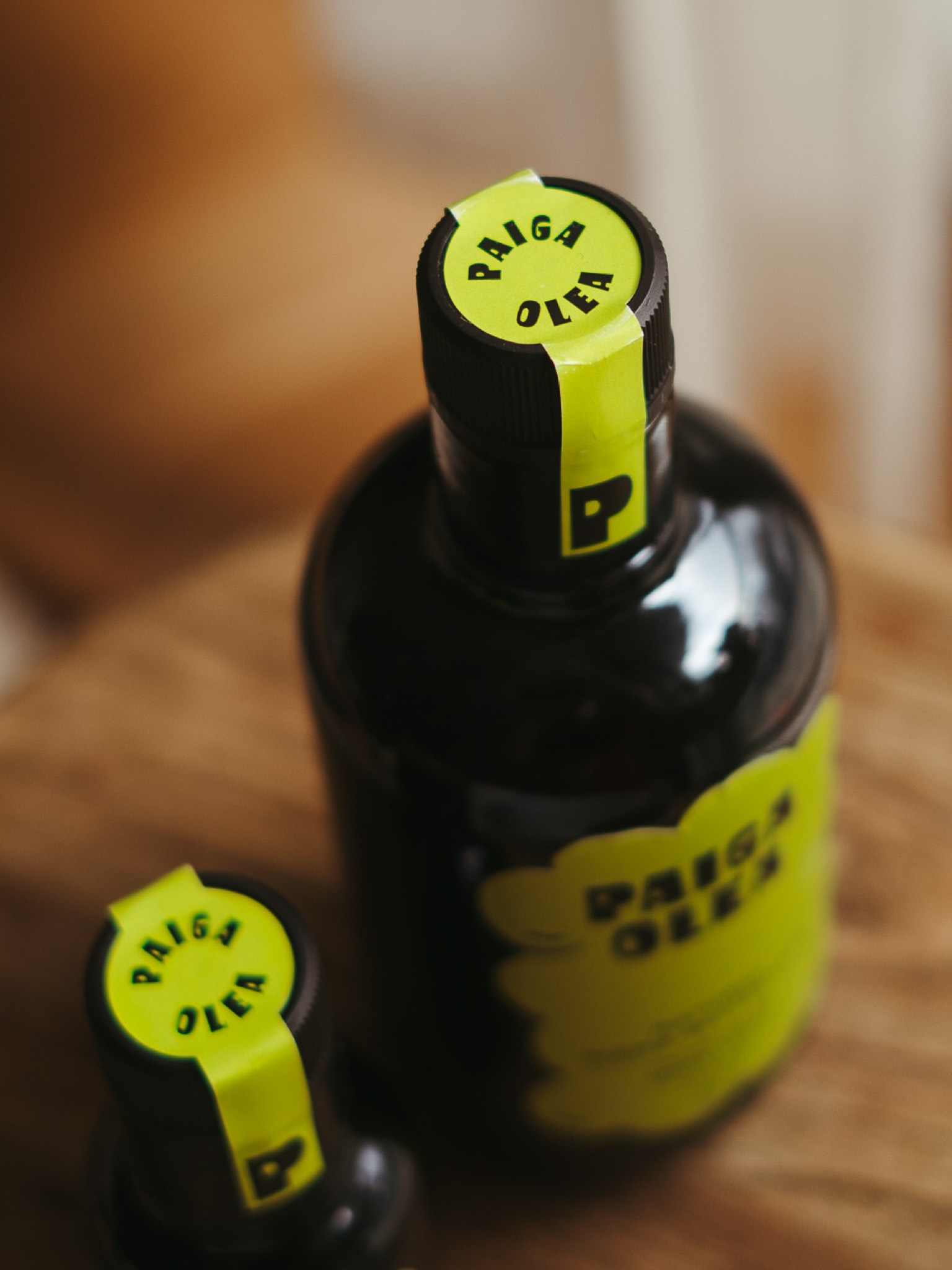 The overall look of the packaging is bold yet minimal, with a strong focus on clarity and functionality. The brand name, Paiga Olea, is presented in a memorable, playful typeface that stands out without overwhelming the design. By eliminating unnecessary decorative elements from the front label, the design allows essential information—such as the type of harvest and the pressing method—to take center stage. This stripped-down, elegant approach contributes to a premium and contemporary shelf presence that contrasts with the more traditional and often cluttered olive oil packaging styles.