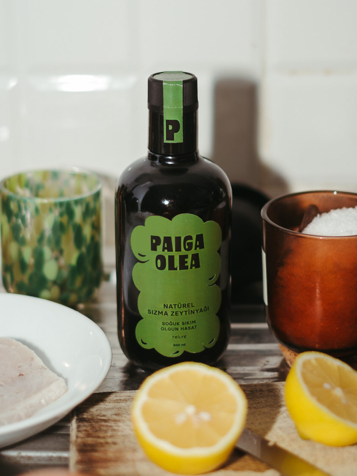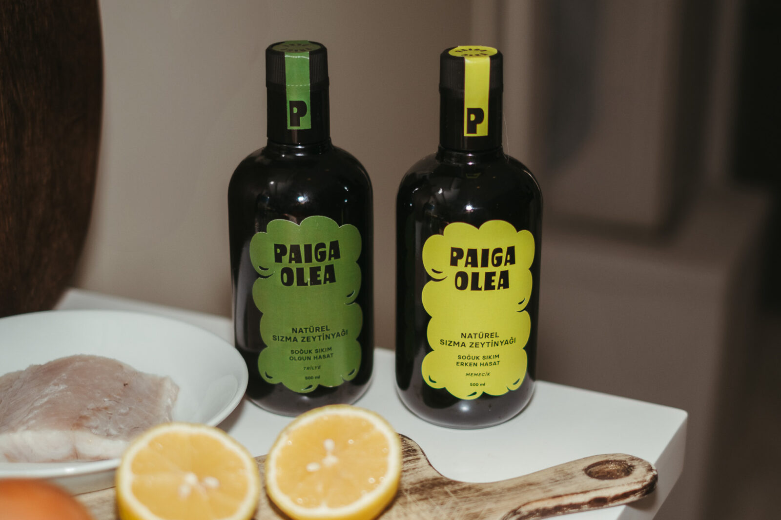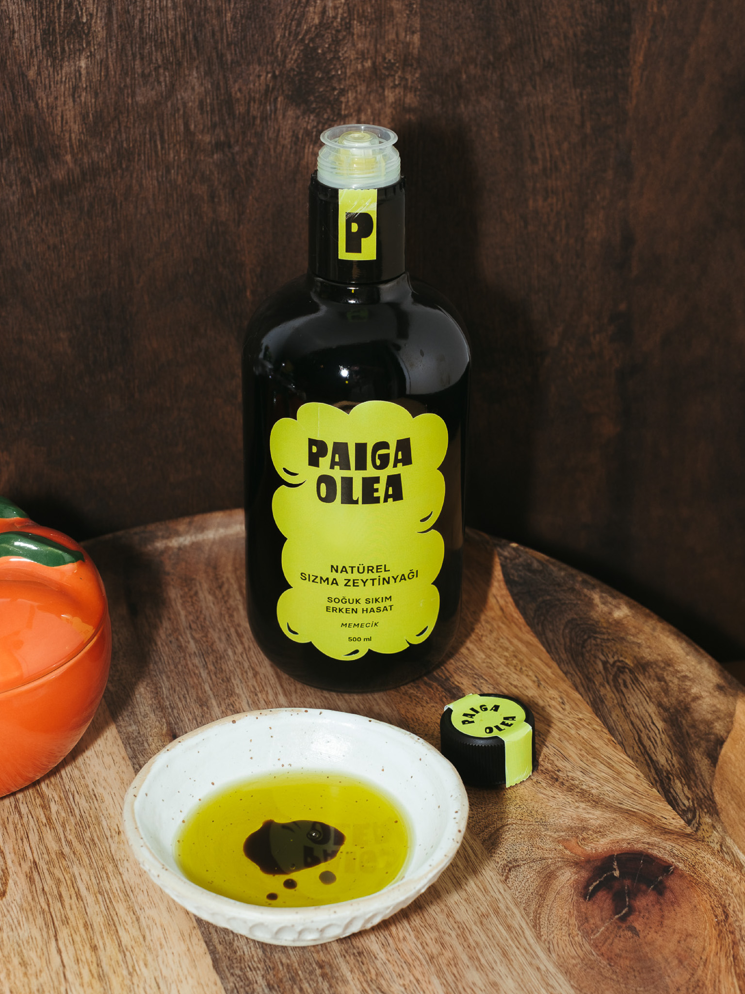 The overall look of the packaging is bold yet minimal, with a strong focus on clarity and functionality. The brand name, Paiga Olea, is presented in a memorable, playful typeface that stands out without overwhelming the design. By eliminating unnecessary decorative elements from the front label, the design allows essential information—such as the type of harvest and the pressing method—to take center stage. This stripped-down, elegant approach contributes to a premium and contemporary shelf presence that contrasts with the more traditional and often cluttered olive oil packaging styles.