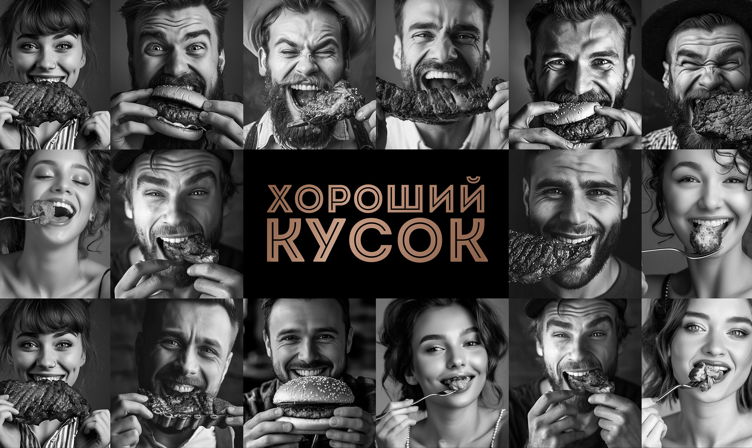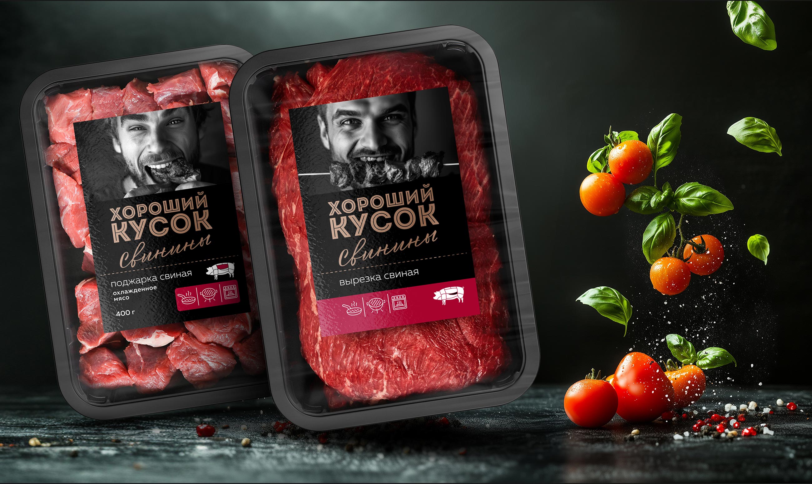 The visual identity of the brand combines naturalness, appetizing aesthetics, and a touch of humor. The packaging features bold, expressive black-and-white portraits of people genuinely enjoying a “good cut.” This evokes associations with real emotions and consumption experiences. Minimalist yet striking typography and concise icons make it easy to navigate the product range. Color-coded labels help differentiate product categories (beef, pork, etc.) while maintaining a unified brand look.