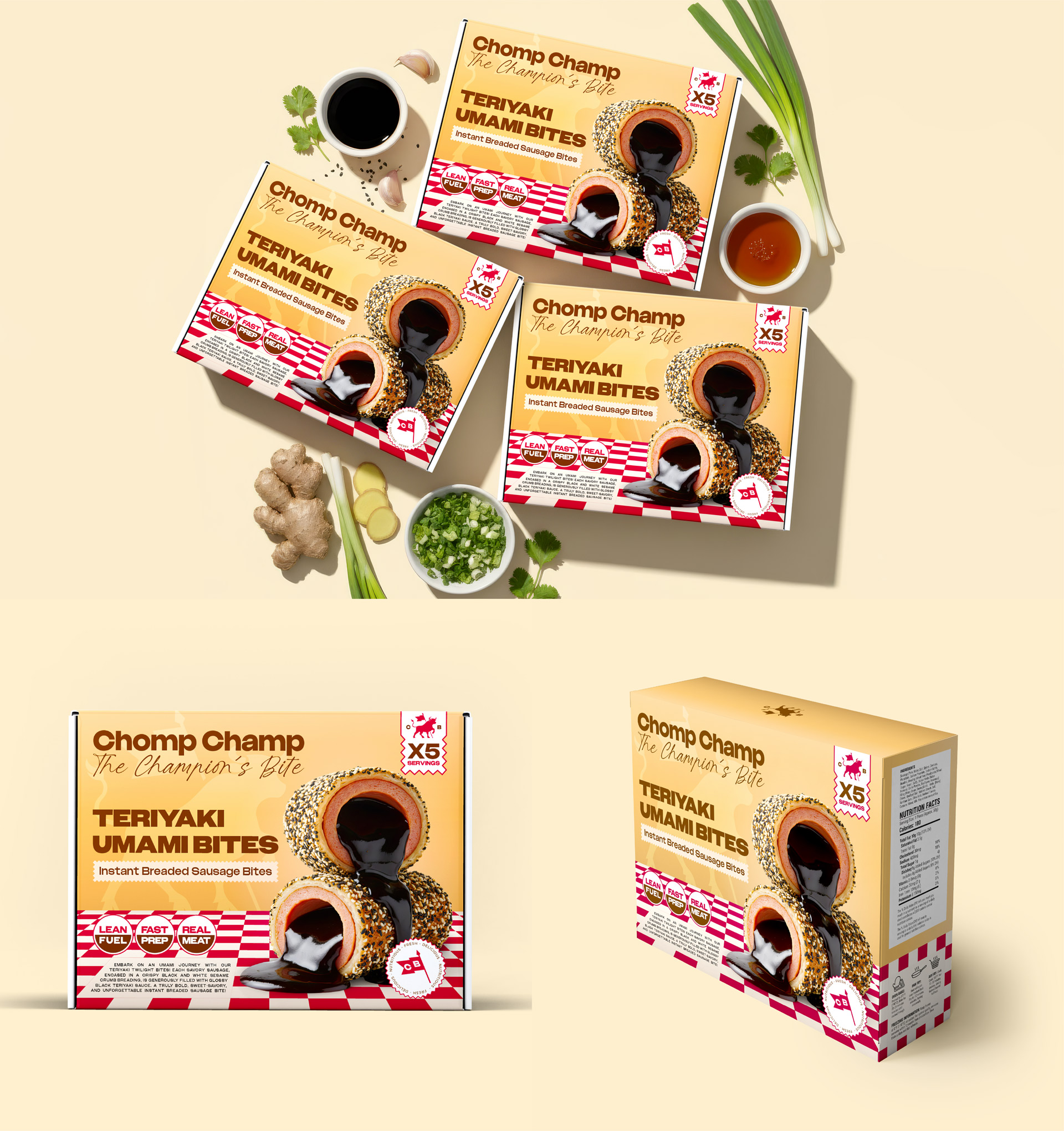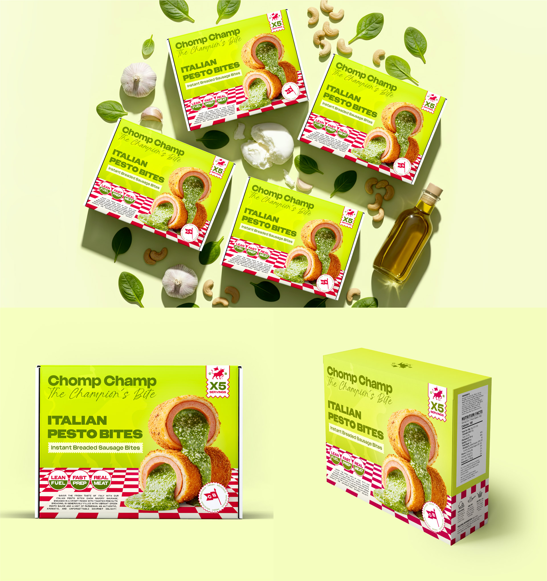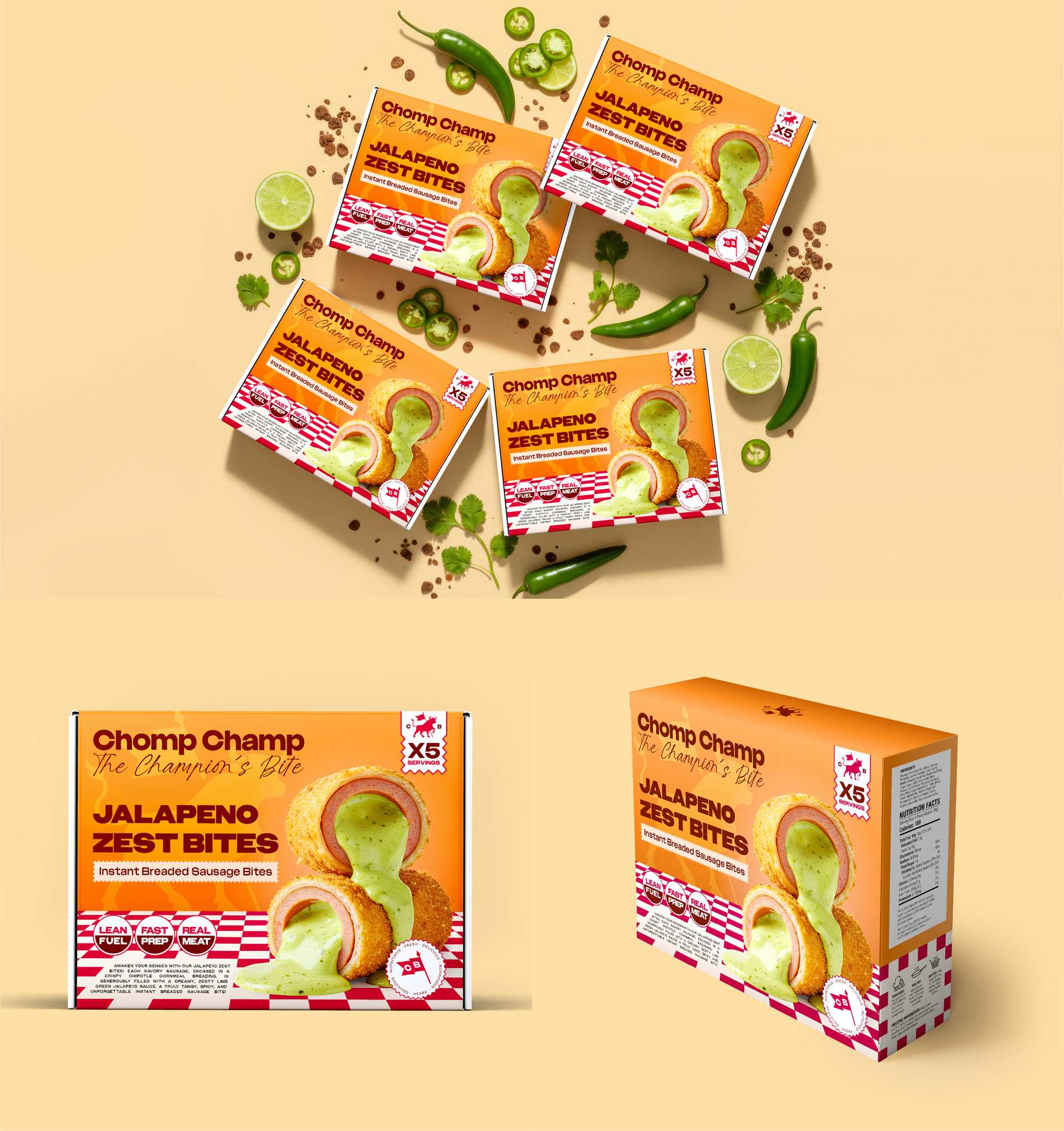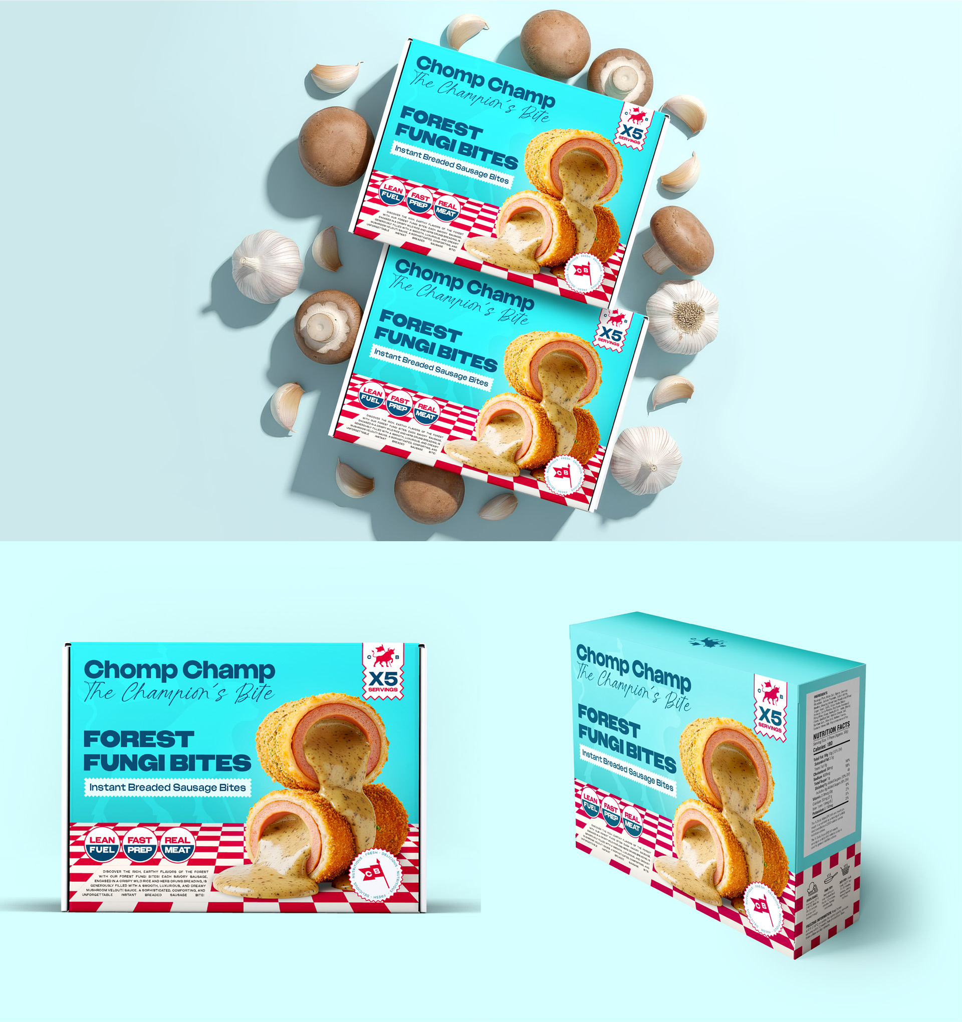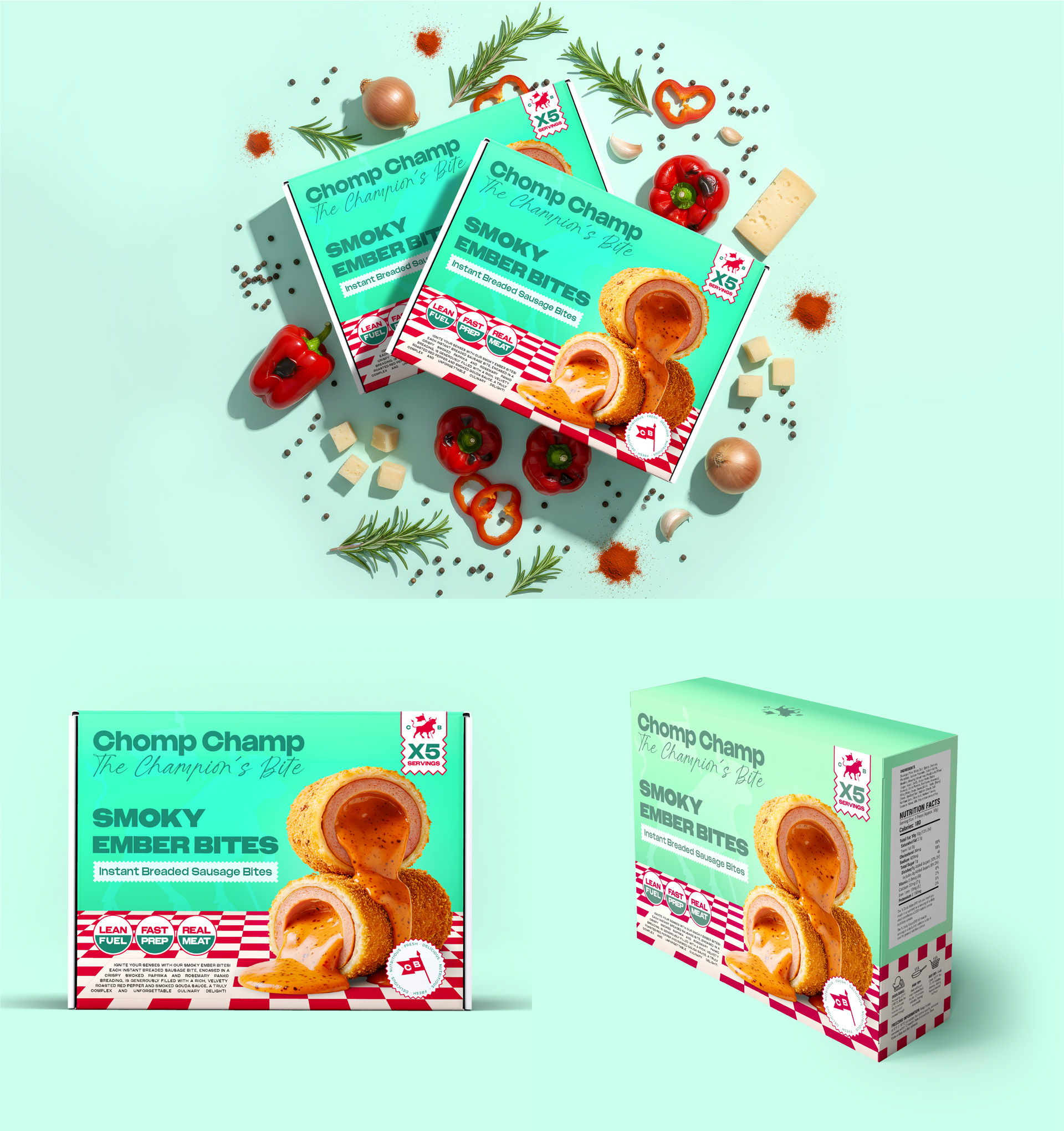 - Keywords: Chomp Champ, brand identity, sausage bites, fried sausage, branding, packaging, packaging design, product packaging, brand naming, product naming, product photography