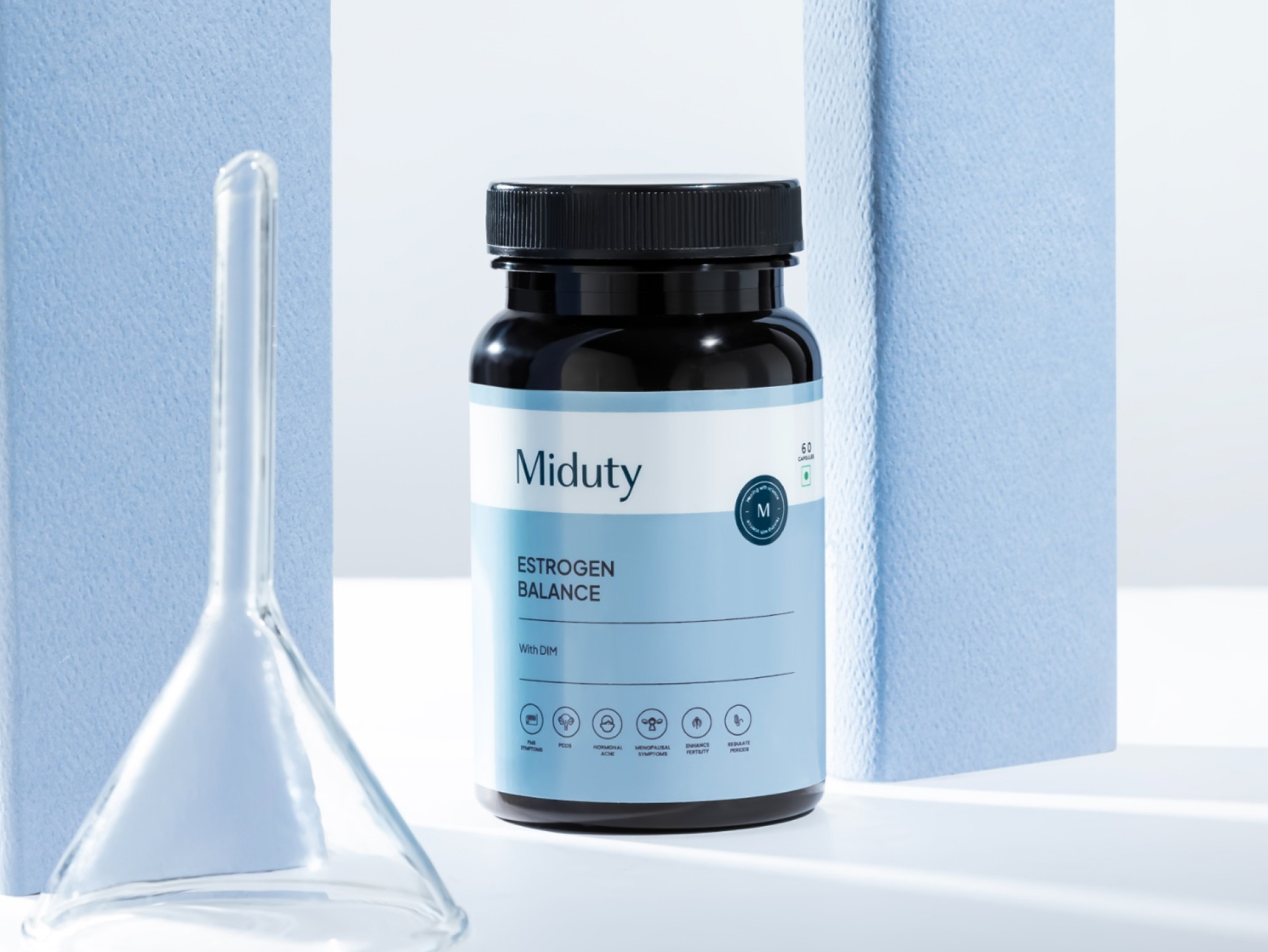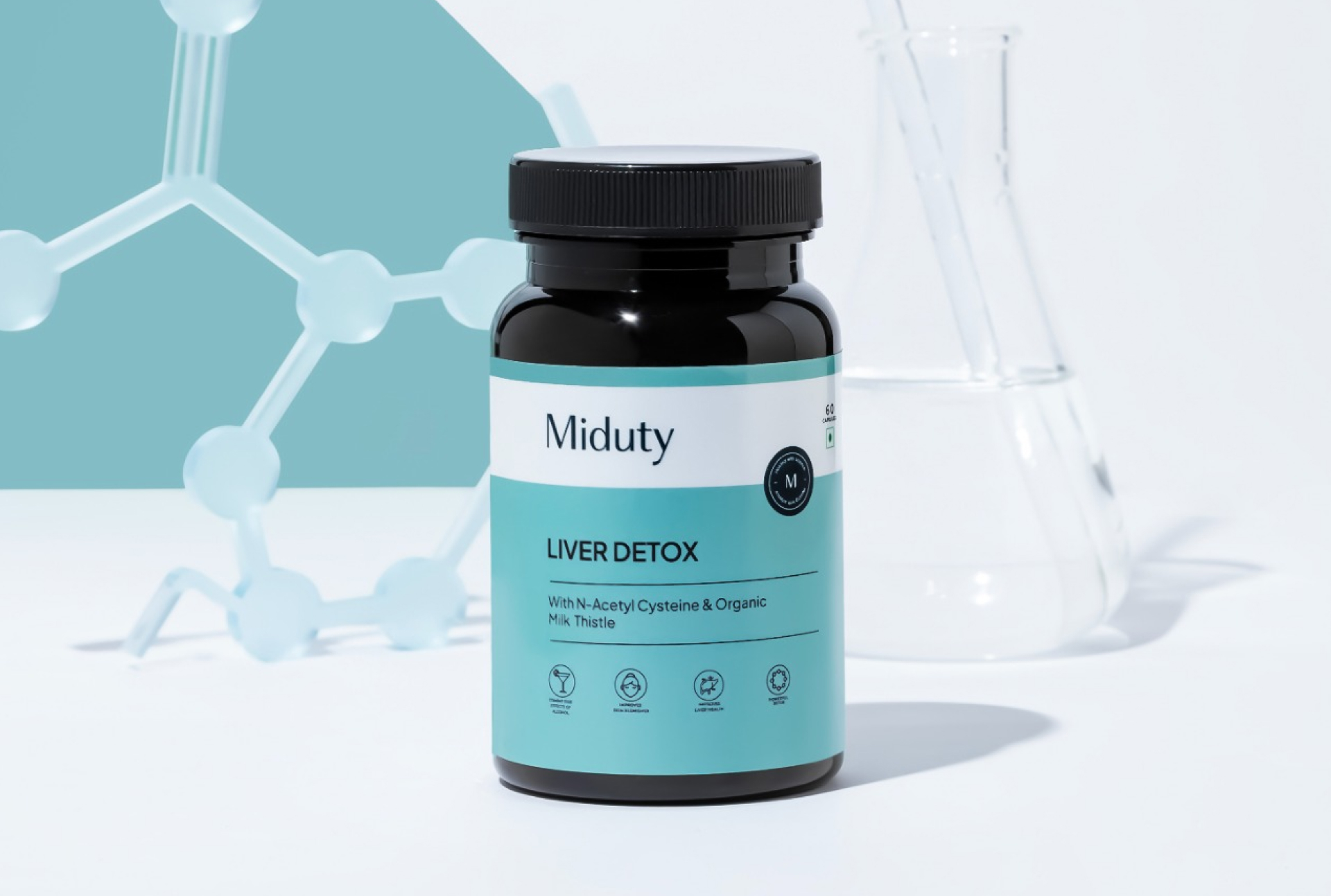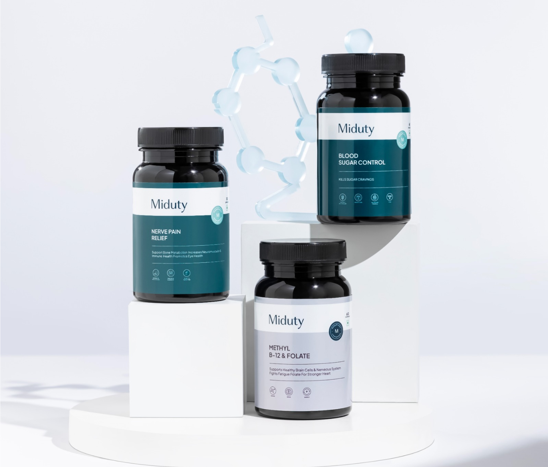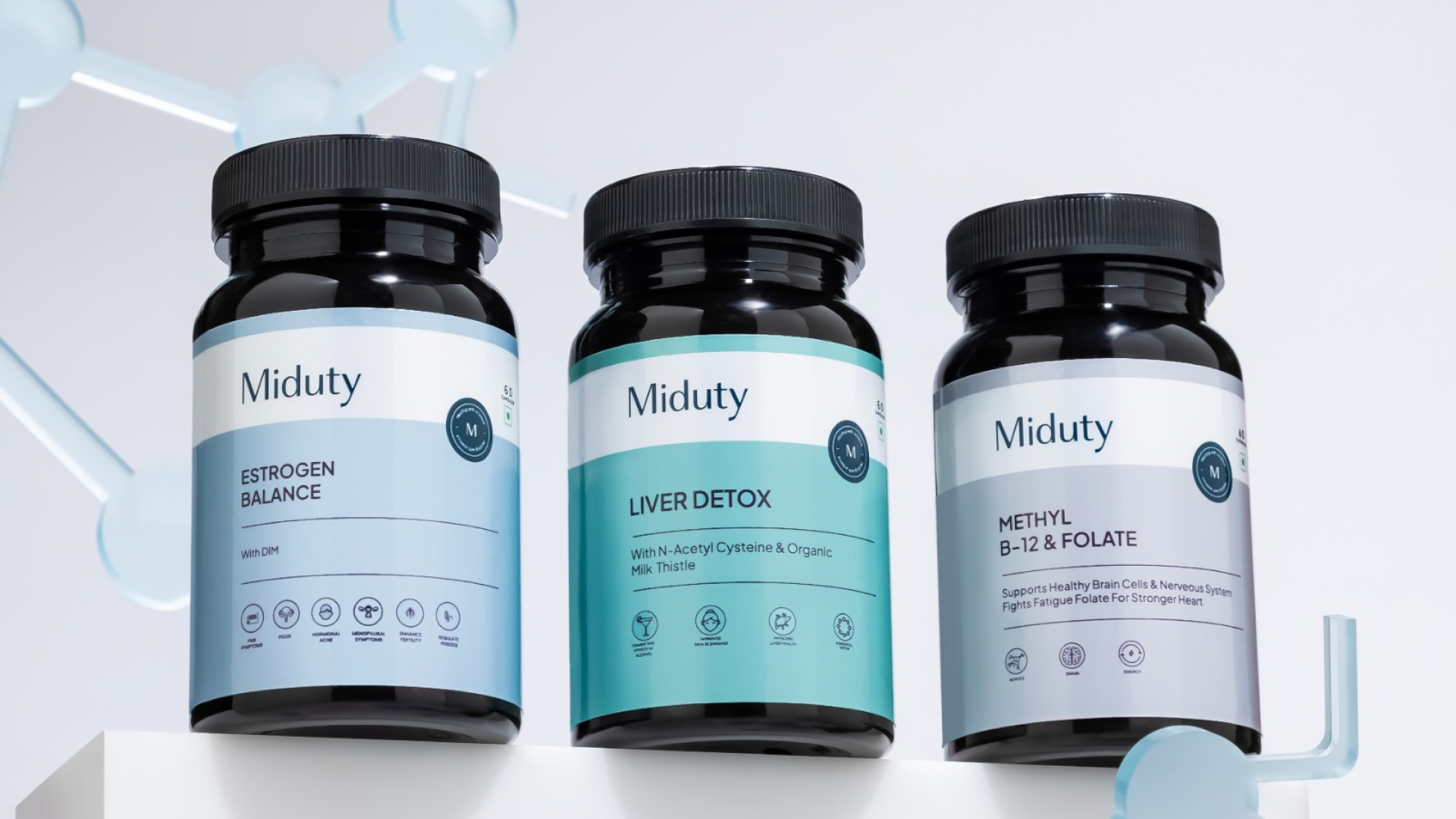 Every bottle features Miduty’s signature “M” verification badge, a seal of authenticity and research-backed integrity. The refined wordmark sits prominently at the top, establishing immediate brand recall and trust.