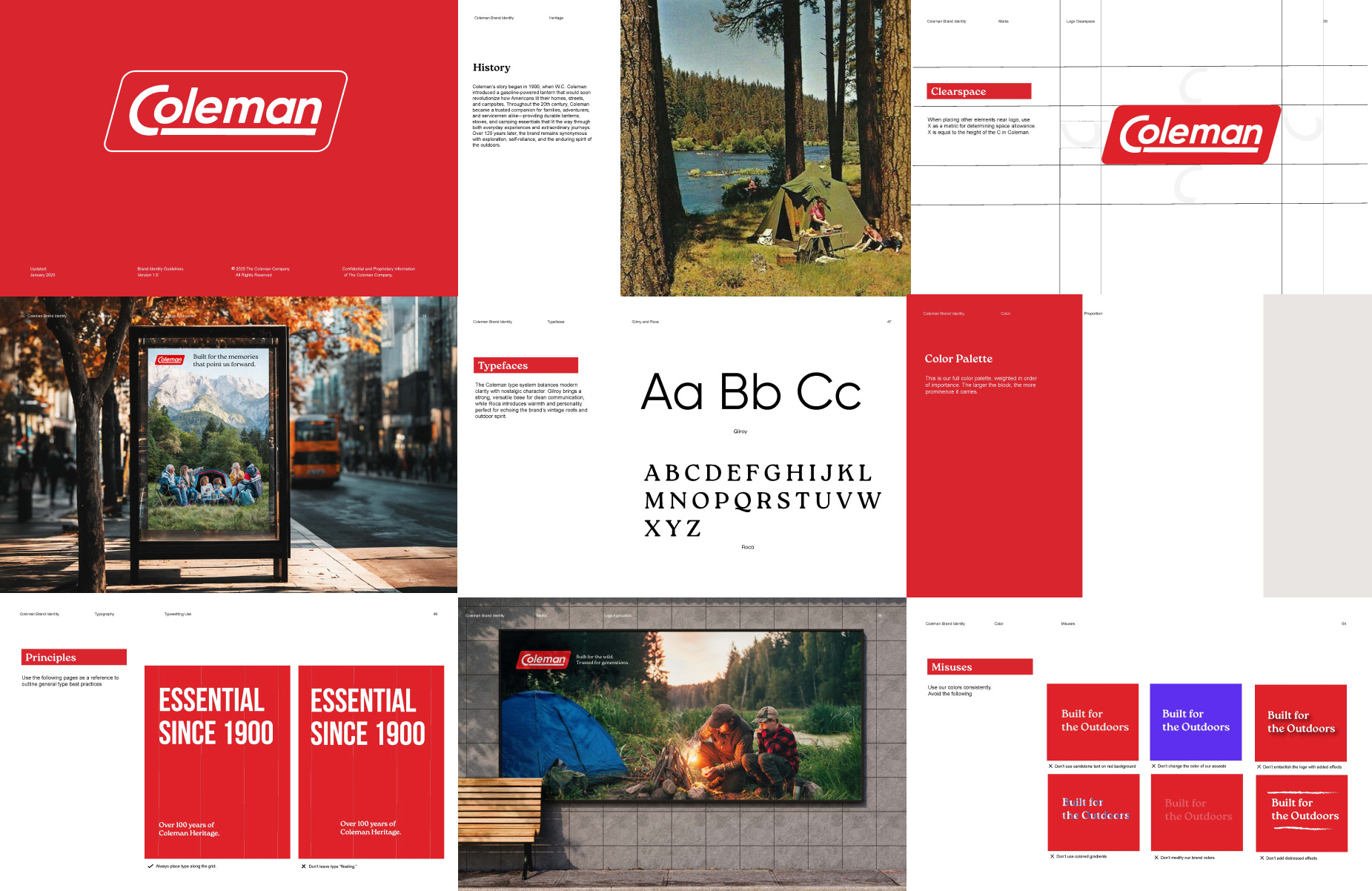 The rebrand centers on the idea of intentionally moving the next generation out into wild. I explored how Coleman could feel more intrepid, contemporary, and connected to the natural world while retaining its practical, trustworthy brand personality. The new identity leans into a bold yet grounded aesthetic: earthy colors and clean, sturdy typography inspired by vintage field manuals and classic outdoor gear. These elements work together to honor Coleman’s legacy while setting a new direction, a direction that feels sharper, intentional, and more design-conscious.