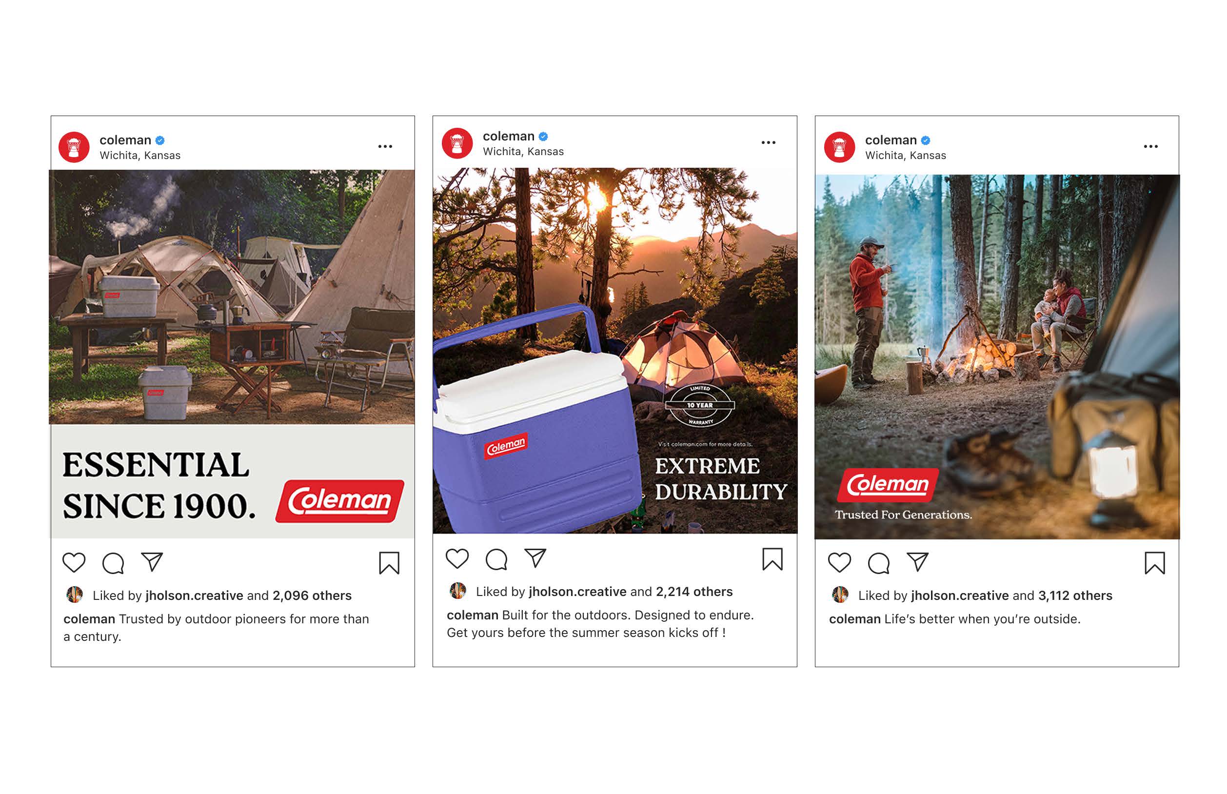 A major focus was redefining how the brand communicates the emotional side of being outdoors. Coleman is more than equipment; it’s a catalyst for stories; late-night fireside conversations, quiet misty mornings waiting for the sun to rise; the kind of moments that shape us. The rebrand brings that narrative to life through photography style, layout systems, and a revamped lantern logo mark that feels both familiar and forward-leaning.