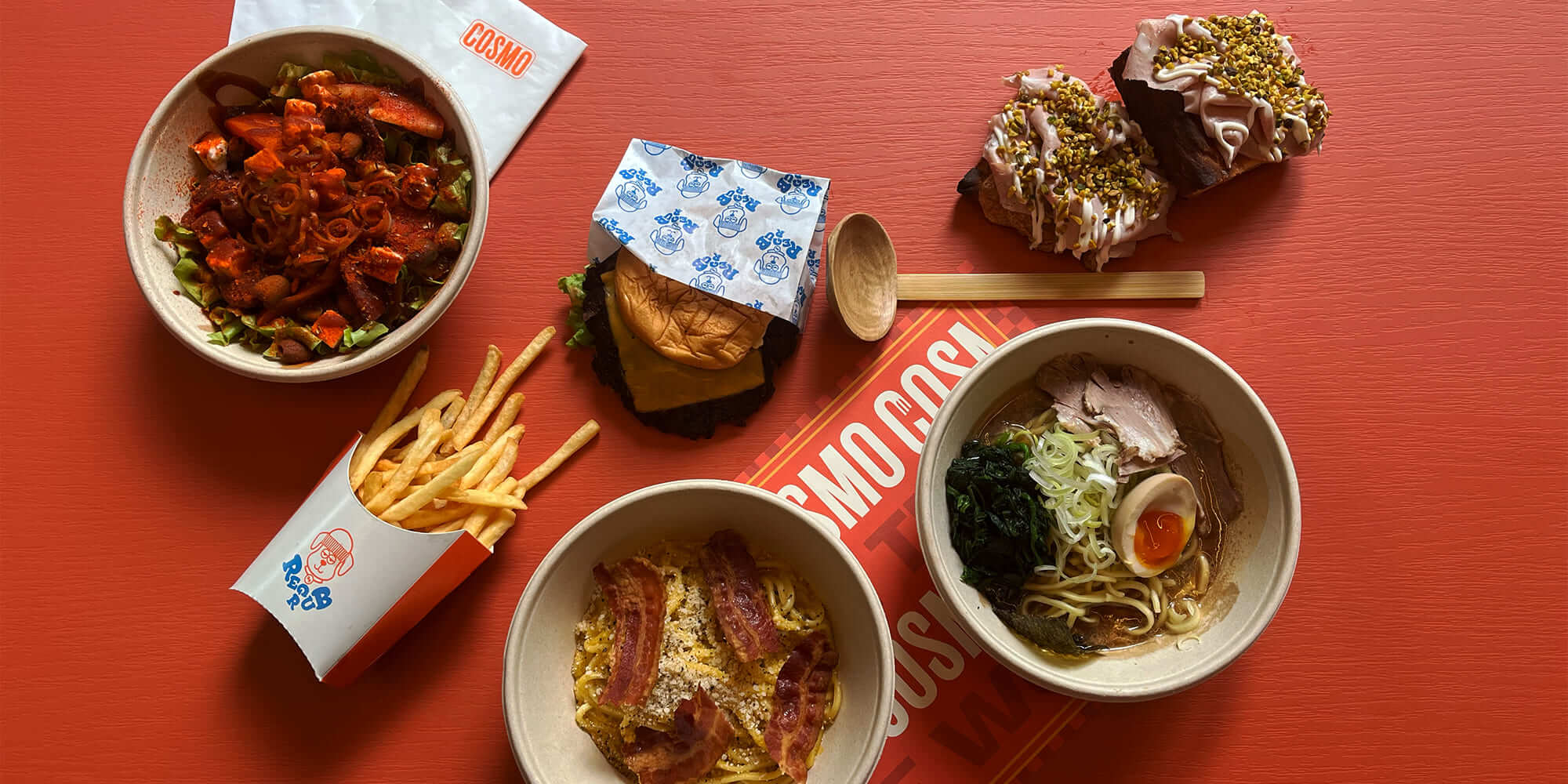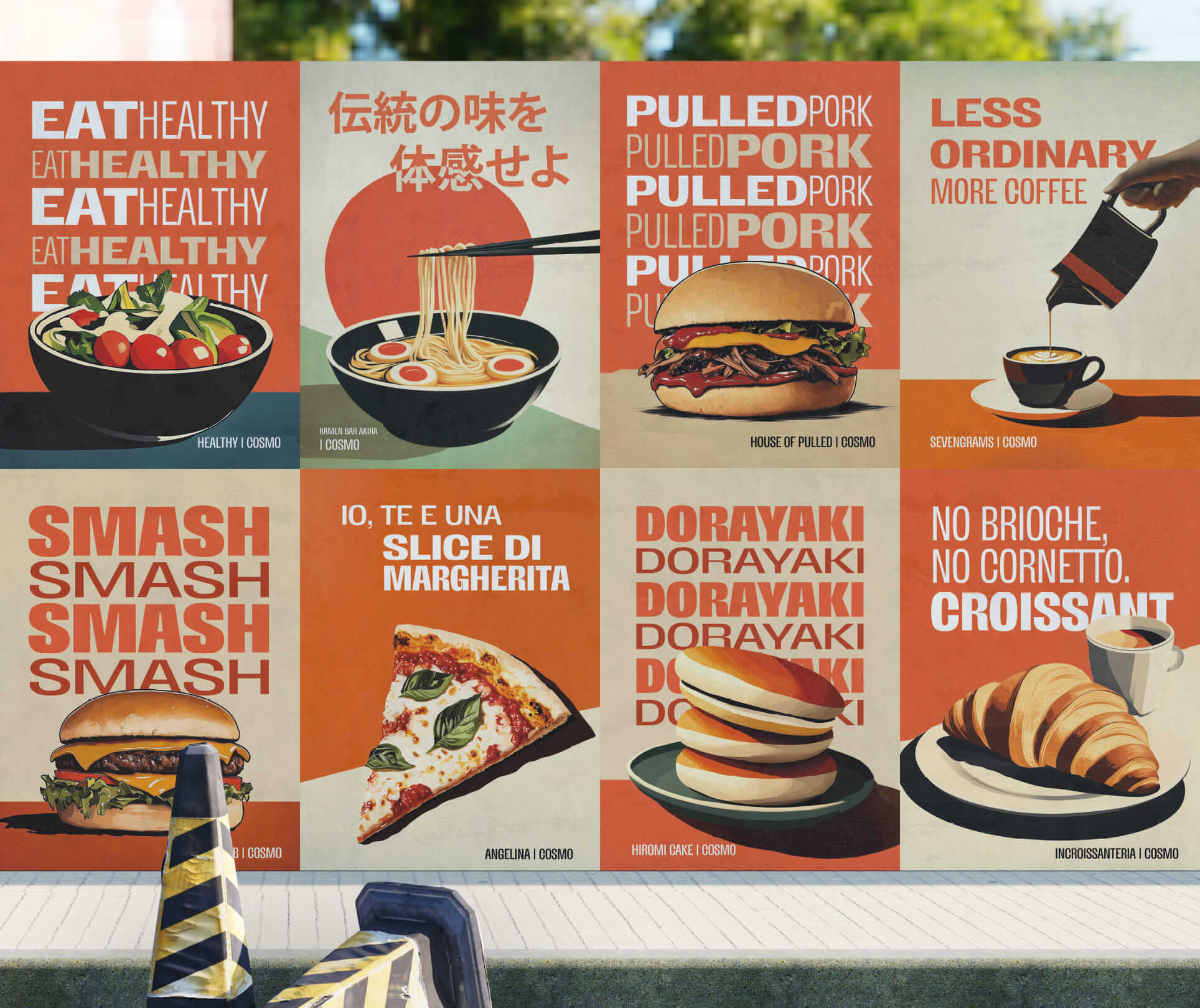 Photography and illustration work hand in hand to extend this narrative. High-quality imagery highlights the richness of Cosmo’s offering — spanning from comforting ramen bowls and gourmet burgers to artisanal desserts crafted with precision. Illustrations add a layer of personality and approachability, emphasizing creativity and the brand’s urban spirit. Layouts are dynamic, built on clear typography and asymmetric compositions that balance expressive energy with functional clarity, ensuring legibility across all contexts.