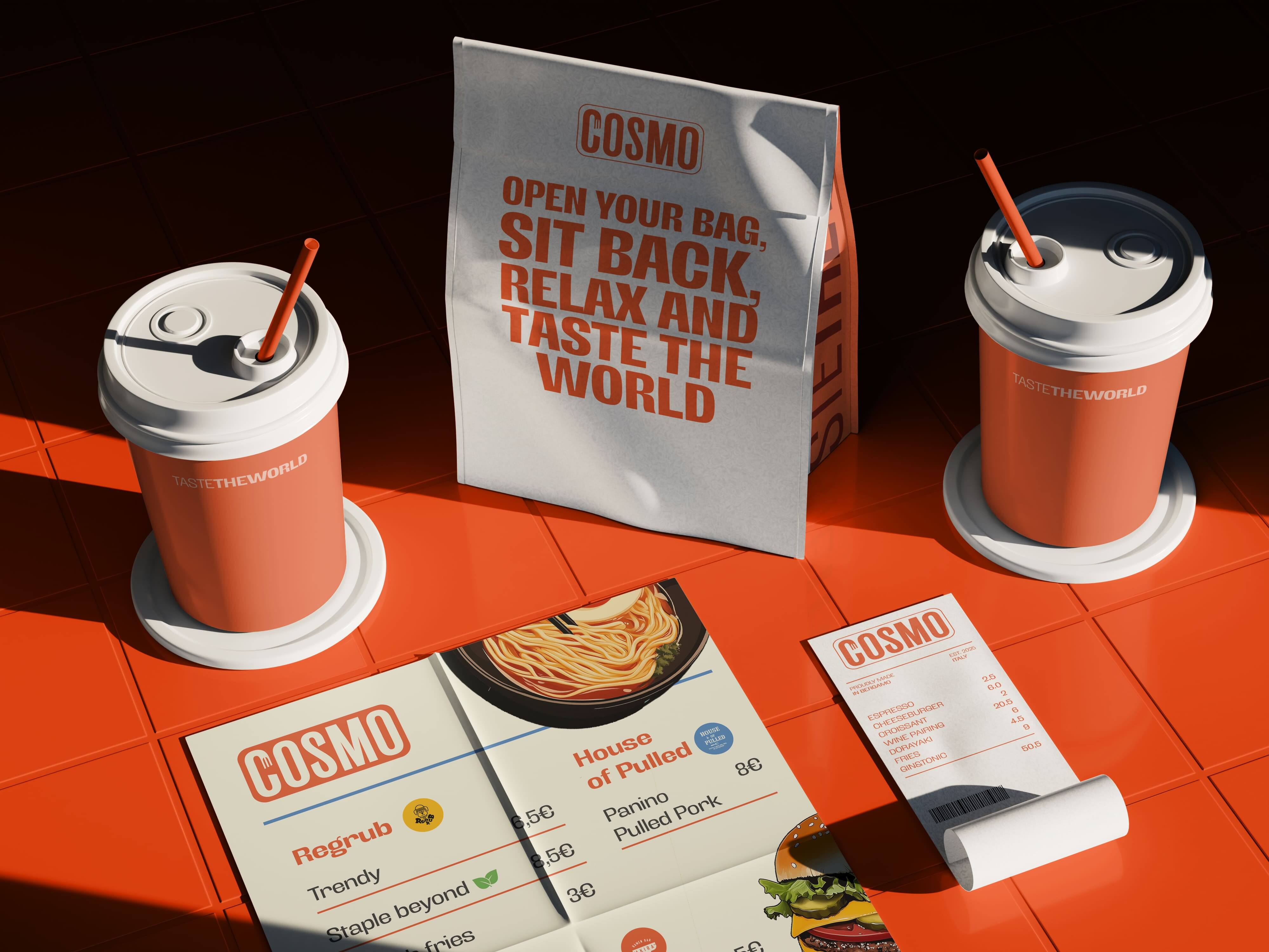 The system is versatile, carefully structured to adapt seamlessly across print, digital, packaging, and environmental design. Cosmo is not only a brand identity; it is a complete experience, one that translates the excitement of street food culture into a strong, cohesive, and immersive visual world.