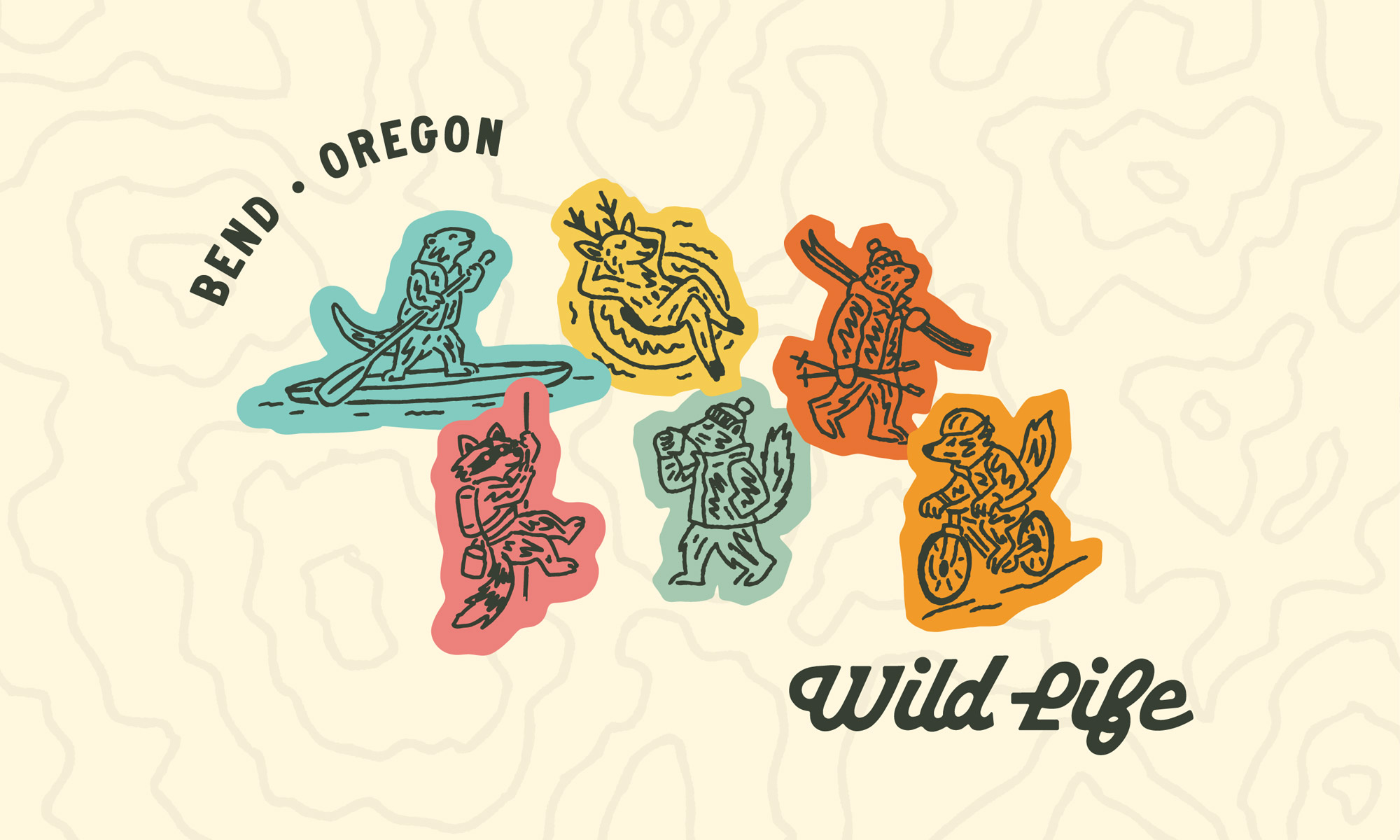 The concept celebrates Bend’s unique lifestyle through a cast of playful hand-drawn wildlife illustrations. Familiar regional animals are reimagined living the Bend way of life: skiing before work, mountain biking after lunch, paddle boarding the river, climbing local crags, or floating downstream with a drink in hand. These characters bring warmth, humor, and storytelling into the identity while helping the brand avoid predictable mountain-town clichés. Instead of relying on generic peaks, pine trees, or overly rugged tropes, the illustrations create a more memorable and human sense of place.