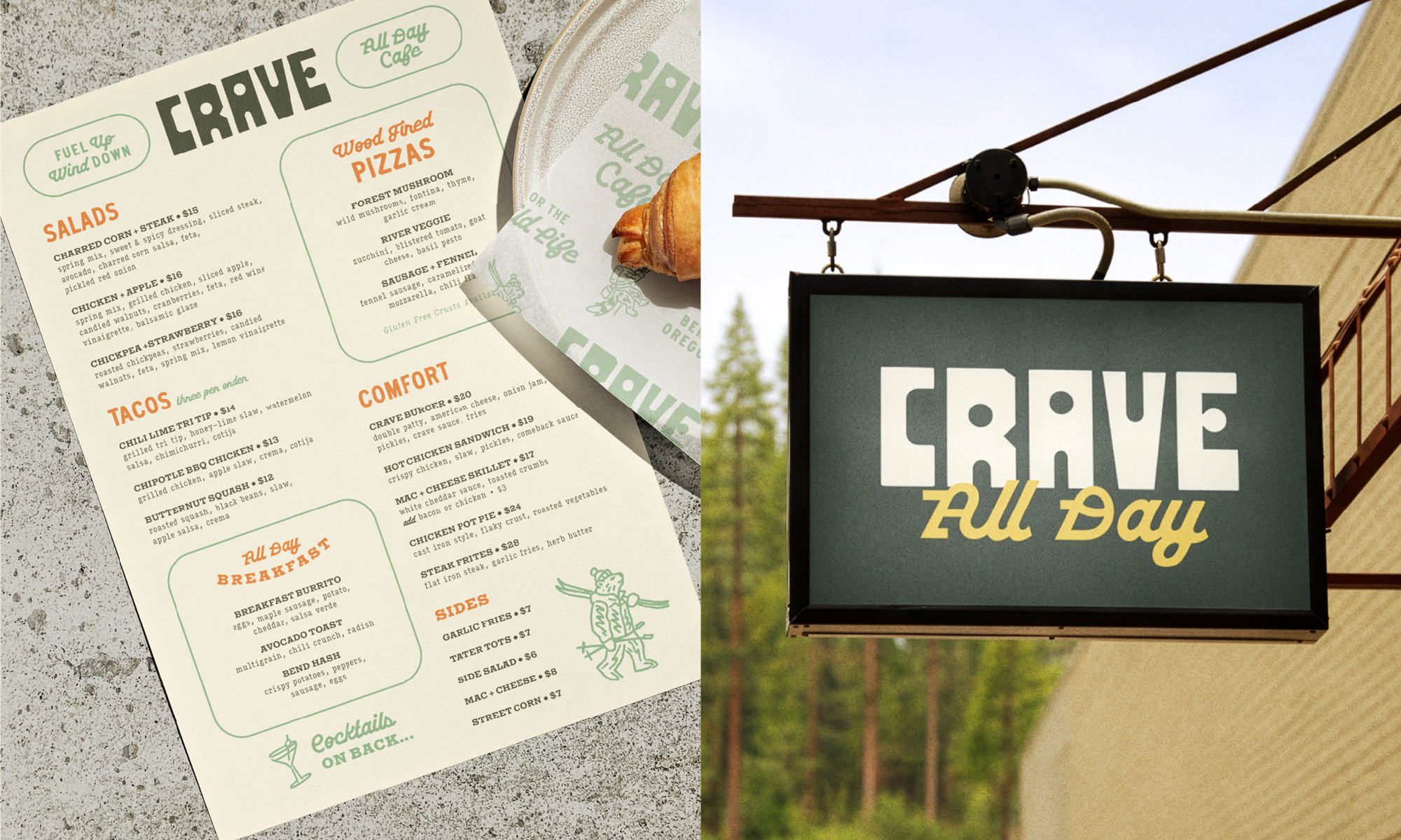 Brand messaging was developed to reinforce the lifestyle behind the concept. Phrases such as “For the Wild Life,” “Fuel Up, Wind Down,” and “All Day Cafe” position Crave as more than a restaurant—it becomes a social basecamp for locals and visitors alike. A place to start the day, recharge between adventures, or gather after hours.