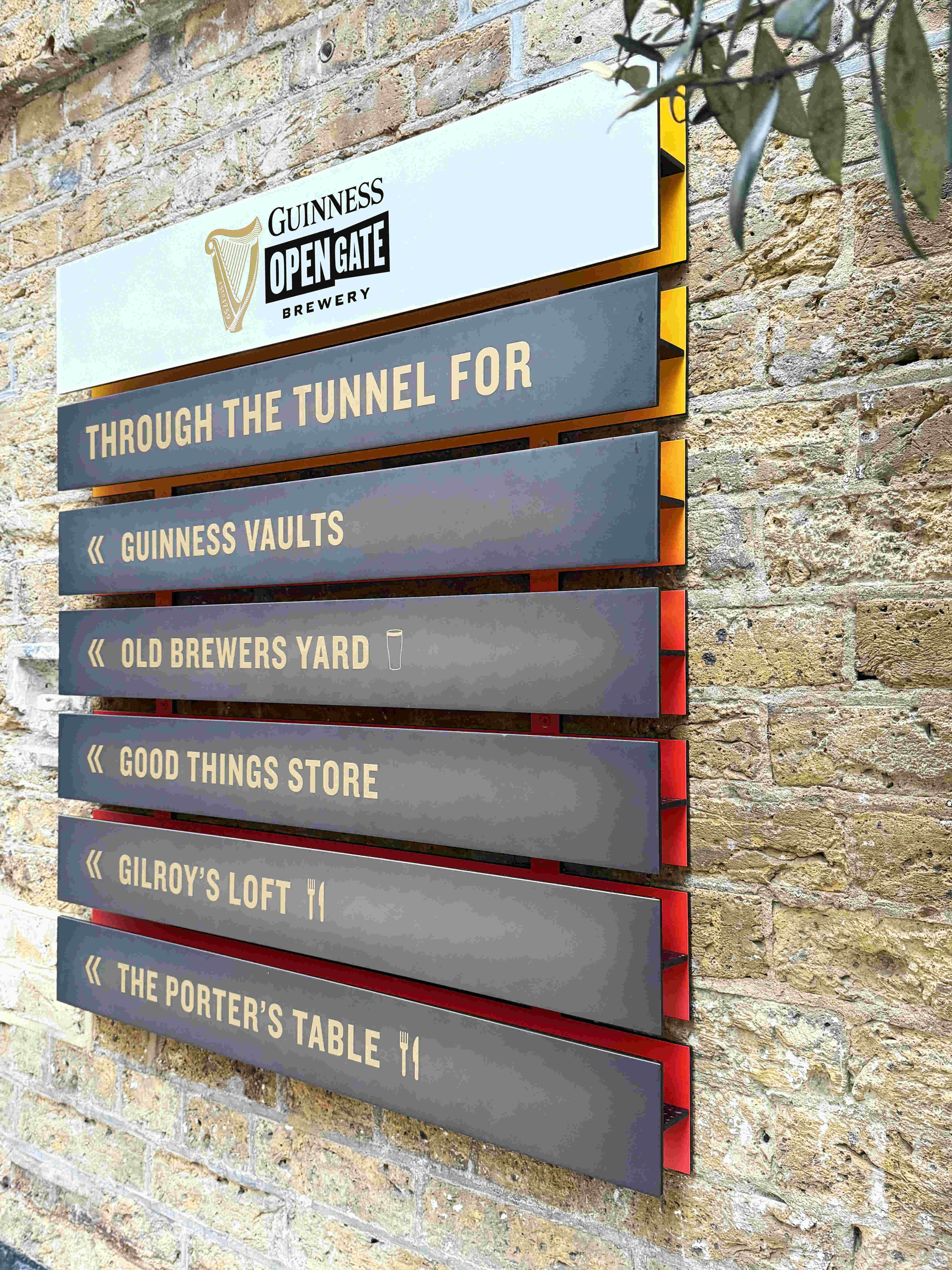 Guinness Open Gate Brewery occupies multiple buildings across an historic and complex Quarter, therefore wayfinding had to functionally assist both planned and unplanned visitors, giving them a sense of what’s on offer and how to locate each offer, while guiding flow around the site. The concept behind the wayfinding throughout the site is “Discover the Unexpected”. The design is creative, playful and distinctly Guinness, and reflects the vibrancy of the brand while aligning with the creativity and character of the neighbourhood of Covent Garden. The aim is to convey brand warmth, tell authentic stories and make people smile in a way that only Guinness can.