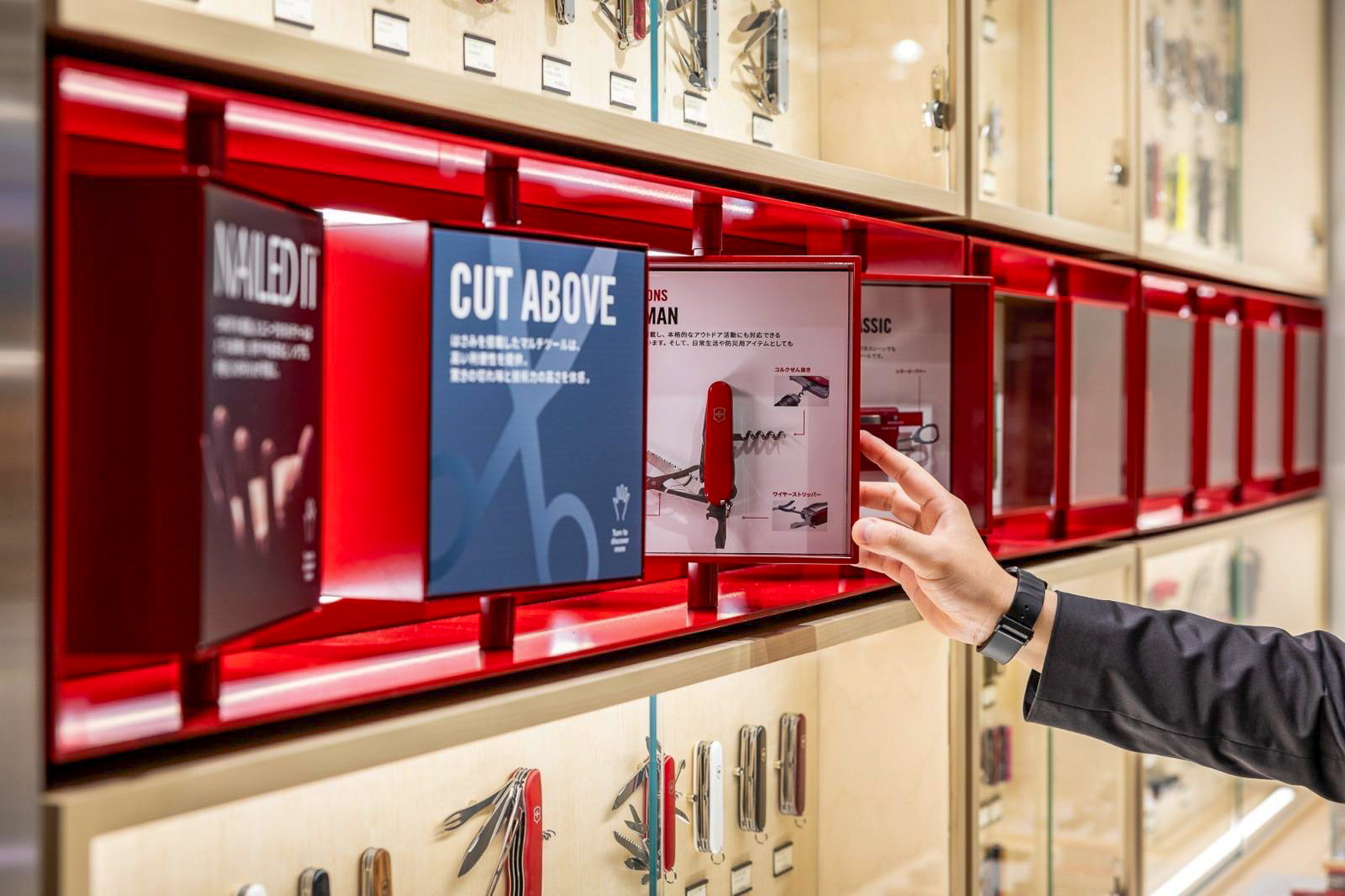In the Ginza store, interactive displays tell the story of each knife and encourage visitors to explore and pick the Swiss Army Knife best suited to them. Visitors can also create and assemble their own knife at the personalisation table. The table itself brings the cues of a workshop to life, with tools and technical illustrations on display that reinforce Victorinox’s design and craftsmanship heritage.