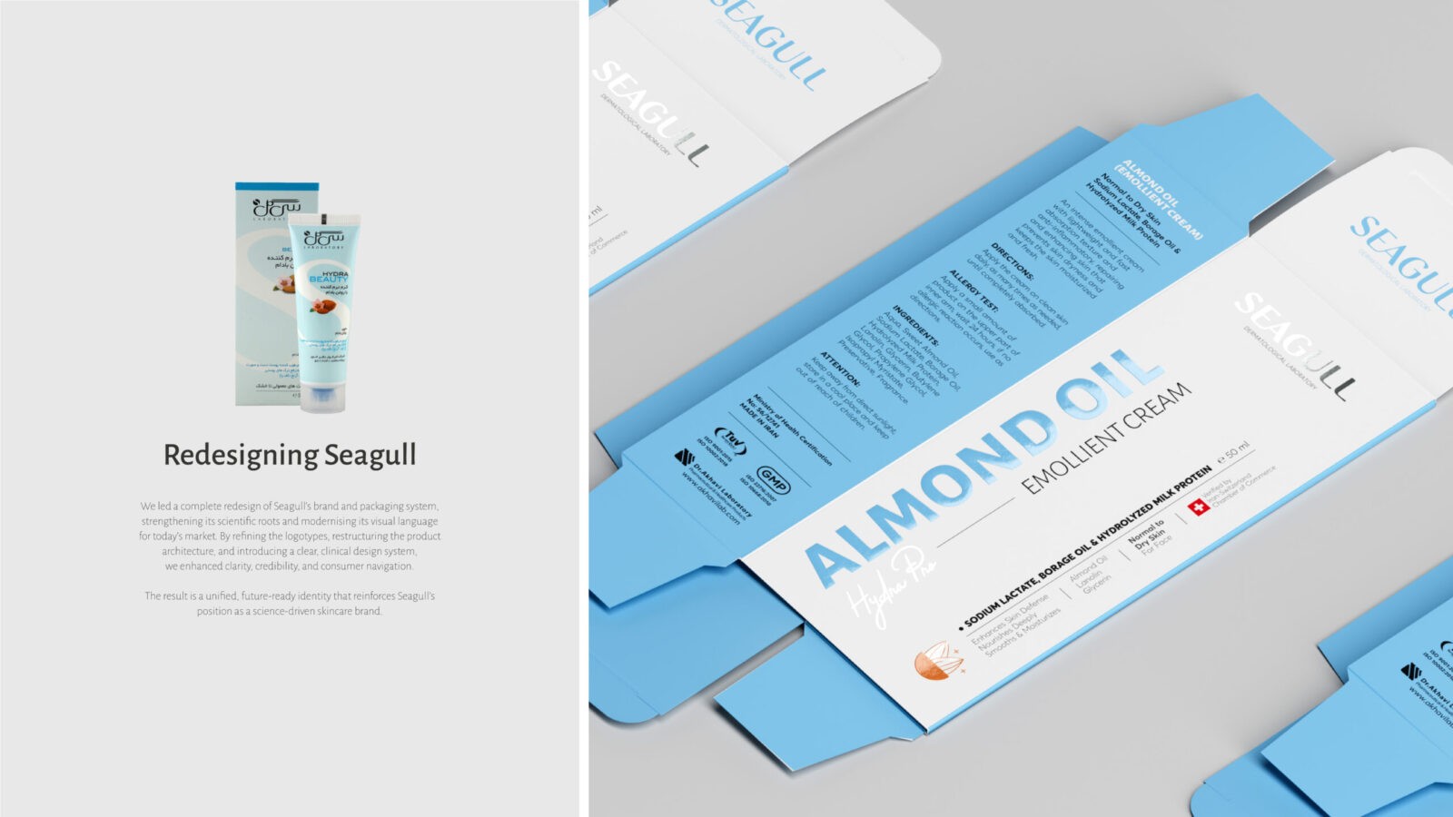 Seagull, a heritage skincare brand with more than five decades of pharmaceutical expertise in the region served by the Gulf Cooperation Council, and mena engaged our studio to realign its packaging and brand identity with its scientific foundations and the expectations of today’s rapidly evolving skincare market. Although the brand carried deep clinical credibility and a long-established relationship of trust with consumers, its visual language had become outdated and fragmented, lacking the structural clarity, cohesion, and contemporary relevance needed to communicate its scientific strengths. The strategic brief therefore centred on redefining the brand architecture, redesigning both Persian and English logotypes, and creating a unified visual system to reinforce Seagull’s positioning as a science-driven, future-ready skincare authority.