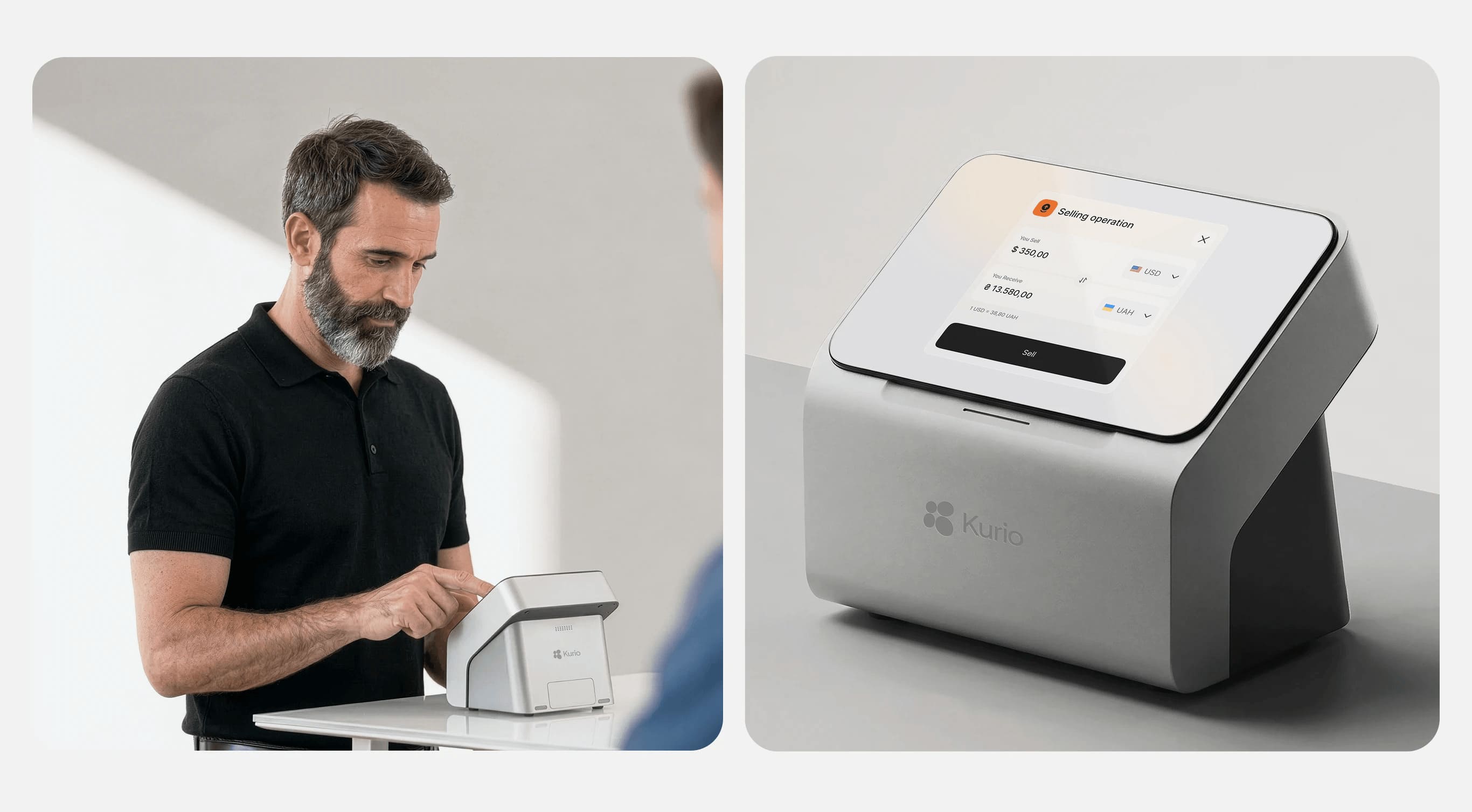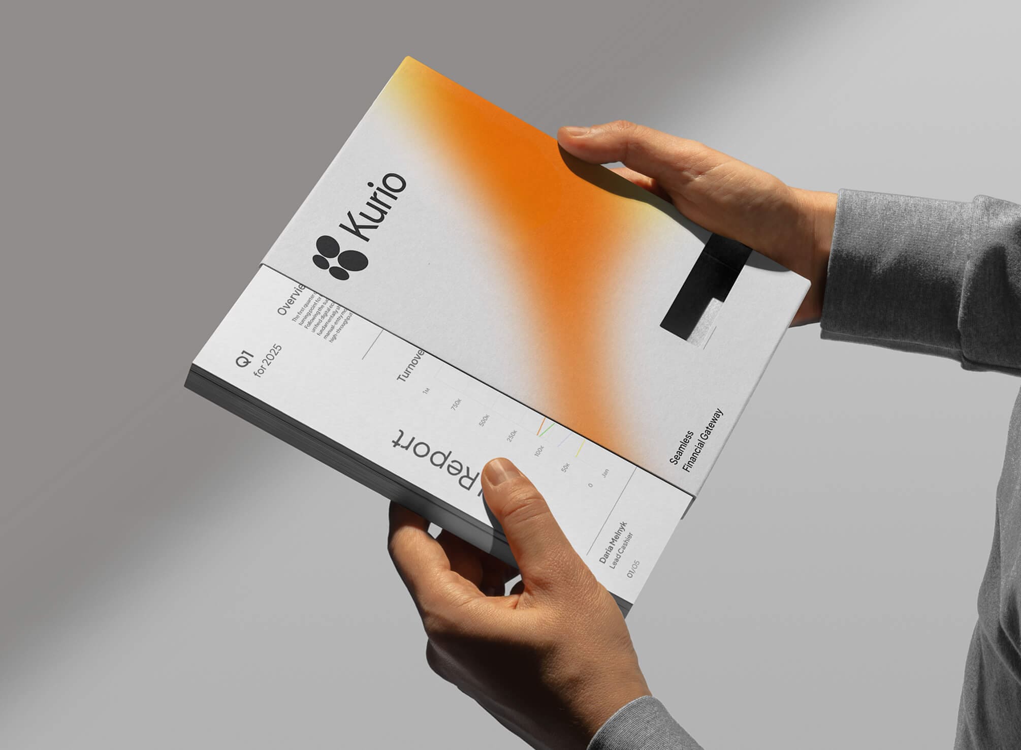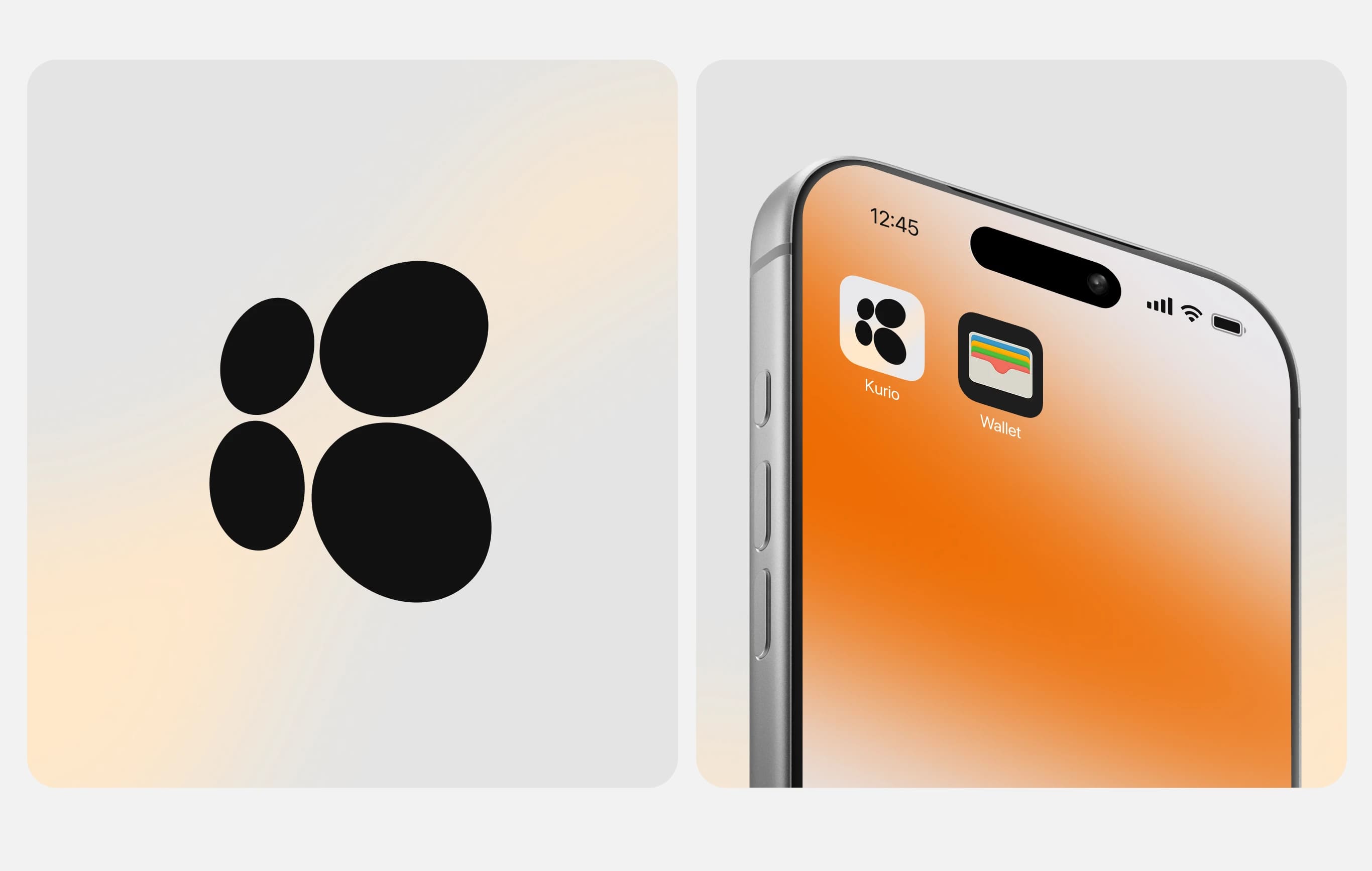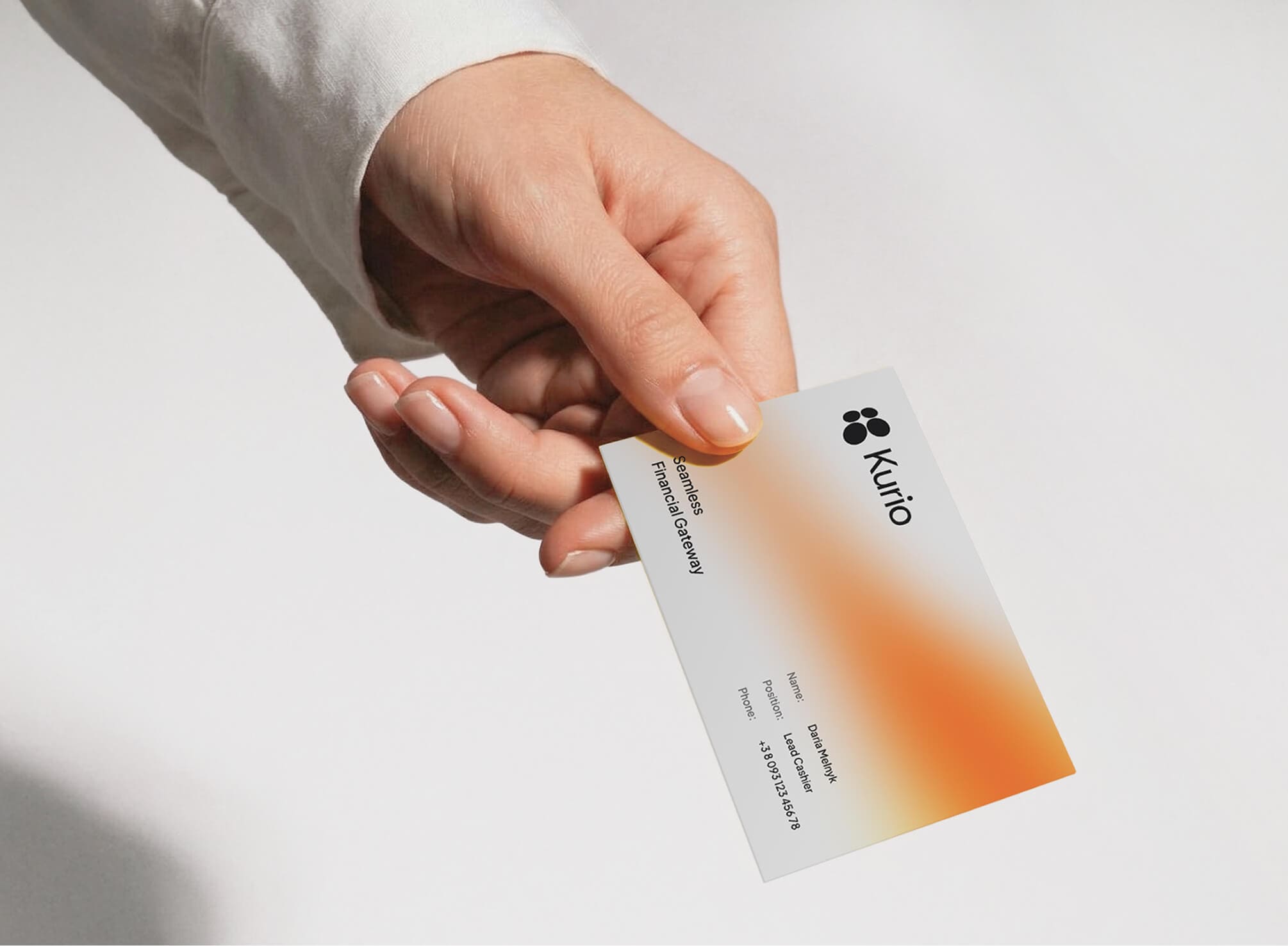 Beyond the UI/UX product design, we developed a strong visual identity anchored by the new Kurio logo. Featuring four minimalist circles arranged in an ascending perspective, the design works strategically on two levels: it serves as a modern, abstract nod to physical coins, while the upward trajectory visualizes rapid financial growth, network scalability, and technological momentum. This cohesive visual language was applied seamlessly across every physical and digital touchpoint, from modern staff business cards to the software interfaces.