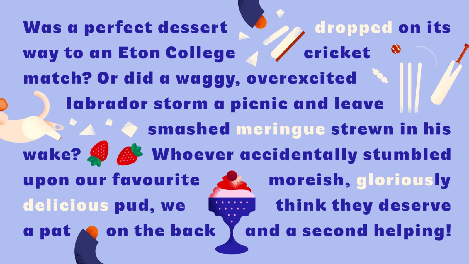 Some say that one fine day a meringue dessert was being oh-so-carefully carried to an Eton College cricket match… when it was accidentally dropped. Or perhaps it was a playful pooch careering into a pavlova?