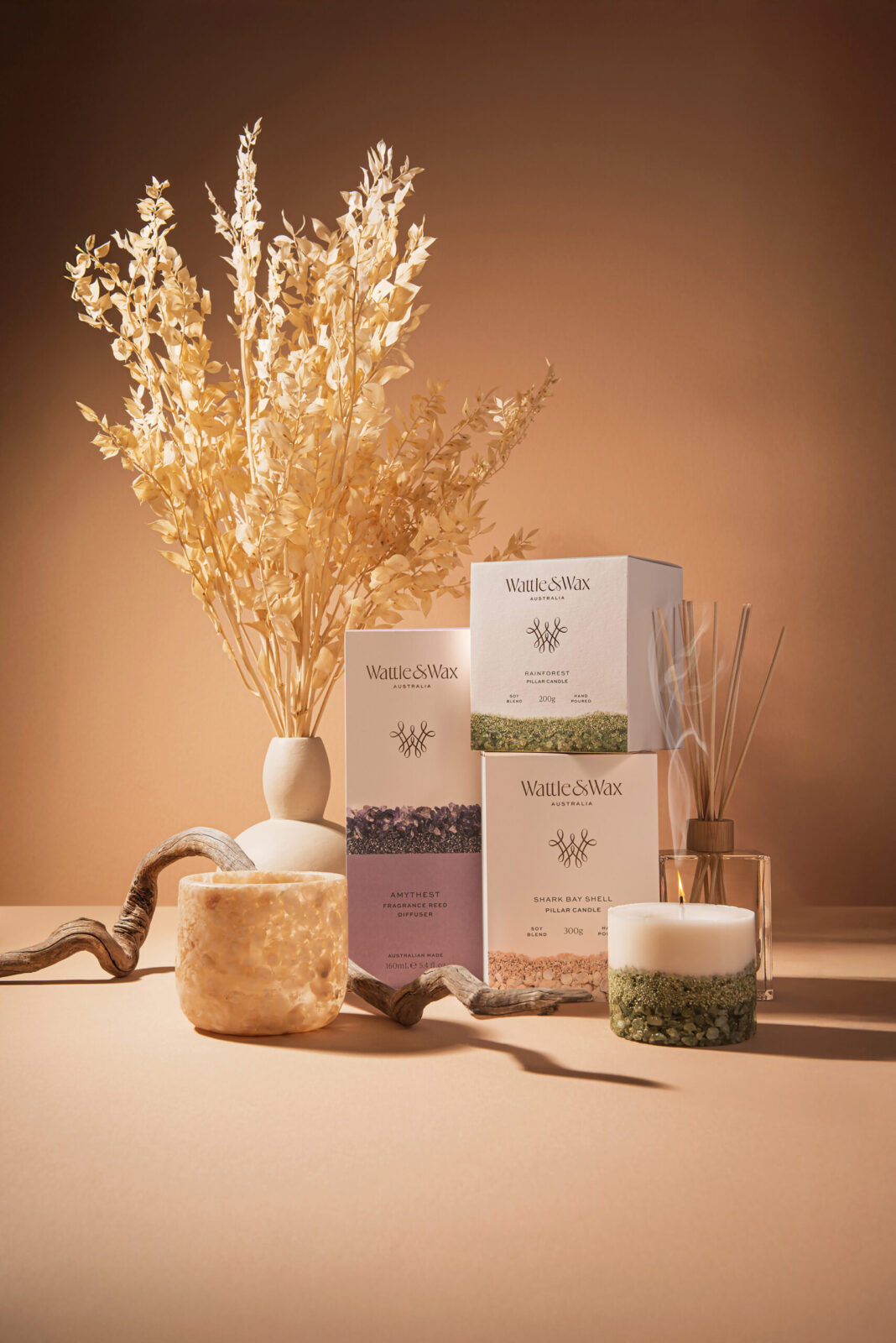 Custom product photography completed the rebrand. The new imagery capturing each piece artistically and celebrating its connection to nature. Through thoughtful design and attention to detail, Wattle & Wax is ready to expand nationally.