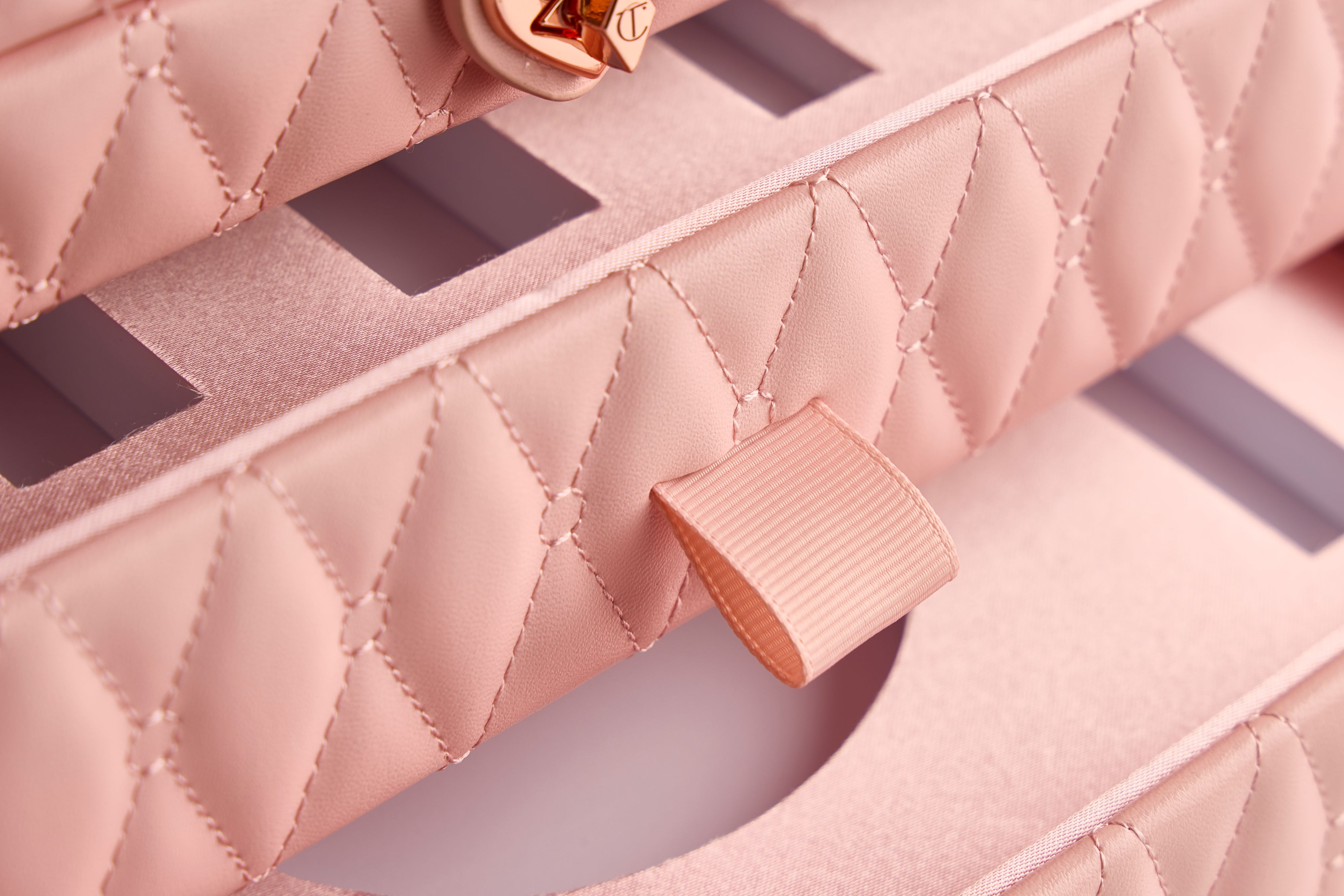 This was achieved by developing a vanity case with a classic Art Deco style structure – complete with an integrated mirror fixed to the underside of the lid – that was covered in an all-over quilted PU leather material, featuring the bespoke Pillow Talk signature diamond design, and coloured in a delicate nude-pink hue. In addition to reflecting the colours of the makeup products contained in the set, this colour also captured a subtly fashionable appearance that can be incorporated into a wide variety of décor styles if used as a display case.