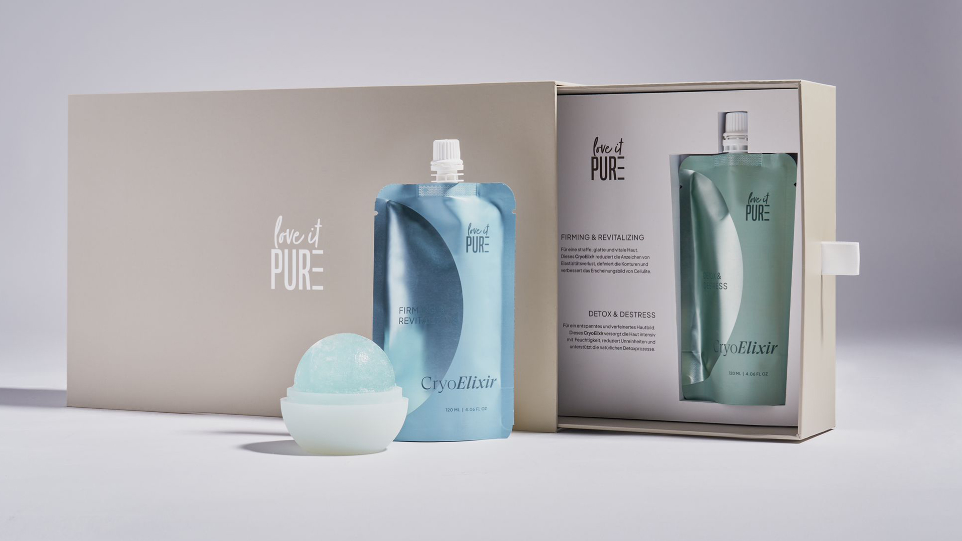 As part of the product’s redesign, a sophisticated packaging concept was developed that emphasizes both the product’s premium character and its sustainable approach. By using spout bags, the elixir can be poured directly into a reusable silicone mold, enabling more environmentally responsible disposal after use. The design of the spout bags — particularly the color scheme and finishing — reflects the essence of the cryo elixirs. The contrast between the matte background and the metallic circle visually captures the themes of cold and frost, aligning with the product’s intended use as a frozen ice ball. The packaging design not only highlights the exclusive quality of the product but also enhances the sensory experience of the cooling effect, which is central to the treatment.