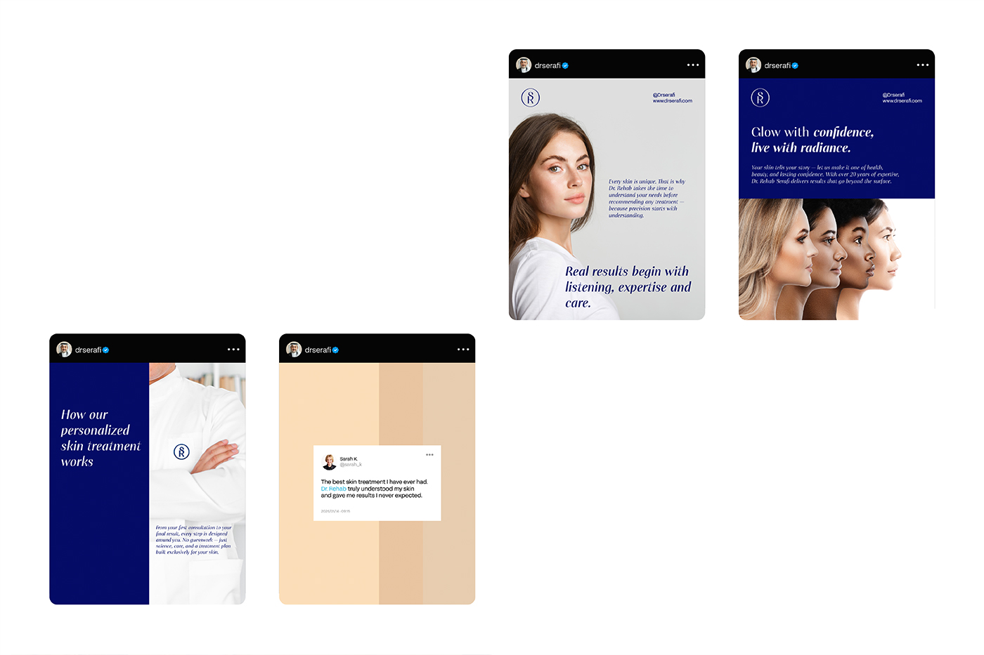 The challenge was to create a complete visual identity that captures both the medical authority and the human warmth the brand aspires to deliver. In a market saturated with overly clinical or emotionally disconnected aesthetic brands, Dr. Rehab Serafi needed to feel personal, refined, and trustworthy — while still communicating precision, expertise, and over 20 years of professional excellence.