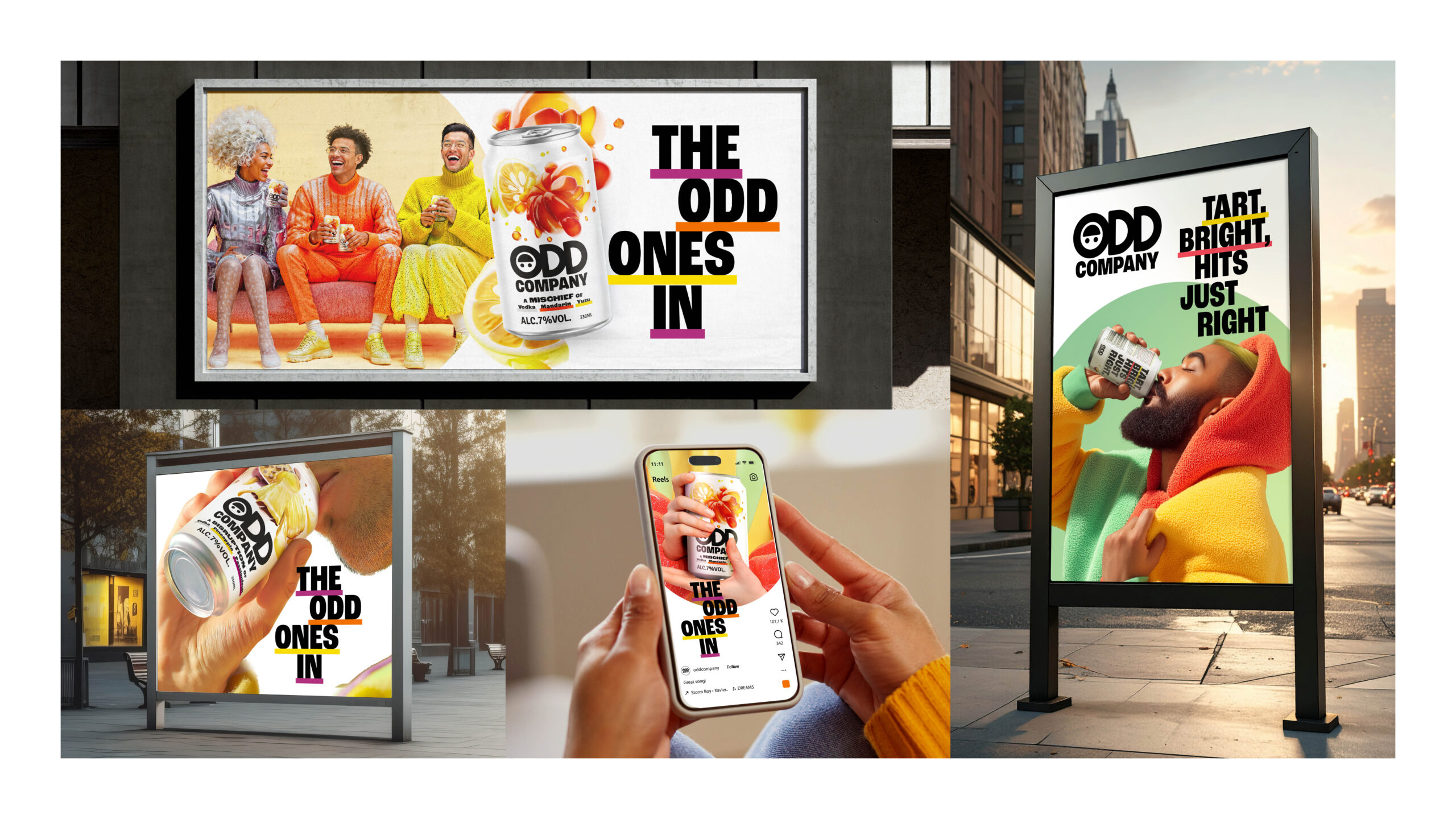 From the outset, we aligned on the core elements of the visual identity system. The Oddganism illustrations would be the hero, supported by a bold black-and-white type-driven system to help them stand out. A flavour-led secondary palette added playful pops of colour to underline key bits of information.