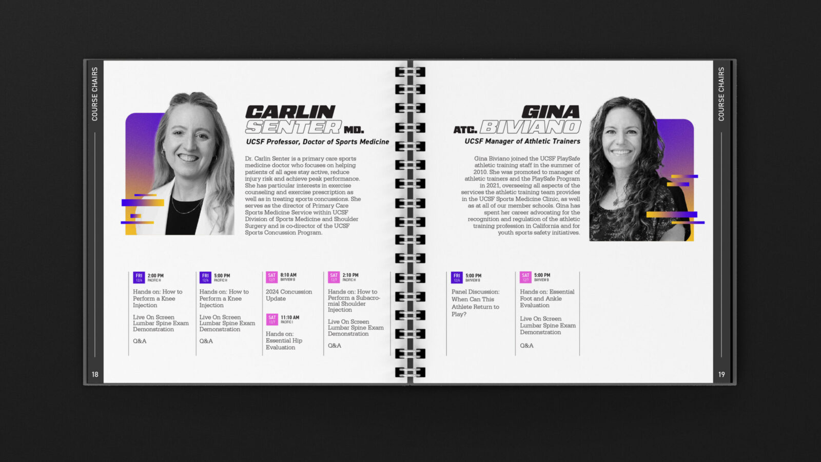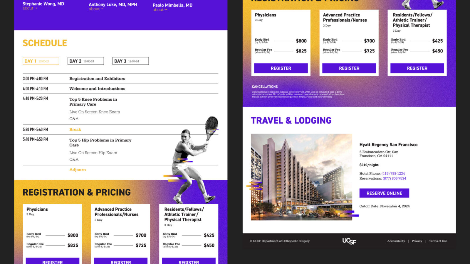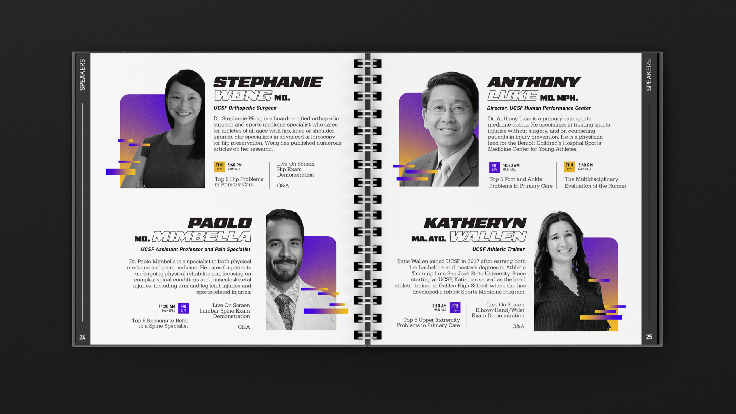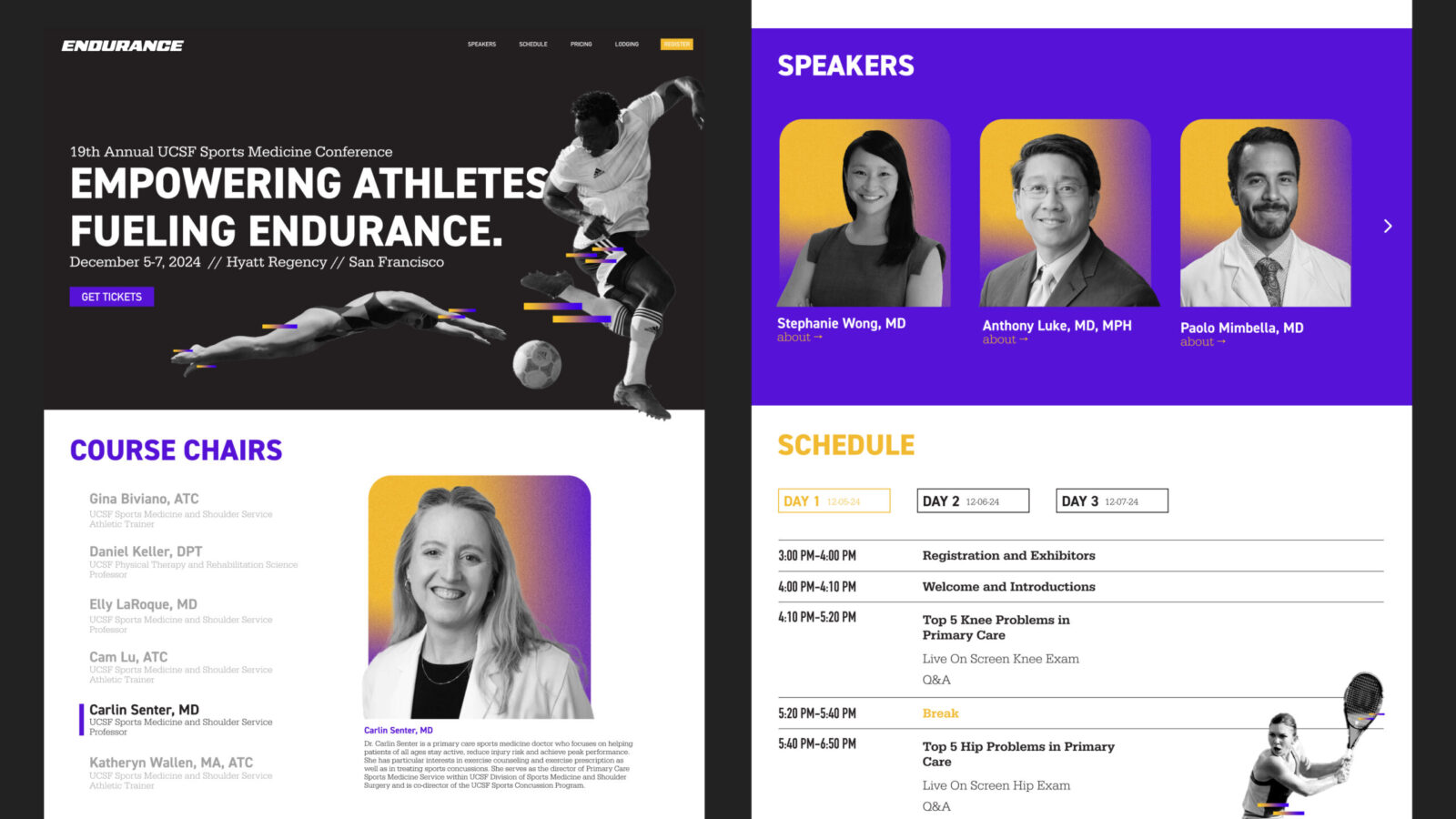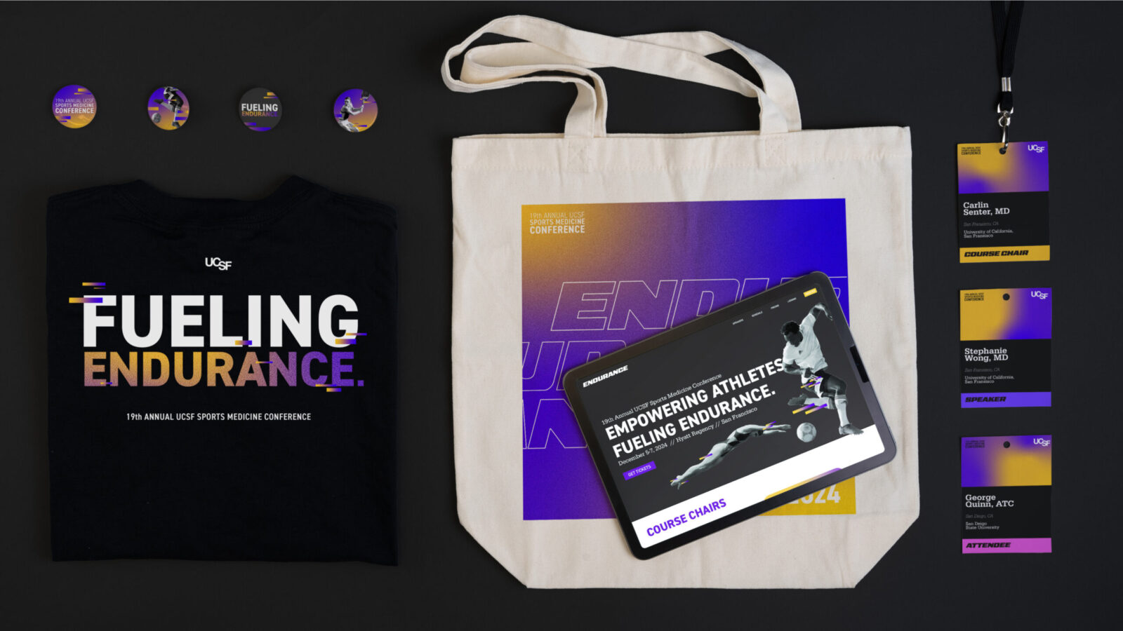 The UCSF Sports Medicine Conference is an annual gathering designed to provide head-to-toe clinical training, research insights, and field updates to sports-medicine professionals across disciplines. This is a conceptual project in which, for its 19th year, the conference adopted the theme “Endurance.” With this theme as a foundation, the conference required a refreshed visual identity that felt energetic, contemporary, and adaptable across both digital and physical materials.