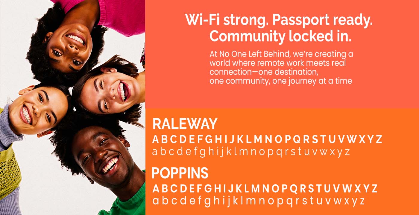 No One Left Behind is a purpose-driven brand identity for a global community of digital nomads, designed to create belonging, connection, and empowerment in the rapidly evolving remote work landscape. The platform envisions a space where no member is overlooked, fostering equity and shared growth across borders.