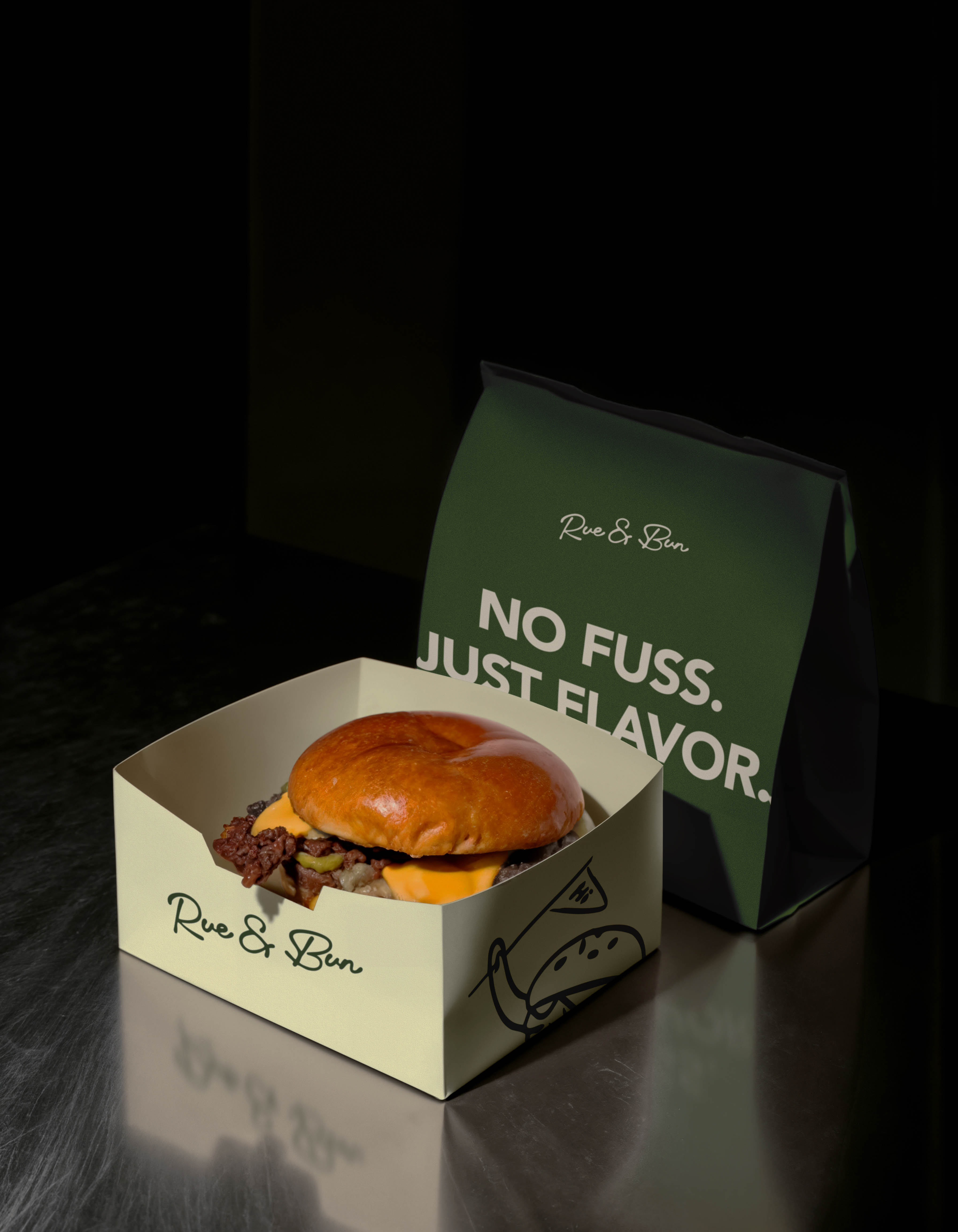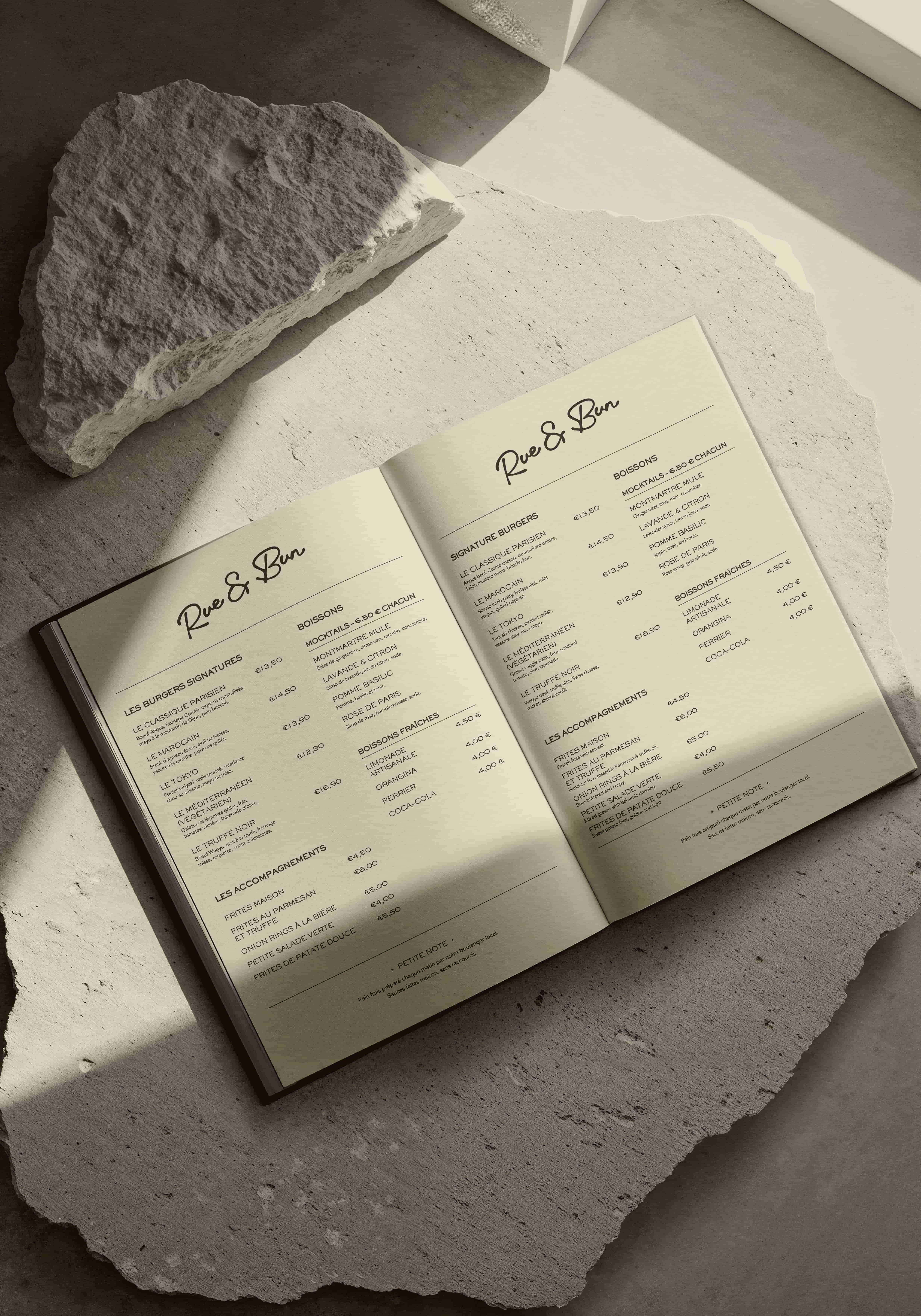Packaging and print materials follow the same understated aesthetic. Whether it’s a takeaway bag, a folded menu, or a small café standee, every touchpoint is designed to be photographed, shared, and remembered — not because it’s loud, but because it’s beautifully composed. Rue & Bun becomes an experience in itself, where design and flavor intertwine to create something quietly iconic.
