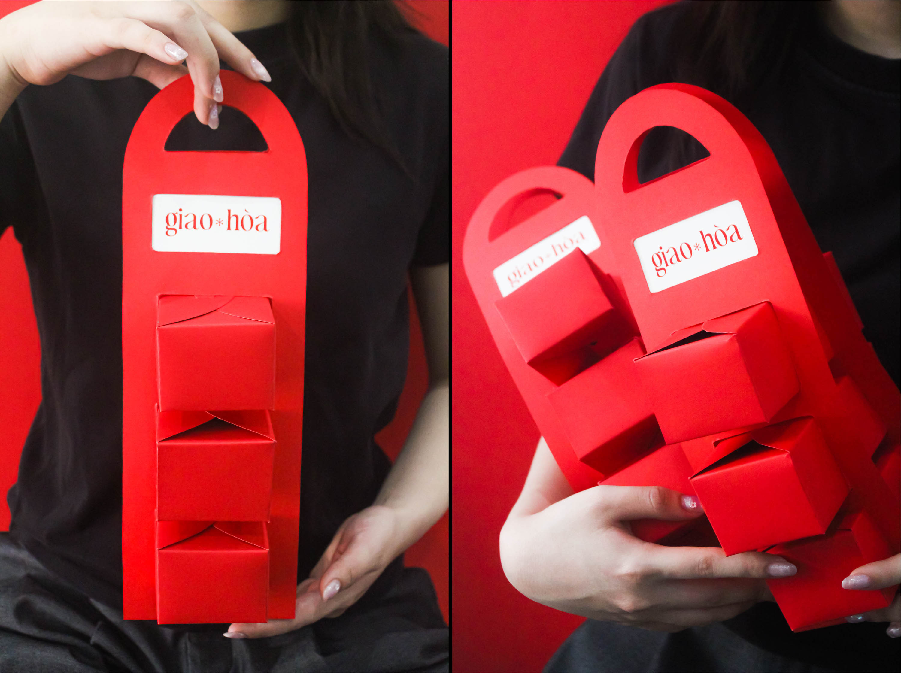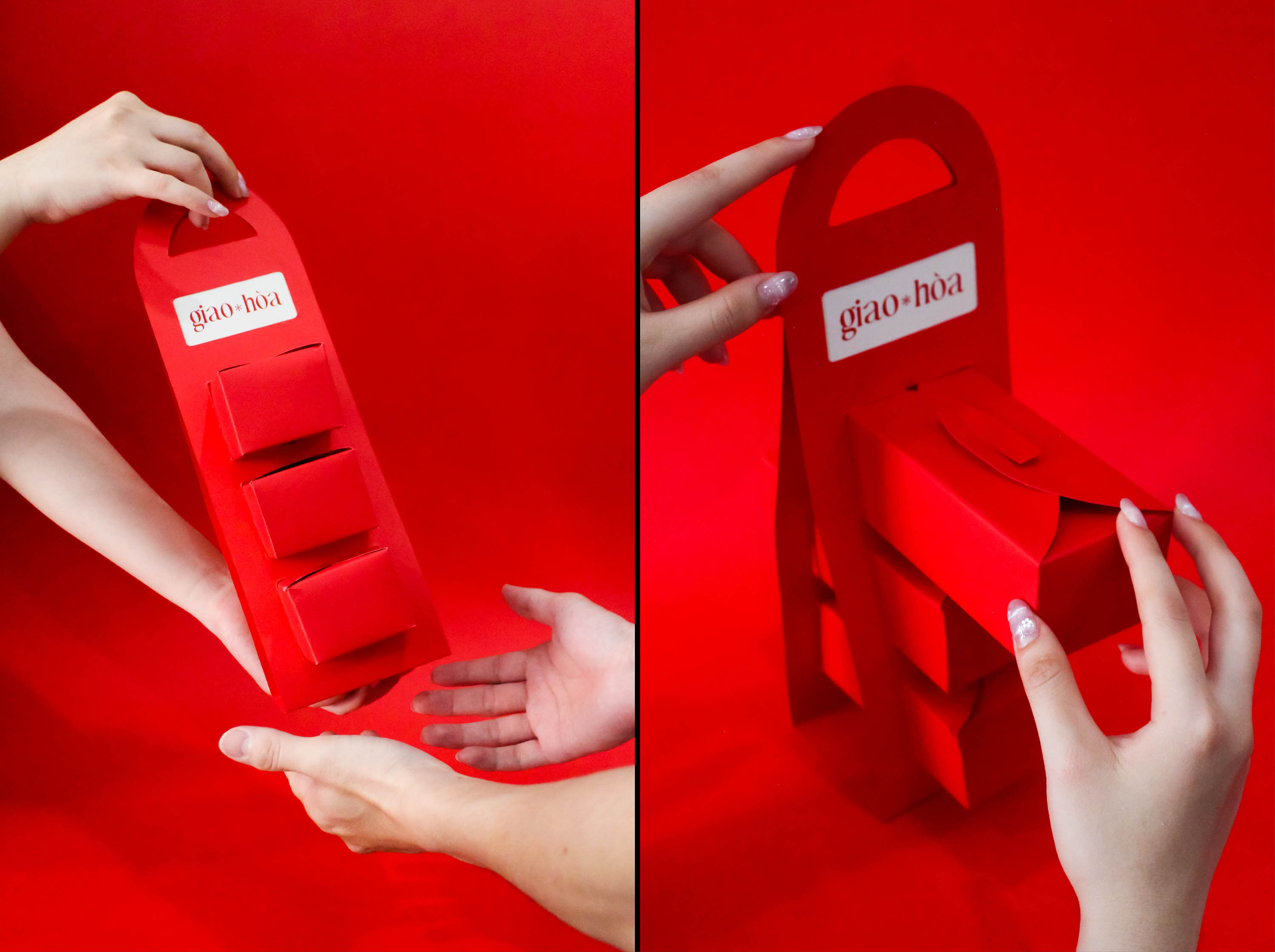 The highlight of Giao Hoa packaging lies in its unique interlocking lid structure. The two flaps weave together, evoking the image of hands firmly clasped—a symbol of enduring family bonds and the warm connections shared during the Lunar New Year.