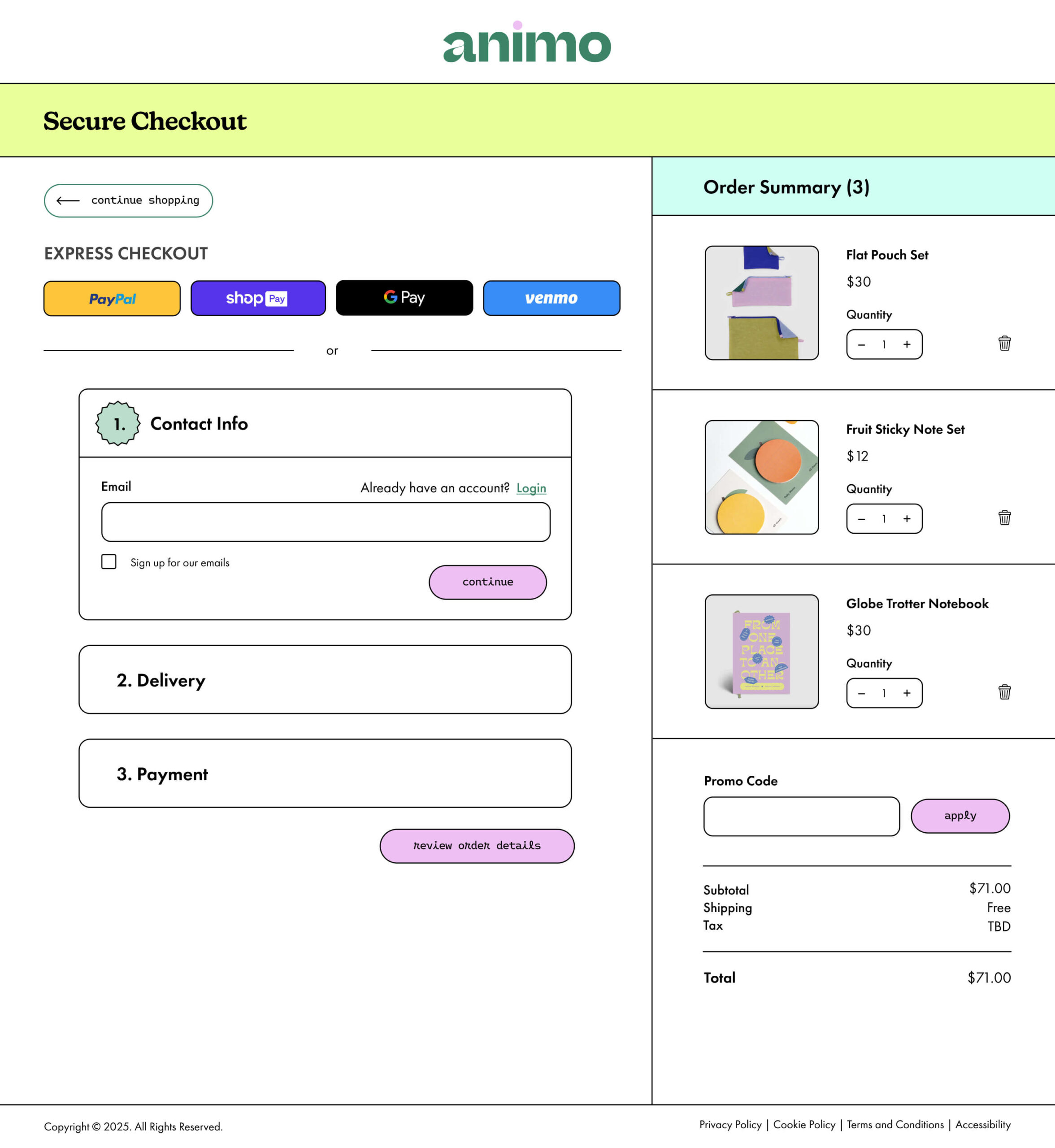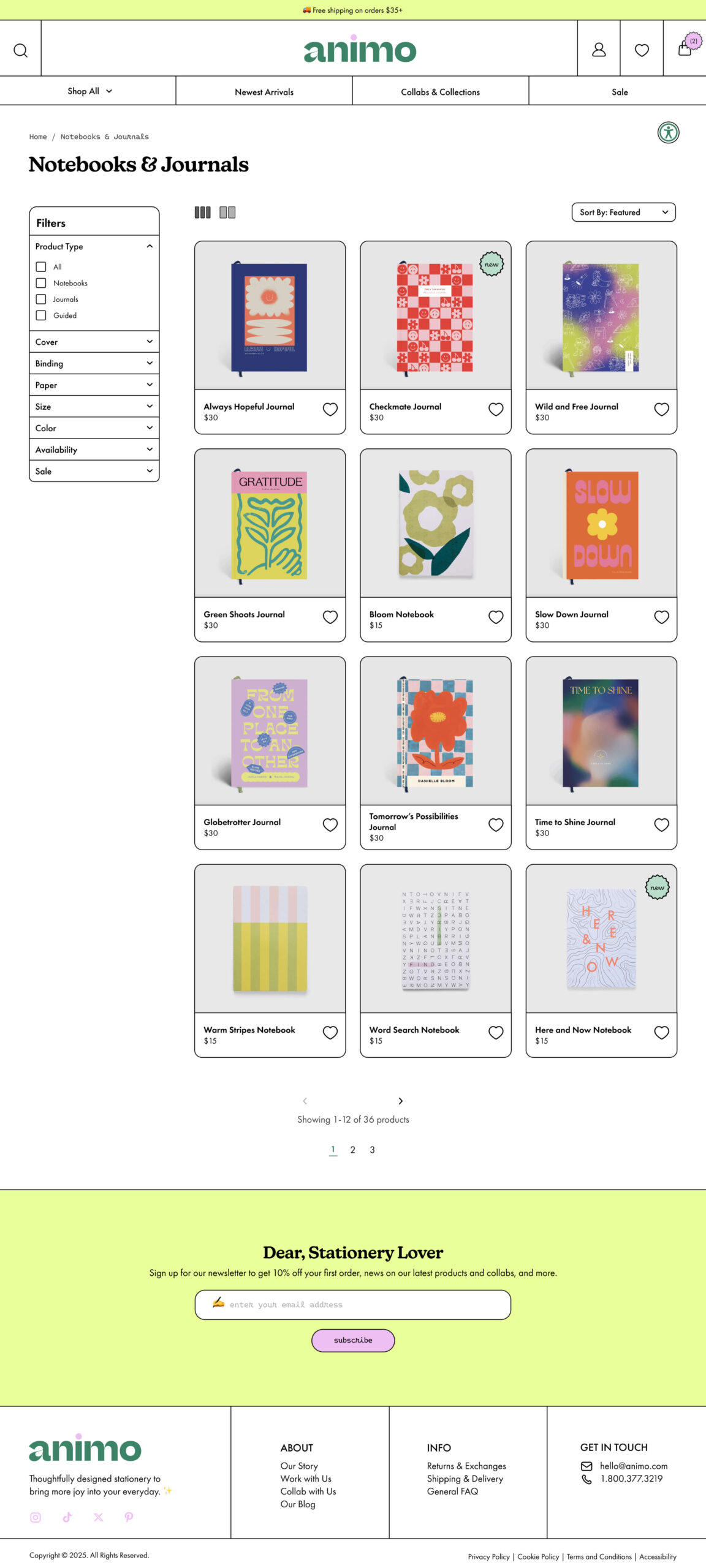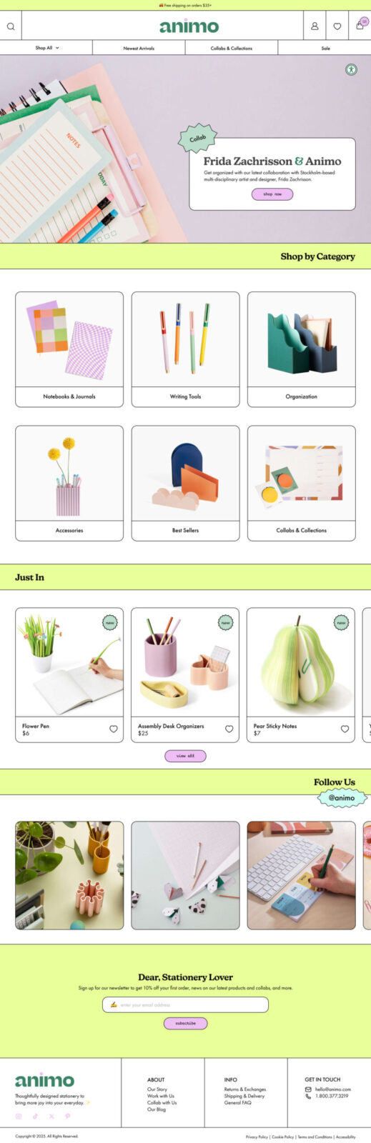 Animo is a stationery brand designed to spark joy and creativity in everyday life. It serves individuals who value self-expression, curated aesthetics, and products that support organization, planning, writing, and creative hobbies. The goal of designing the Animo e-commerce website was to translate the charm and delight of its physical products into a digital experience that feels playful, intuitive, and user-centered.
