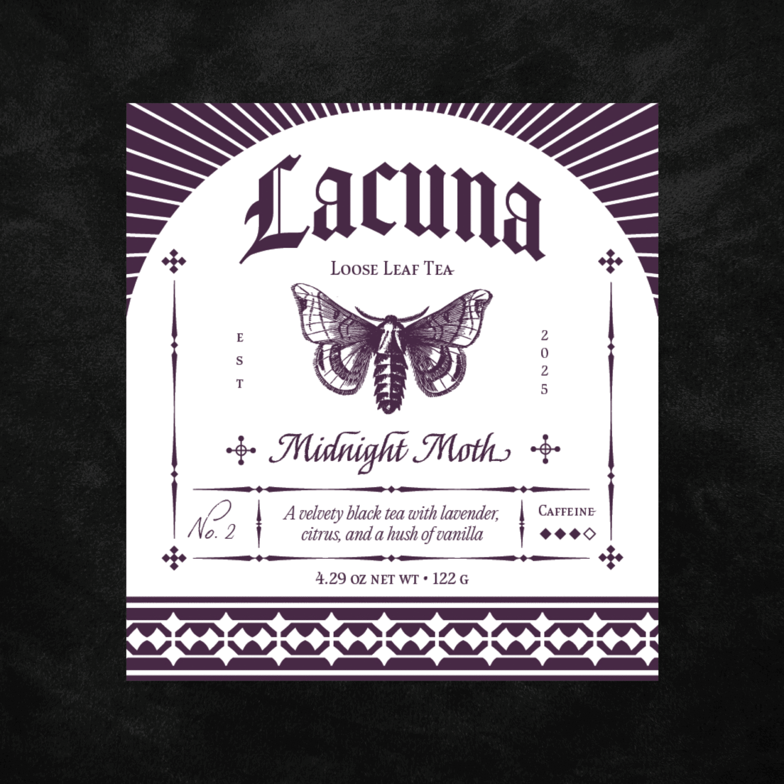 Central to Lacuna’s identity is a motif system combining vintage illustrations of a moth, snake, and swan with abstract glyphs that reinterpret each animal symbolically. Tombstone-shaped labels reference gothic architecture, and refined textures on the label add tactility while highlighting the brand’s premium quality. A repeating pattern at the bottom of each label, echoed on the seal, reinforces cohesion across the packaging. The color palette, black paired with deep, muted purples, reds, and greens, adds depth and understated sophistication. The typographic system blends blackletter, script, and serif typefaces to convey tea variety, a brief description, and caffeine level, harmonizing with illustrations, motifs, and the label pattern to form a unified, narrative-rich design. Together, these elements make each tea variety feel distinct while remaining part of Lacuna’s poetic, atmospheric world.