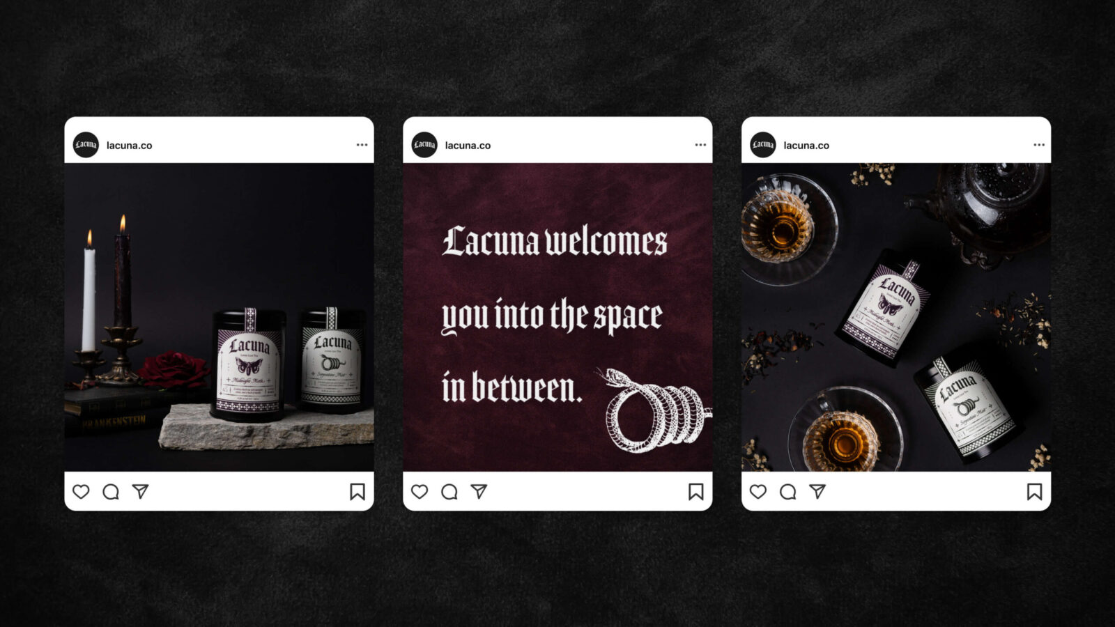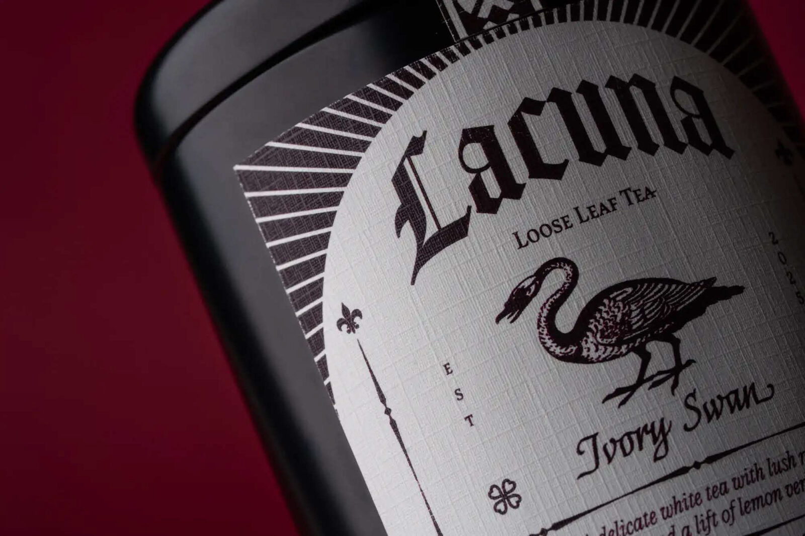 Central to Lacuna’s identity is a motif system combining vintage illustrations of a moth, snake, and swan with abstract glyphs that reinterpret each animal symbolically. Tombstone-shaped labels reference gothic architecture, and refined textures on the label add tactility while highlighting the brand’s premium quality. A repeating pattern at the bottom of each label, echoed on the seal, reinforces cohesion across the packaging. The color palette, black paired with deep, muted purples, reds, and greens, adds depth and understated sophistication. The typographic system blends blackletter, script, and serif typefaces to convey tea variety, a brief description, and caffeine level, harmonizing with illustrations, motifs, and the label pattern to form a unified, narrative-rich design. Together, these elements make each tea variety feel distinct while remaining part of Lacuna’s poetic, atmospheric world.