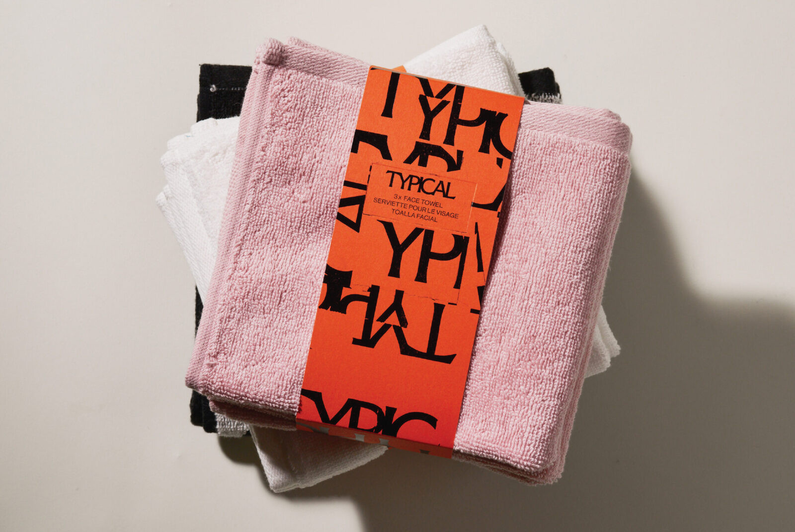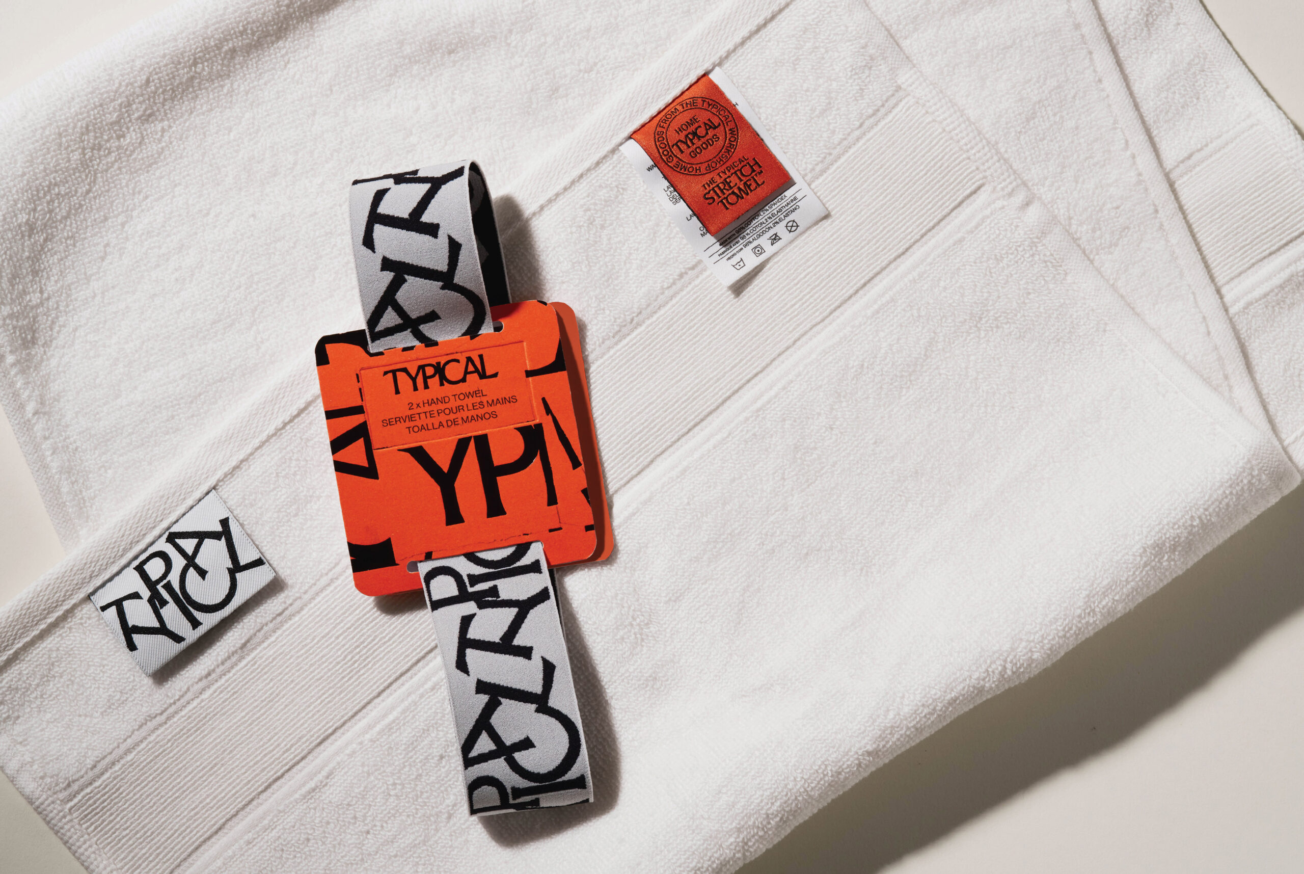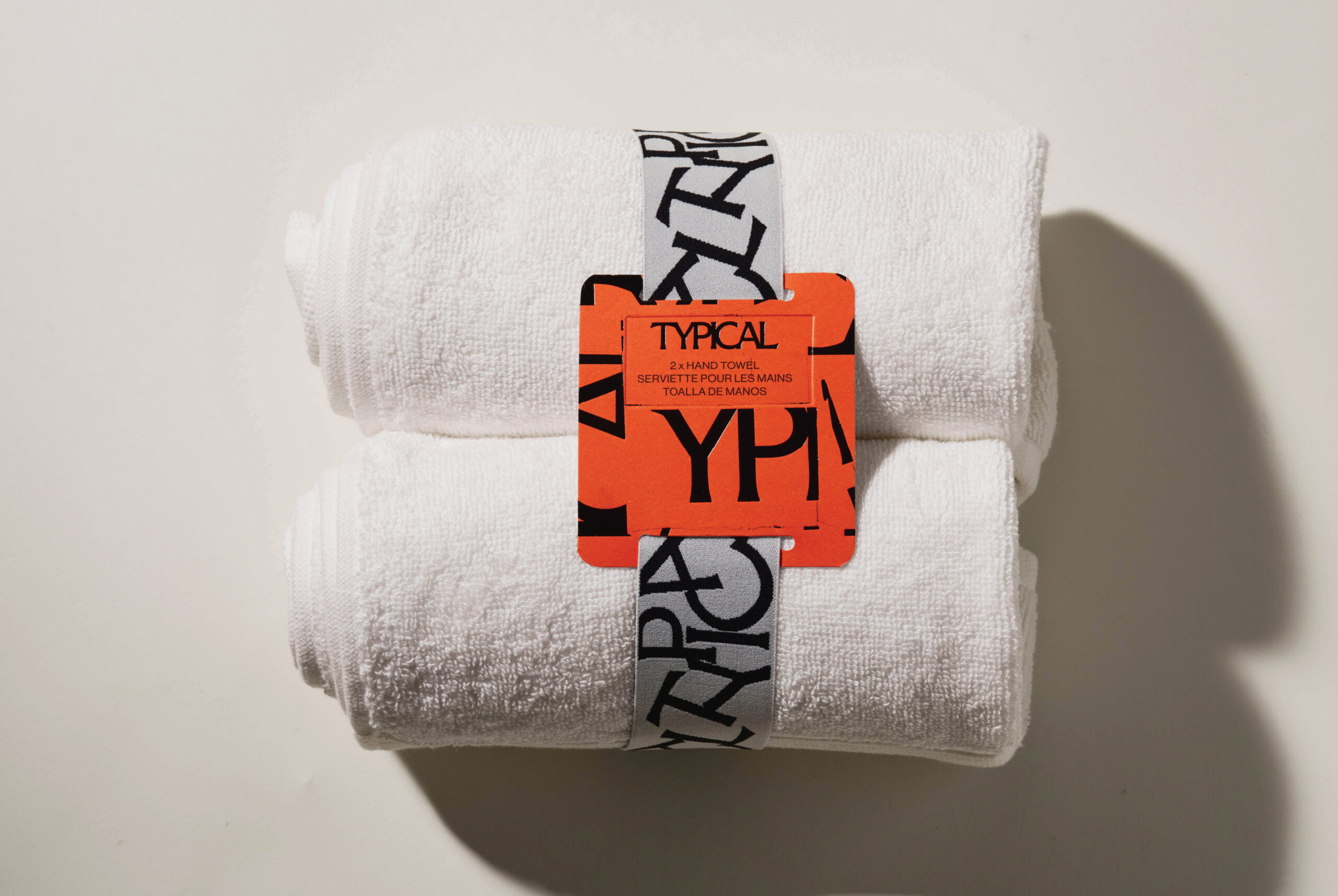 Each product is wrapped in a way that feels thoughtful and intentional. The face towels are secured with a paper band that includes a small hook attachment, designed so the towel can hang naturally in-store or at home. The hand towels are finished with a custom jacquard woven elastic band created specifically for the brand. The mosaic logo appears as a playful detail across this band, adding character without overwhelming the simplicity of the object.