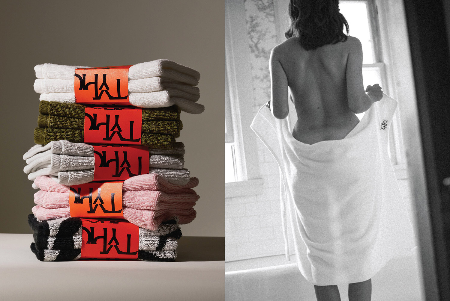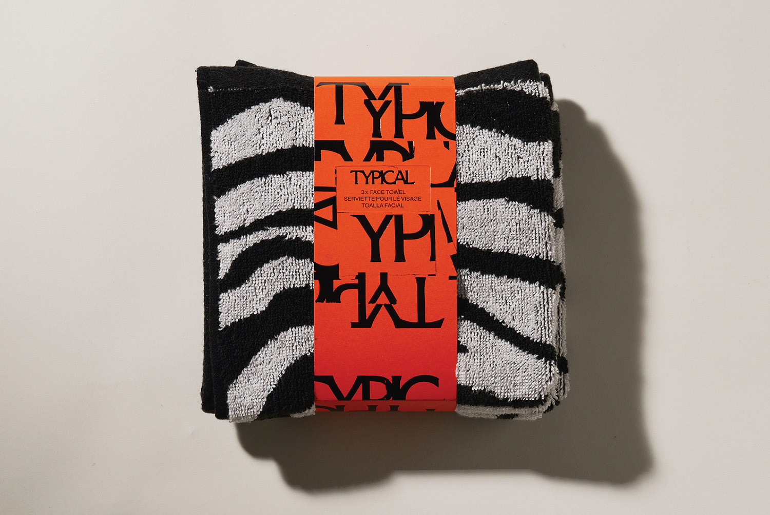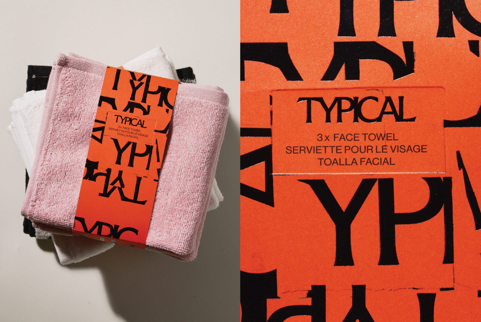 Each product is wrapped in a way that feels thoughtful and intentional. The face towels are secured with a paper band that includes a small hook attachment, designed so the towel can hang naturally in-store or at home. The hand towels are finished with a custom jacquard woven elastic band created specifically for the brand. The mosaic logo appears as a playful detail across this band, adding character without overwhelming the simplicity of the object.