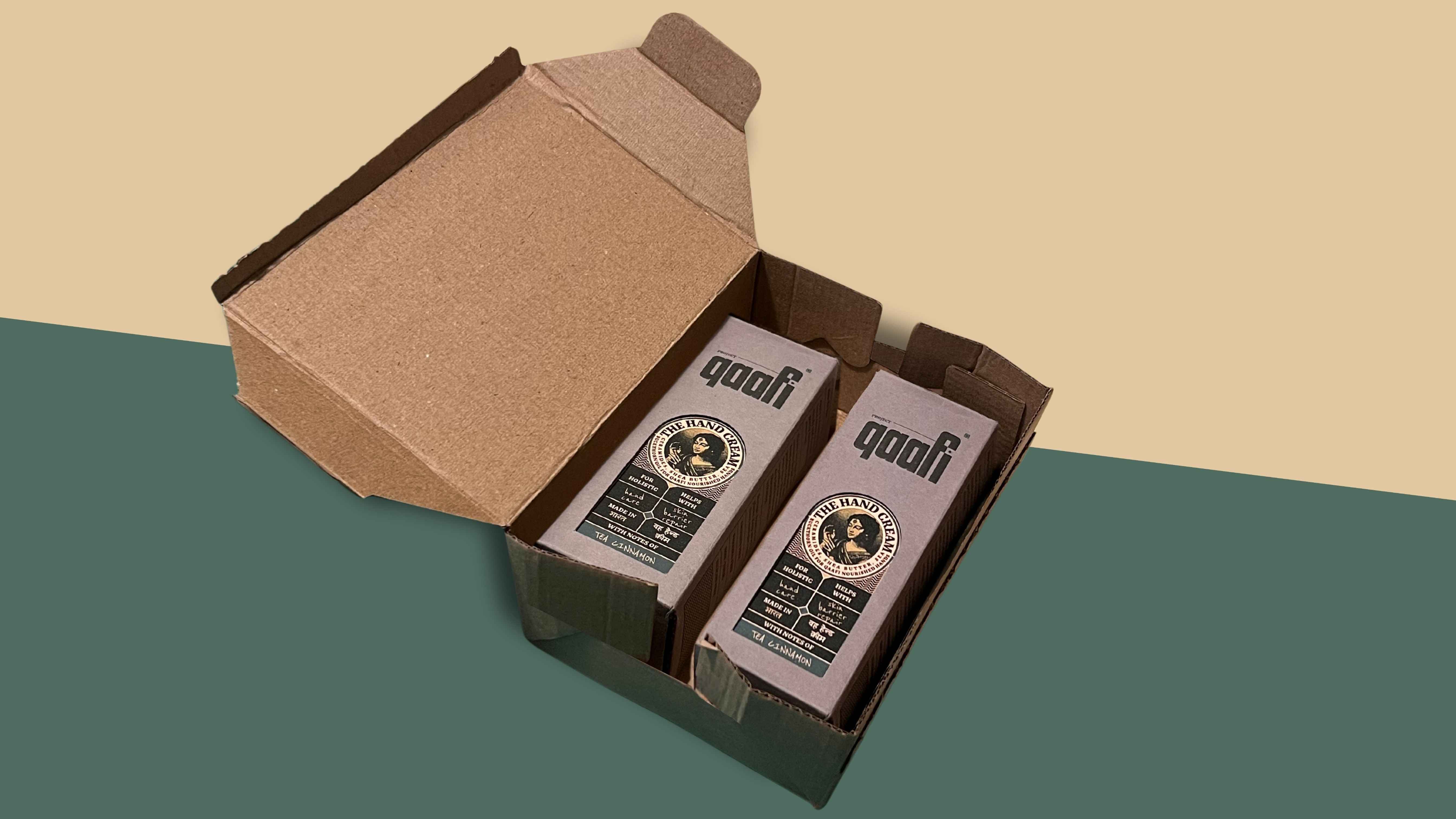 We have creatively designed a tray to fit the hand cream tube precisely which avoids contact of the tube with the surface thus offering excellent impact protection. While doing our research, we found minute details like the ink used for printing are not earth-friendly. Our Good Ink used here makes Project Qaafi Packaging 100% sustainable.