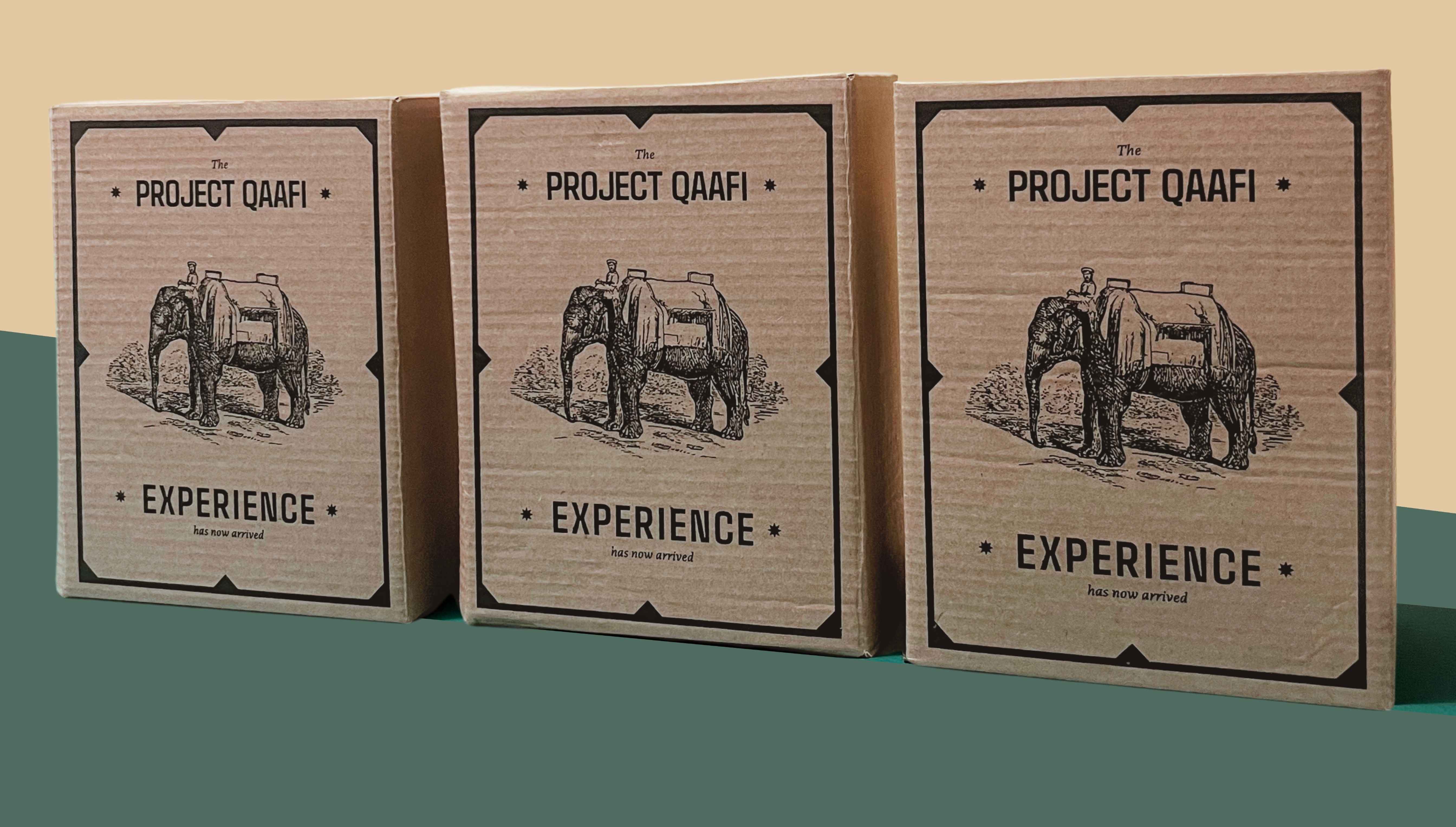 - Keywords: Project QAAFI experience box, Sustainable tape-free packaging, 100% recyclable cardboard, Natural ink product packaging, Coffee grinder illustration box, Premium Qaari product packaging, Handsome Qaari branding, Eco-conscious shipping design, Artisanal coffee box design, Cultural coffee experience packaging