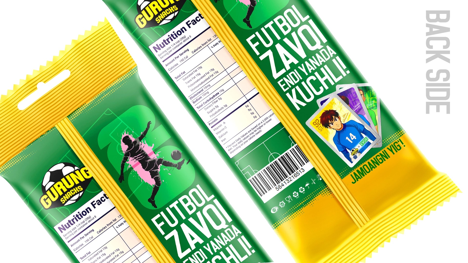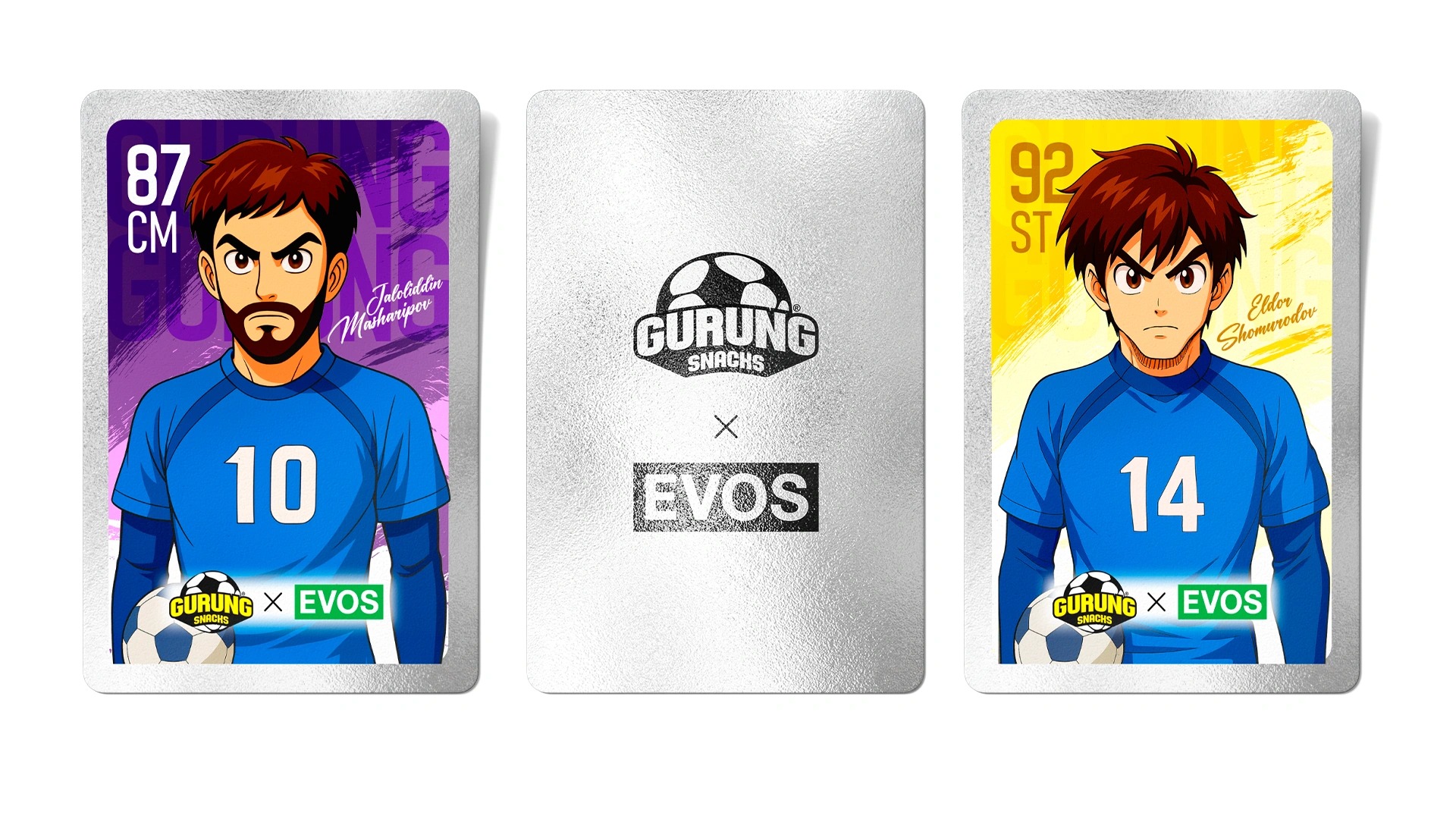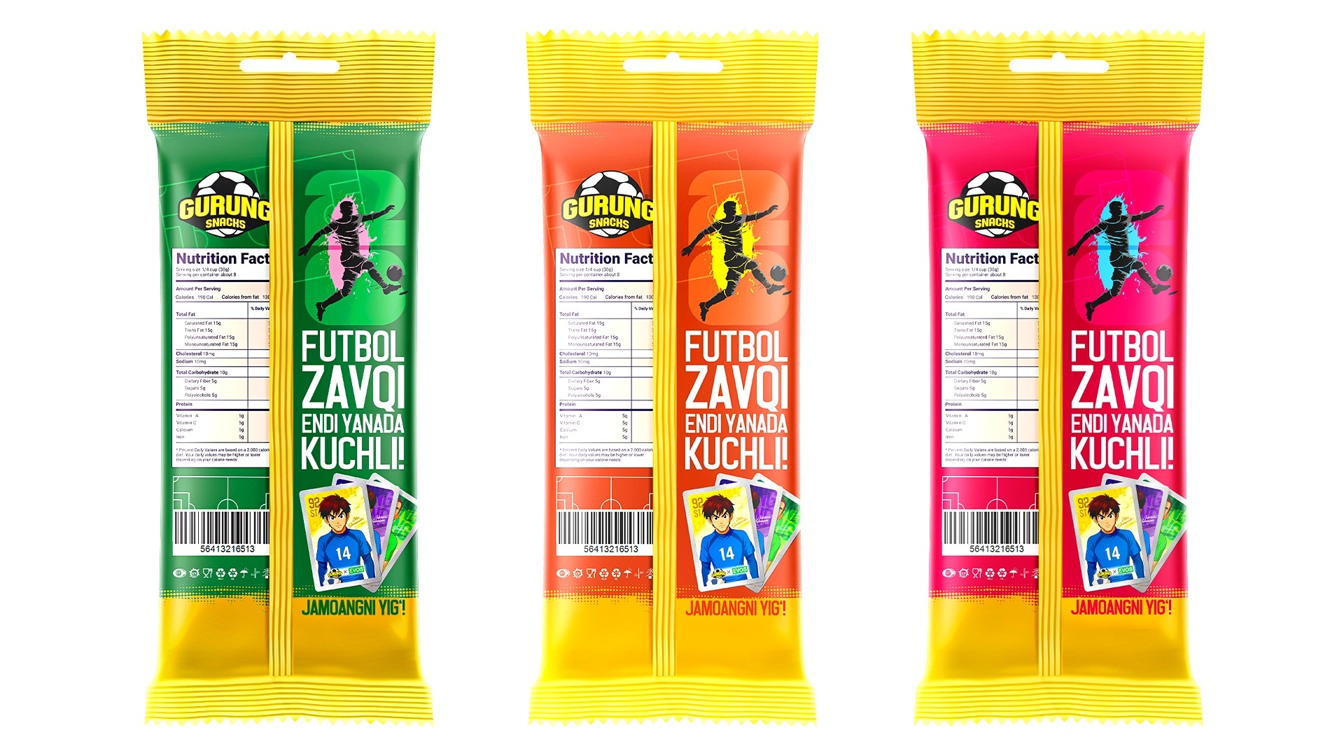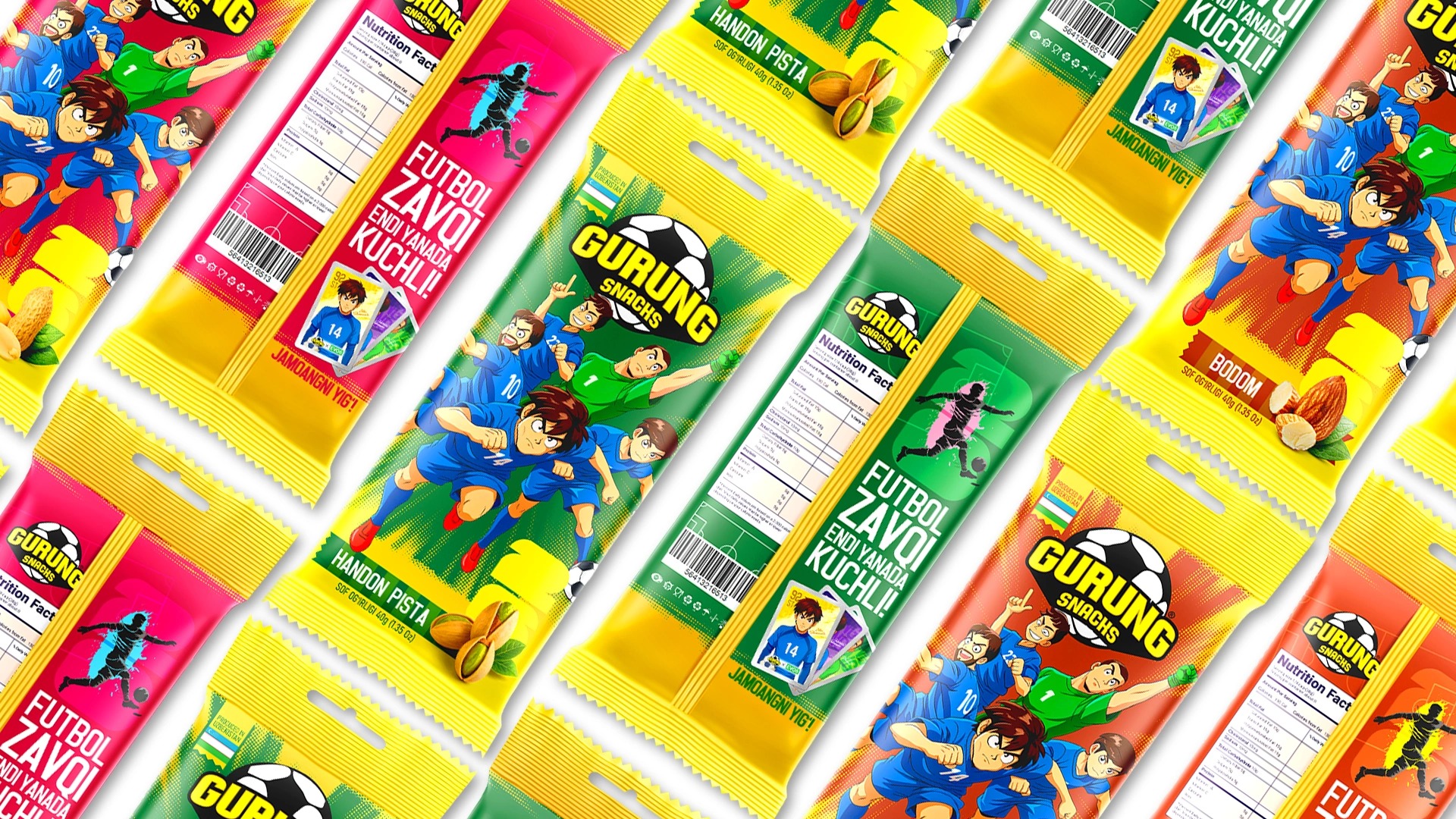 - Keywords: The Gurung Snacks brand ("taste of communication") was developed based on Uzbekistan's cultural code and football themes (World Cup 2026). Anime-style design with footballer-heroes and gamification through collectible cards stimulate repeat purchases and national pride.