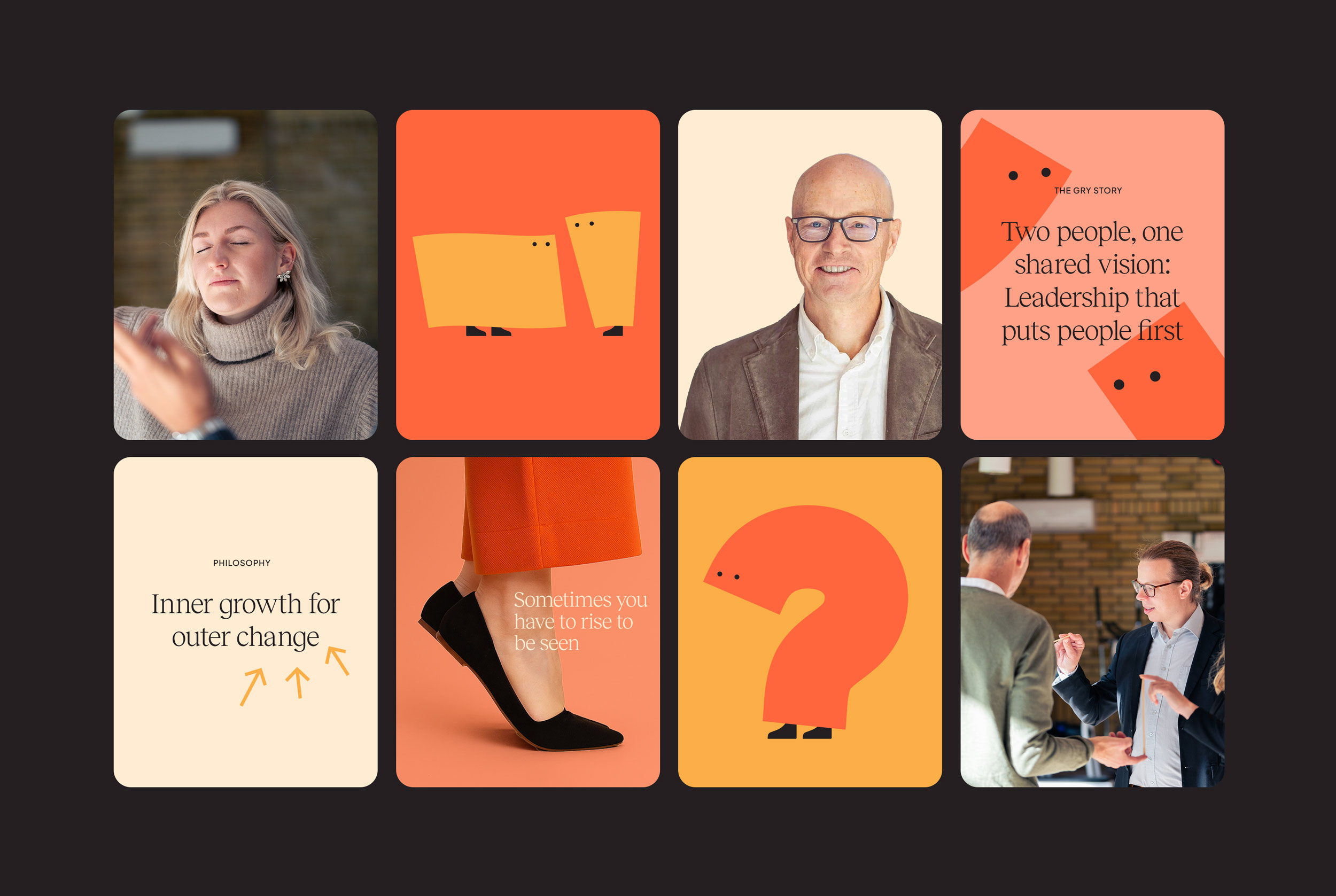 Gry, a Swedish leadership and organisational development consultancy, approached me with a clear goal: reposition the brand to reflect its deep, people-first philosophy while standing out in a largely traditional and conservative market. The brief called for a brand identity that felt warm, professional, and original capable of connecting with both individuals and organisations navigating change.