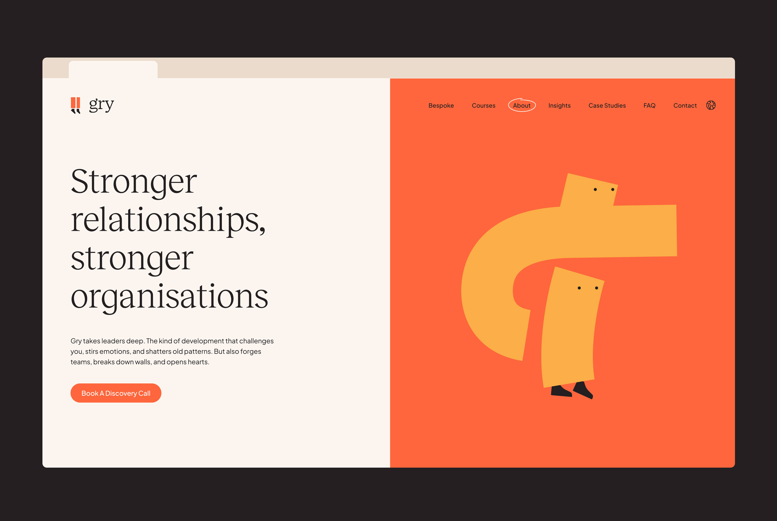 In a crowded leadership development space filled with corporate sameness and predictable visual language, Gry needed an identity that would truly express its human-centred, emotionally intelligent approach. The challenge was to create something confident yet empathetic; a brand that stands tall, puts people first, and opens doors to transformation.