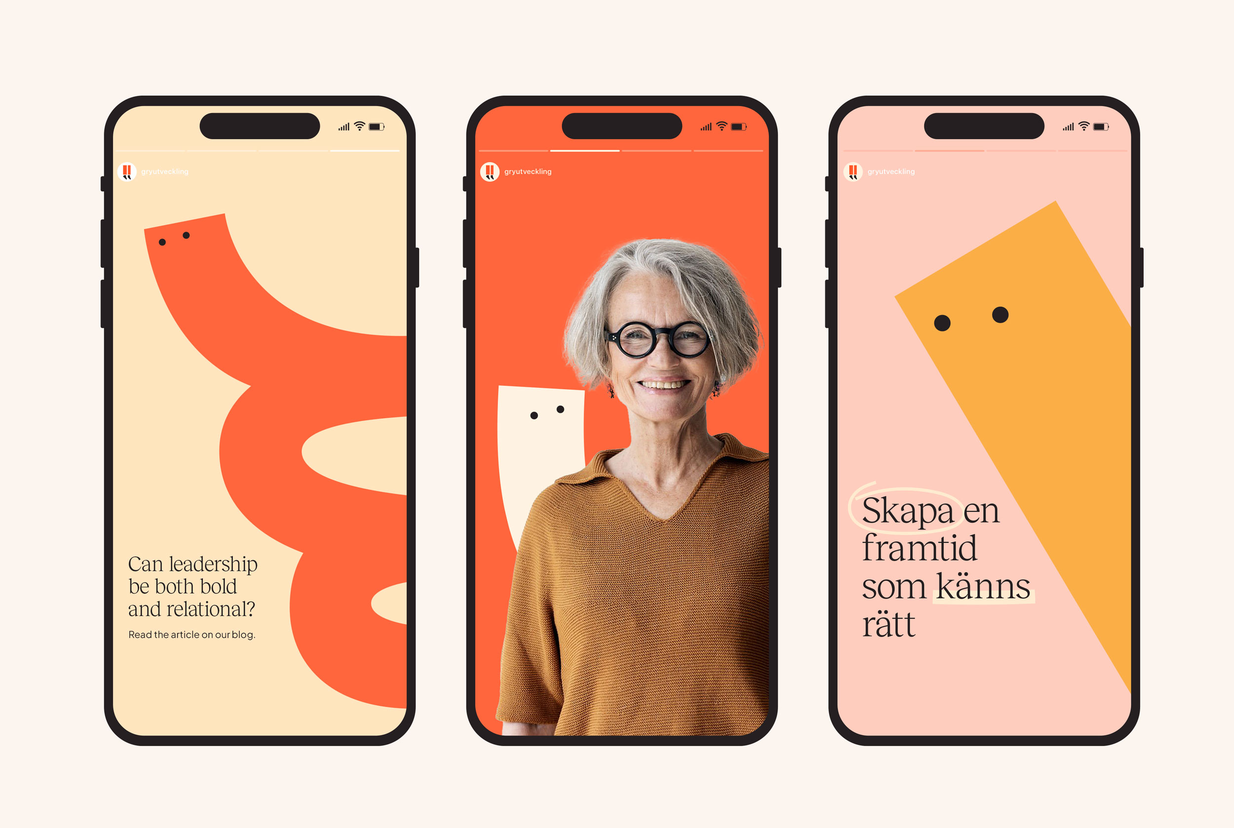 The colour palette blends approachability and originality. Orange signals creativity, movement, and action, balanced by soft neutral backgrounds and subtle pastel shades that provide a sense of calm and warmth. This direction intentionally distances the brand from the cold blues and greys typical in the Swedish category.