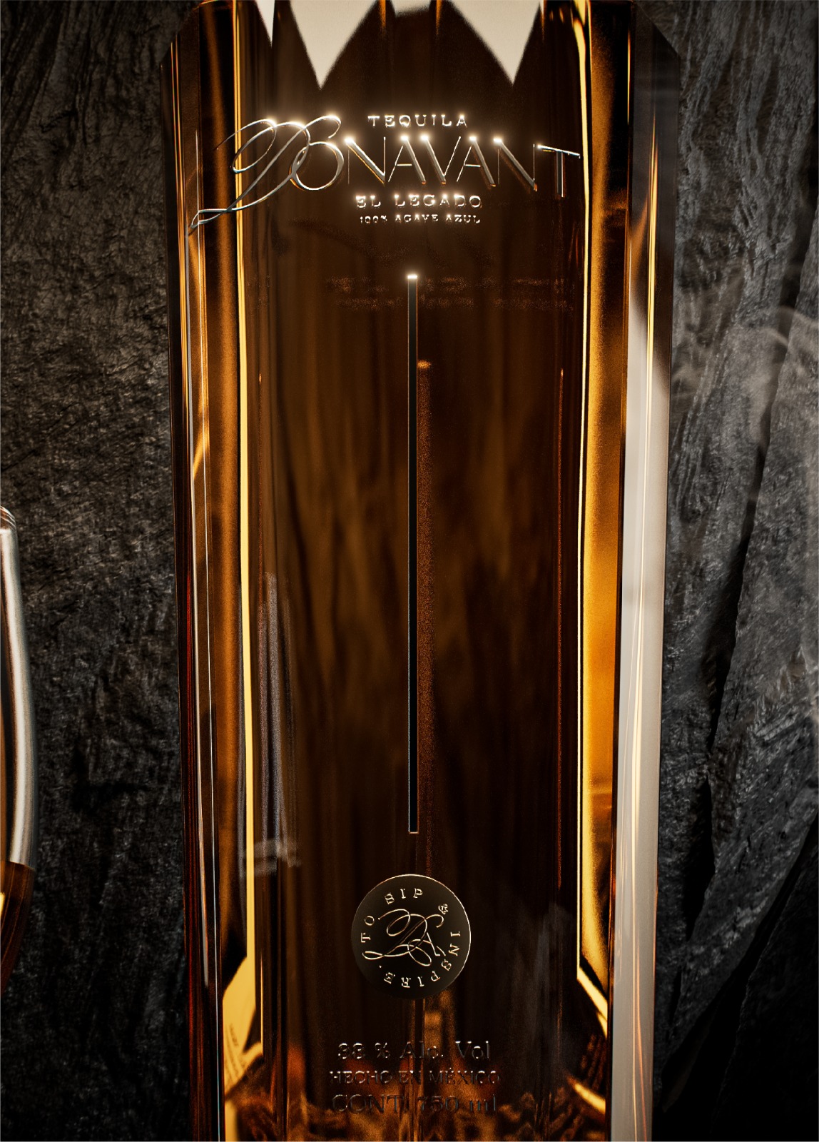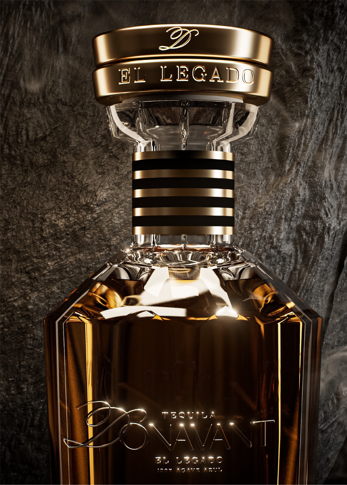 The bottle itself was conceived as a sculptural piece meant to be contemplated as much as it is used. Its vertical lines and refined proportions evoke character, stability, and permanence. Metallic accents catch the light with subtle sophistication, while the faceted base creates depth and structure. At the center, a golden axis acts as a visual spine that symbolizes legacy, precision, and mastery passed from one generation to another.