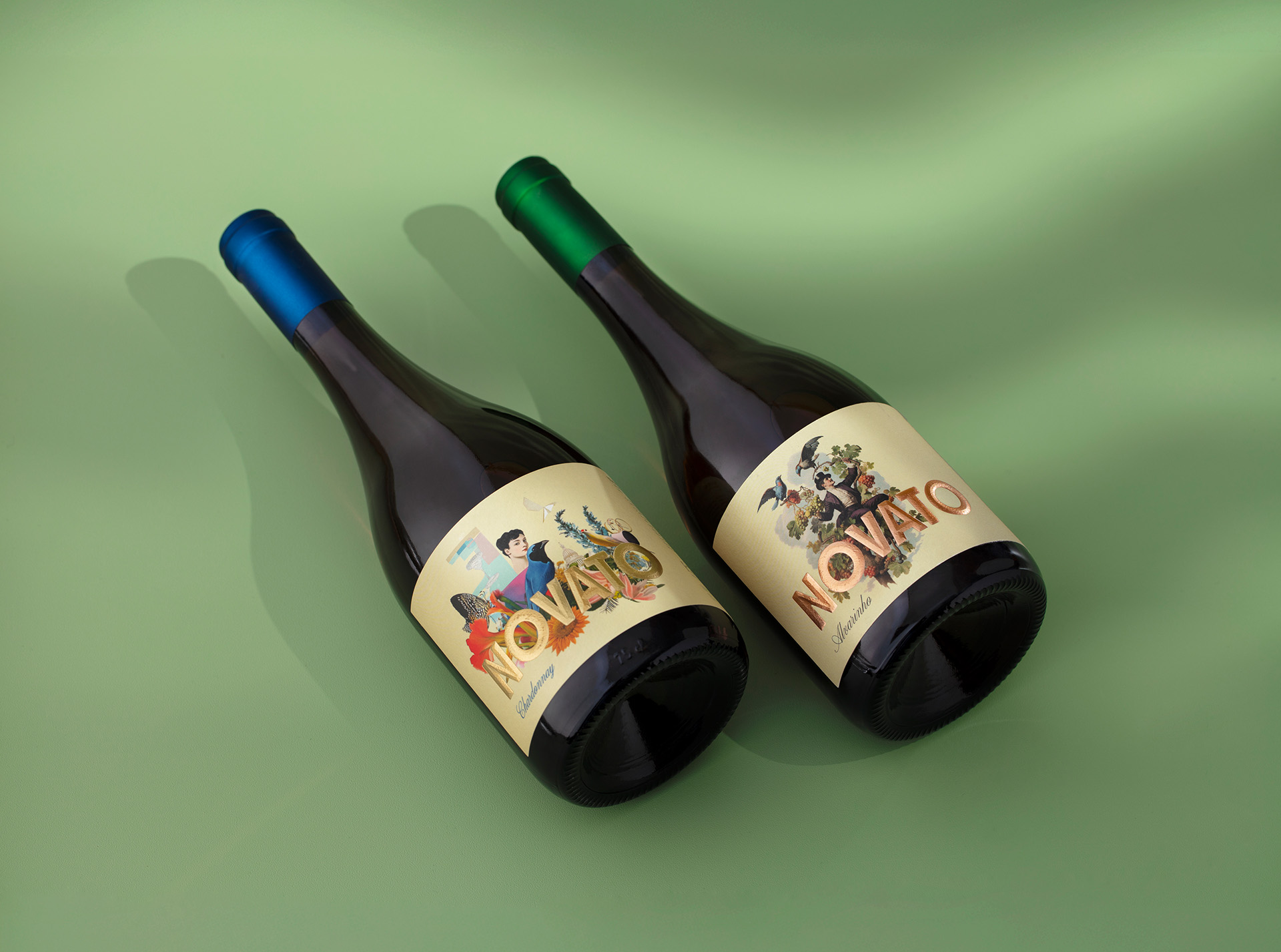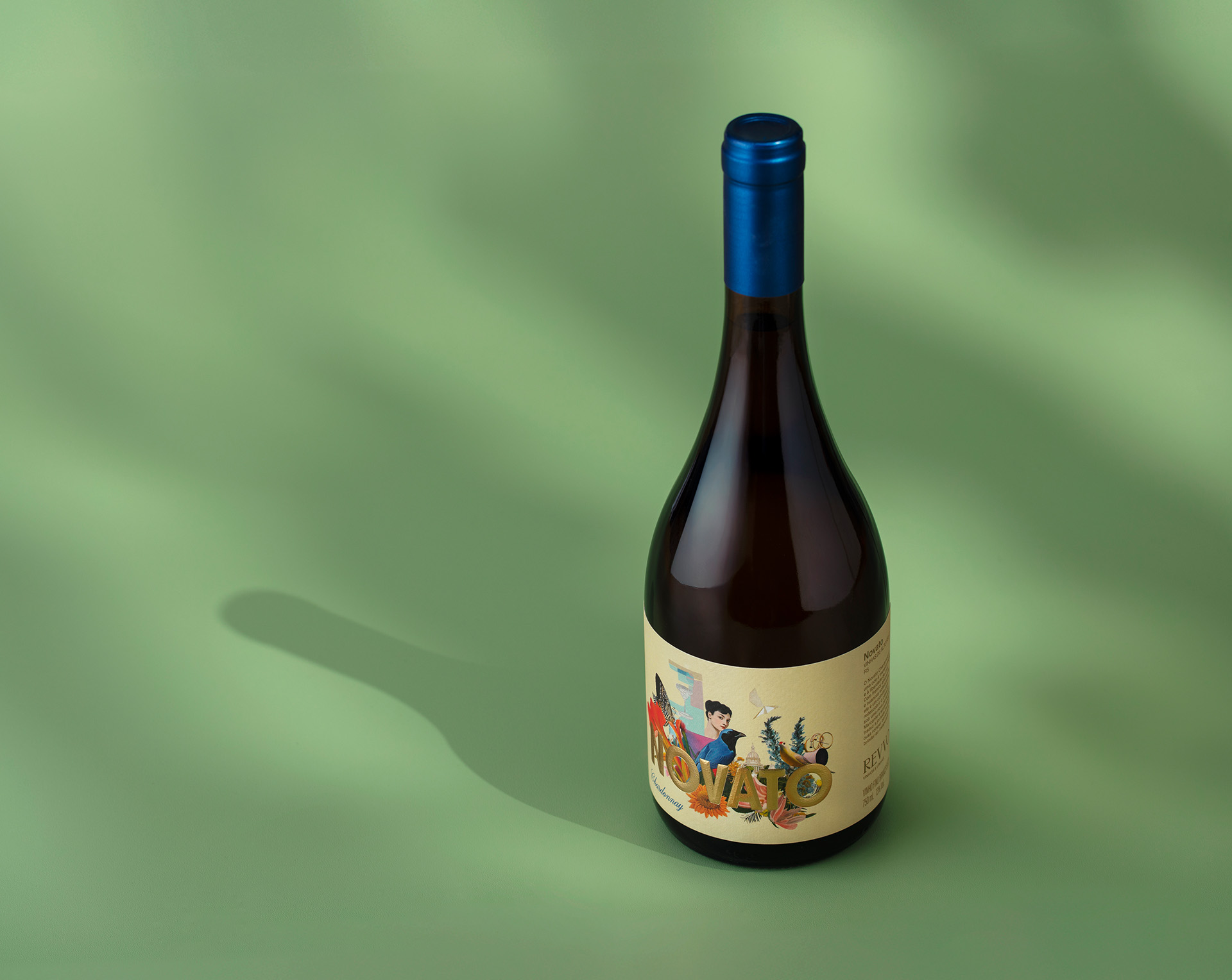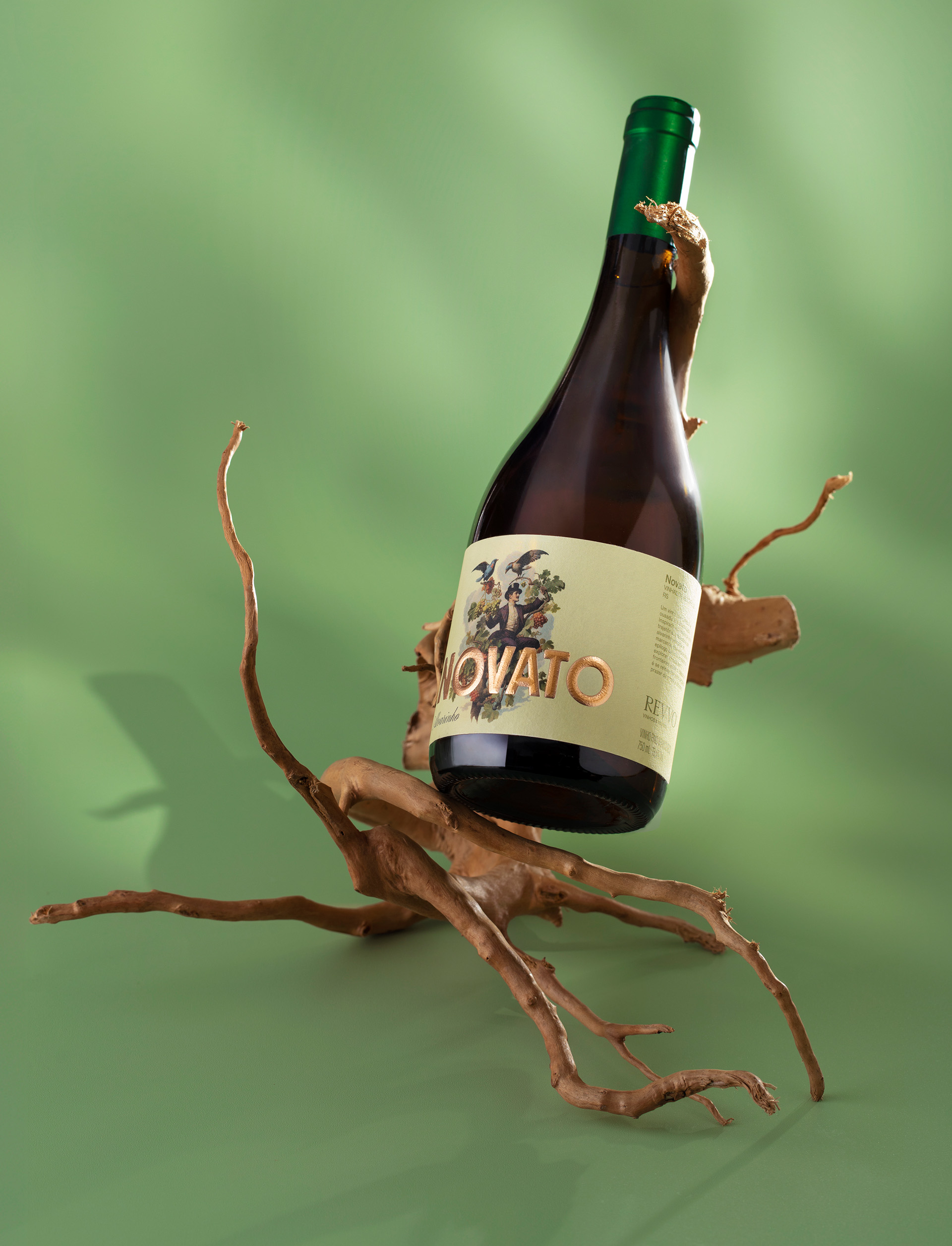 The visual identity and label were created to translate this mindset into imagery. The illustration evokes a sense of wonder that feels almost magical, portraying a character rooted in classic wine culture and Old World references, yet reinterpreted through a contemporary and irreverent lens. Tradition is present, but gently displaced, creating a visual dialogue where heritage and modernity coexist without hierarchy. This tension reflects the essence of Novato, where respect for the past does not limit reinterpretation.