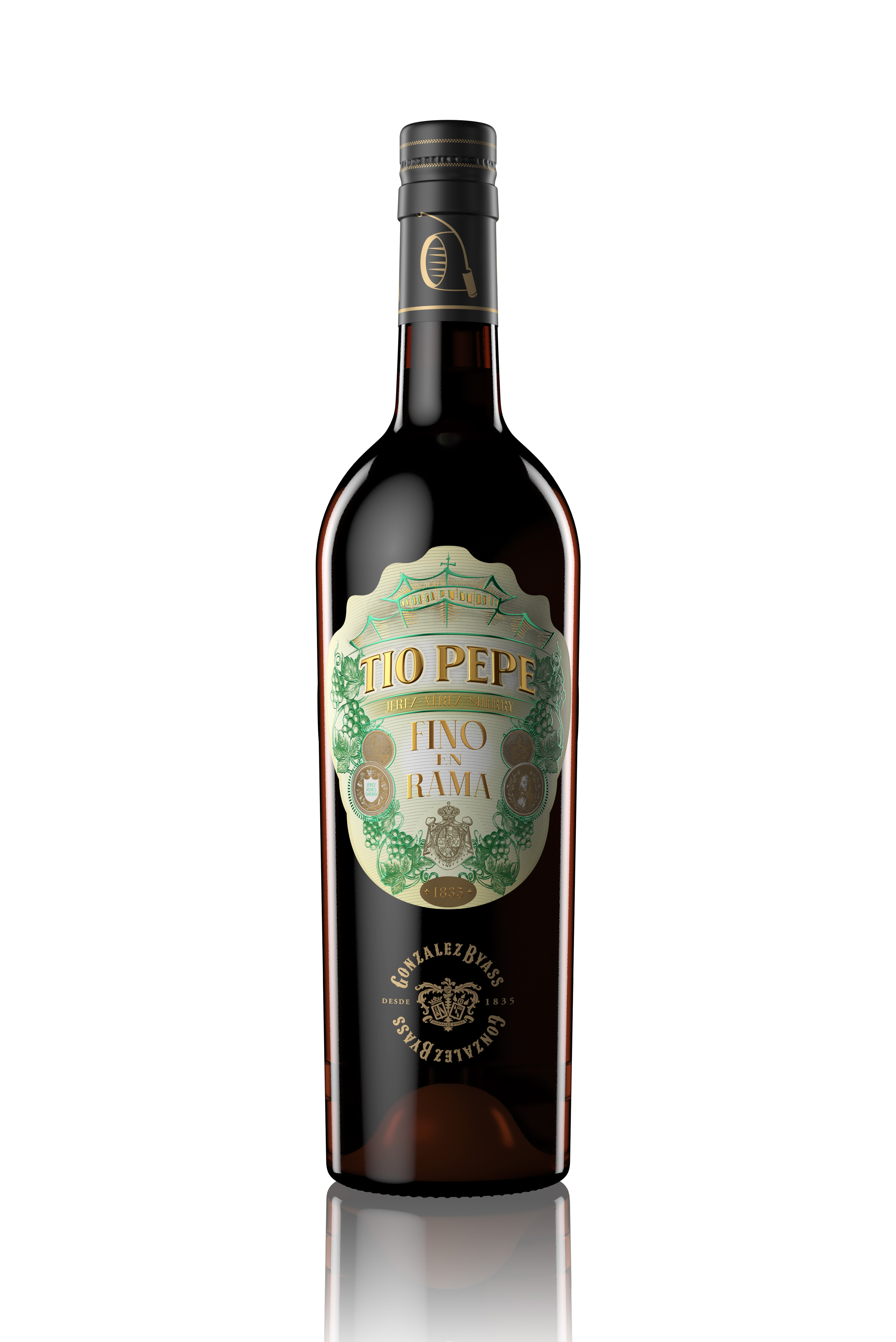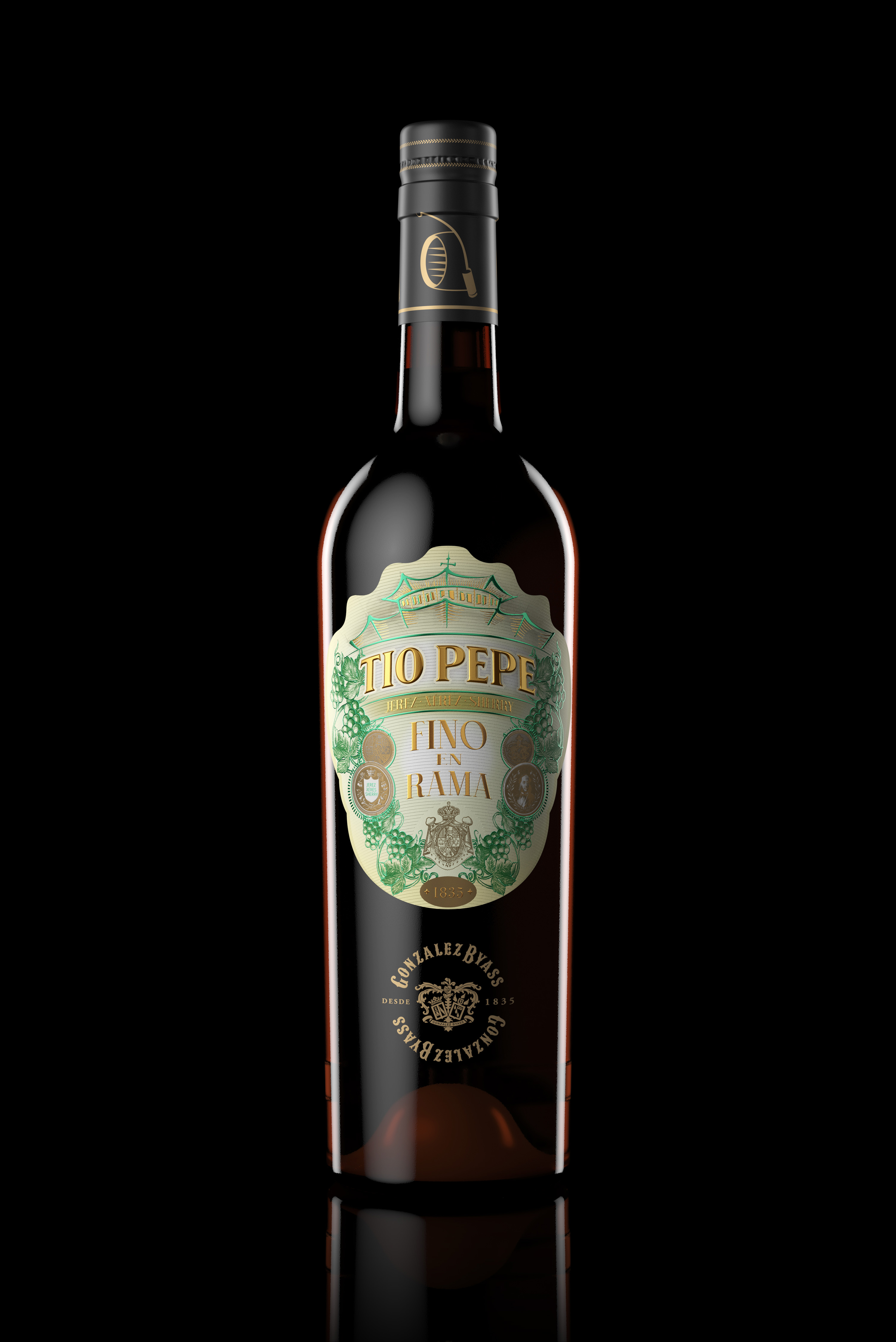 At the top, an illustration of La Concha winery—a key element in the González Byass visual heritage—while the TÍO PEPE logotype is executed in pure liquid gold (hand-applied), achieving maximum reflectance, volume, and front-facing hierarchy.