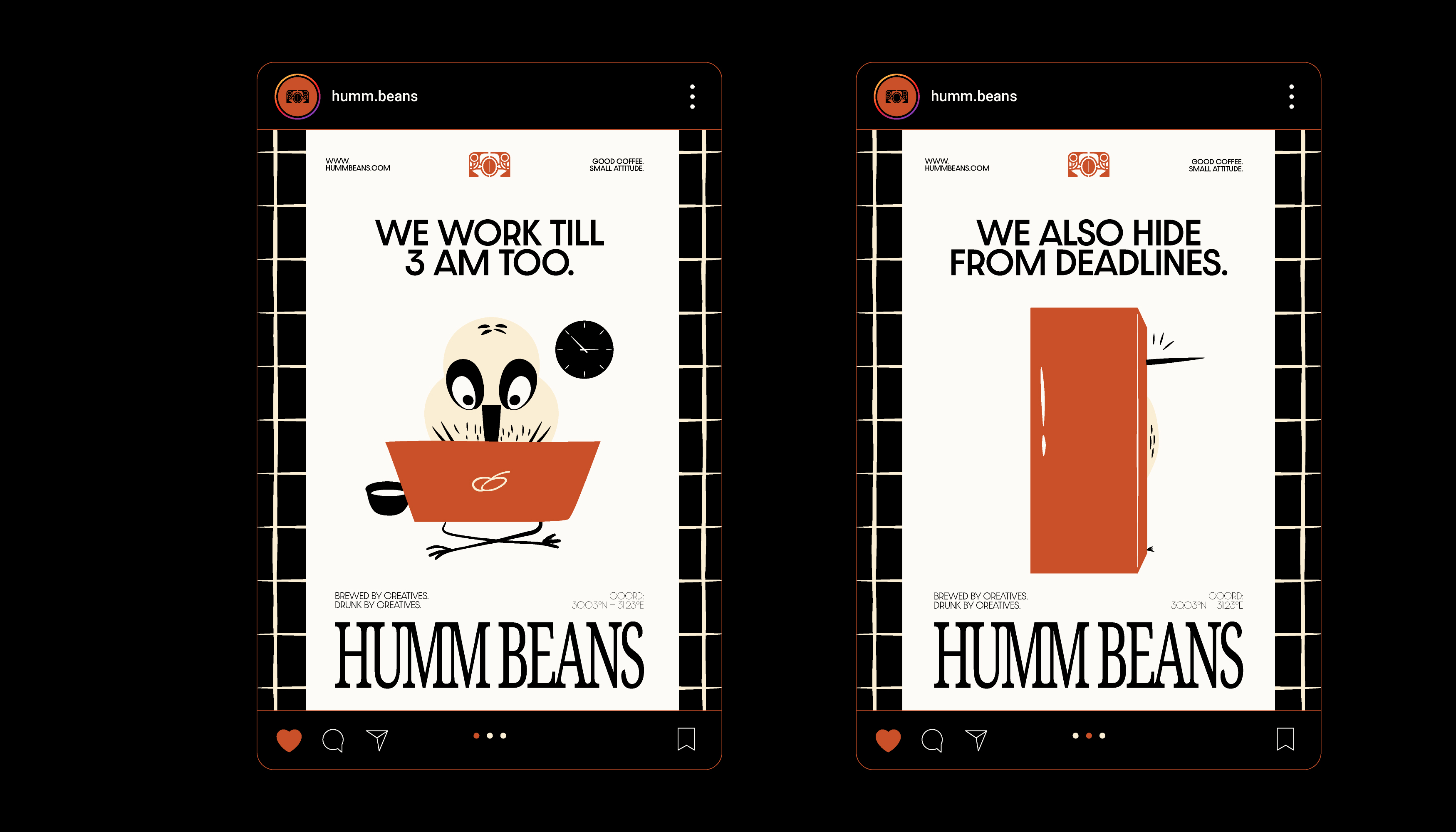 Tonally, HUMM BEANS is sassy, dry, and self-aware—much like the creatives it speaks to. The brand avoids motivational clichés and productivity myths, choosing honesty over hype. It acknowledges burnout, procrastination, and creative struggle without pretending to magically fix them. This approach allows the brand to feel relatable and human, building connection through shared experience rather than aspiration alone.