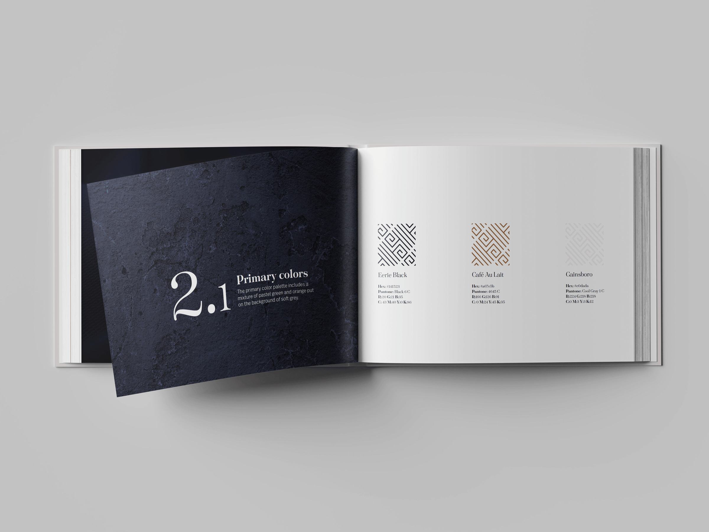 The identity is supported by a refined typography system pairing an editorial serif with a contemporary sans-serif, balancing elegance with usability. A calm palette of deep navy, café brown, and soft beige draws from interior materials and natural textures, reinforcing the brand’s connection to space and tactility.