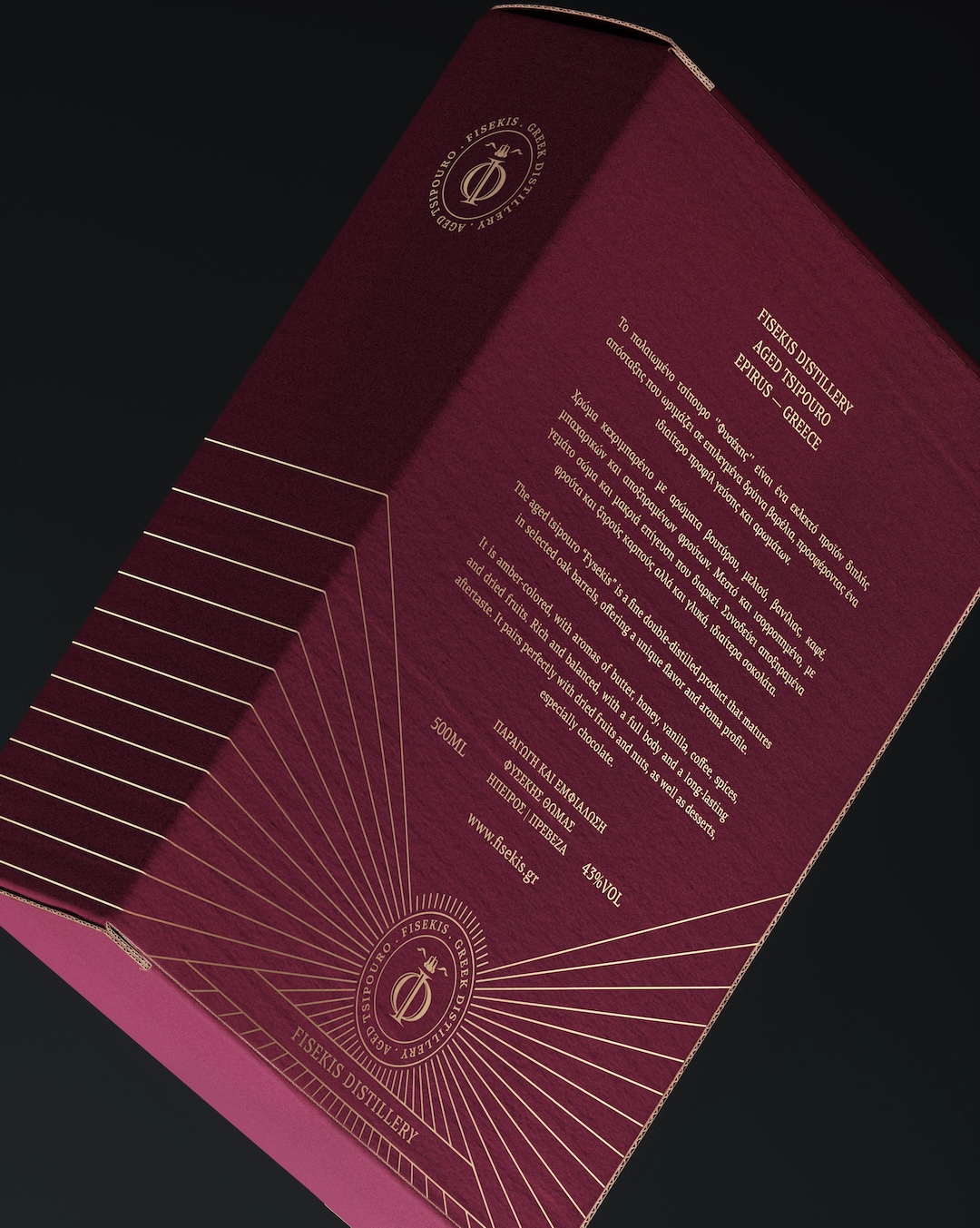 This project is the premium packaging design for Fisekis Distillery Aged Tsipouro, an oak-matured Greek spirit from Epirus, Greece, positioned as a refined sipping experience rather than a casual traditional drink. The final product consists of a custom, sculptural bottle and a rigid presentation box with a die-cut window, produced in Colorplan Claret paper and finished with gold foil stamping inside and out, an approach that communicates rarity, warmth and collectability from first glance to unboxing.