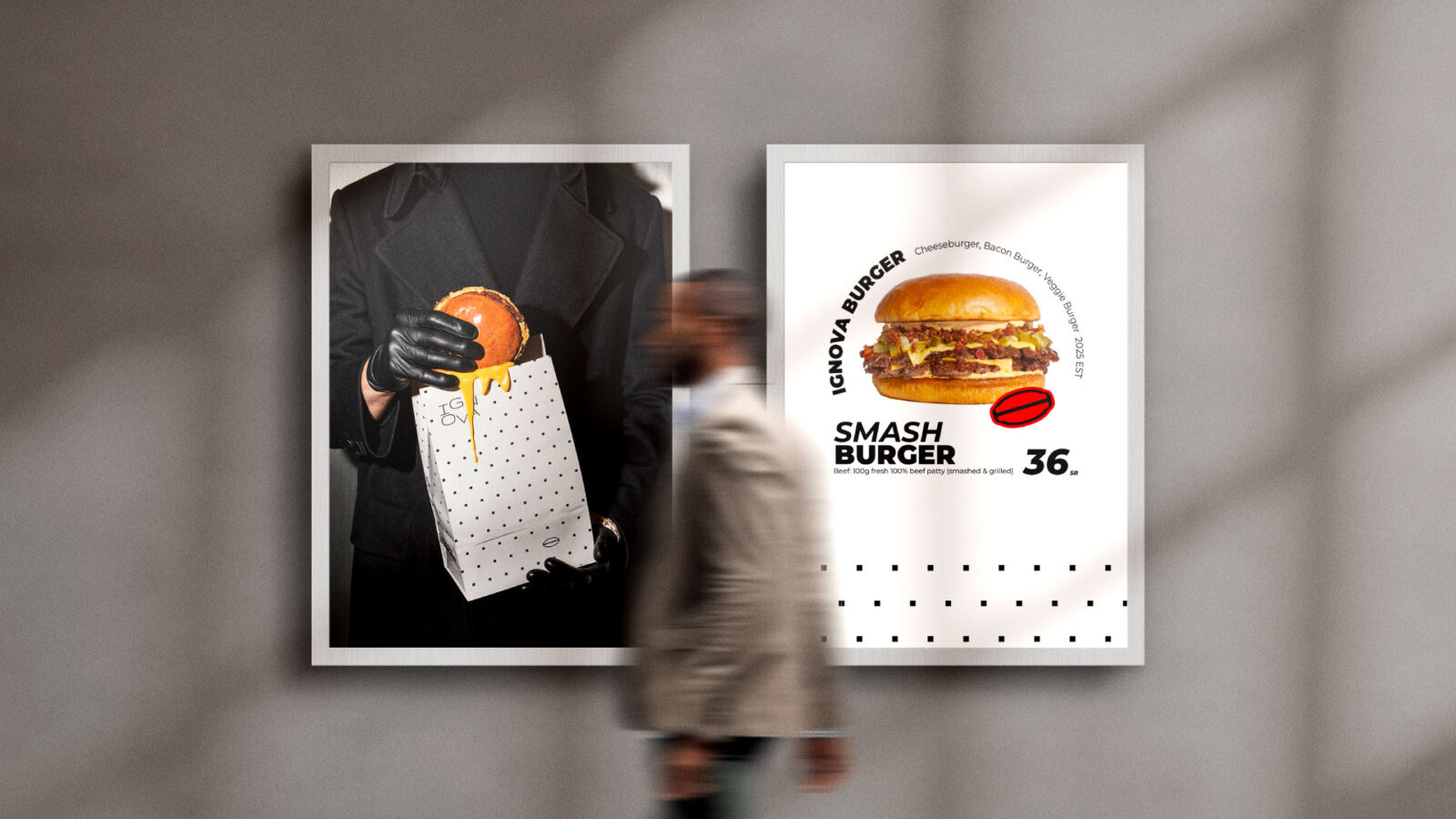 To achieve this, we immersed ourselves in understanding the brand’s story, personality, and aspirations. We explored its core values, the emotions it aims to evoke, and the unique experience it seeks to deliver. Our vision was to build a complete visual system that is modern, flexible, and powerful across every platform—whether physical or digital. This includes packaging design, staff uniforms, signage, print materials, advertising campaigns, and social media presence. Our goal was to ensure that every customer interaction feels cohesive and unmistakably IGNOVA BURGER.