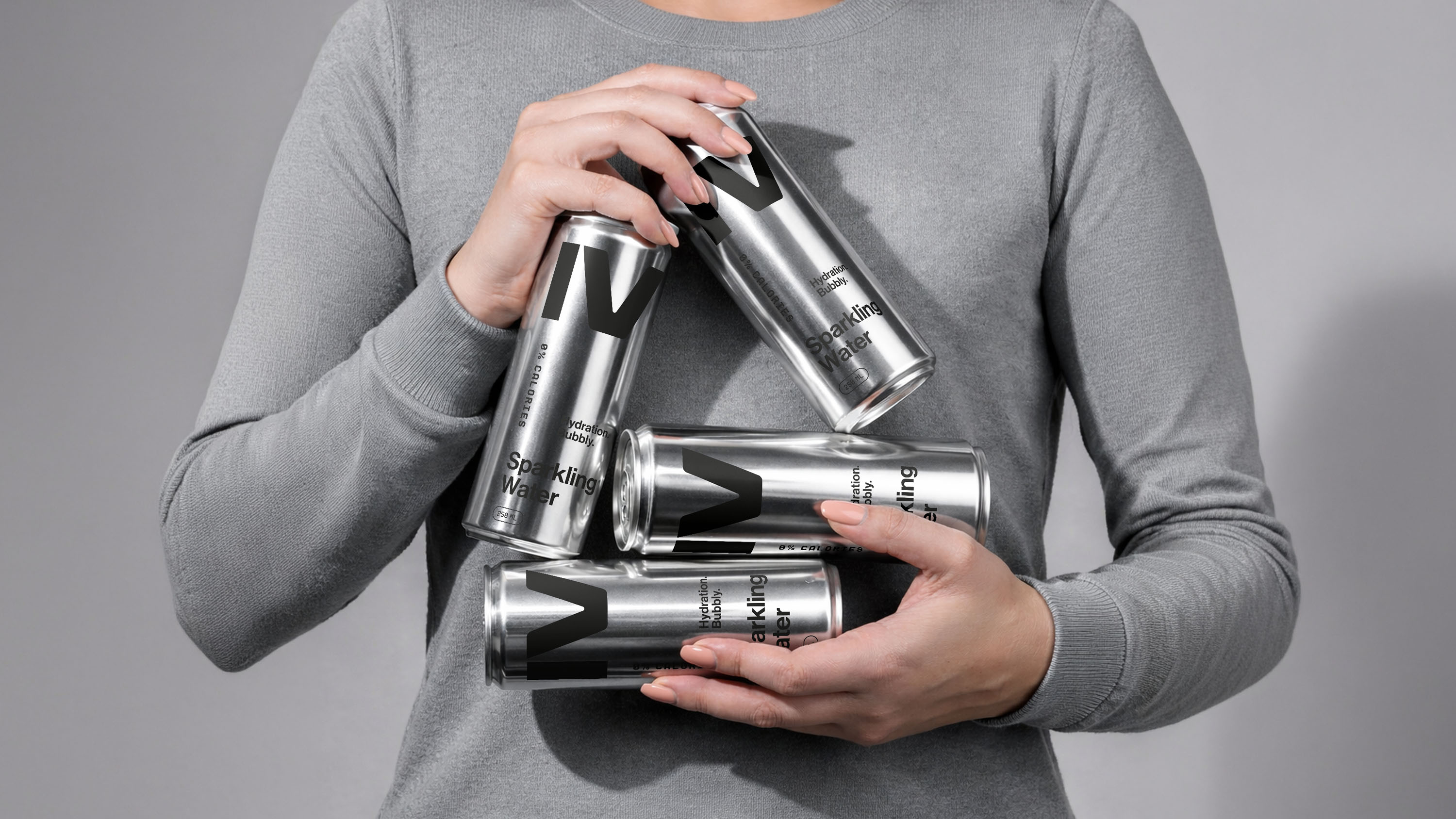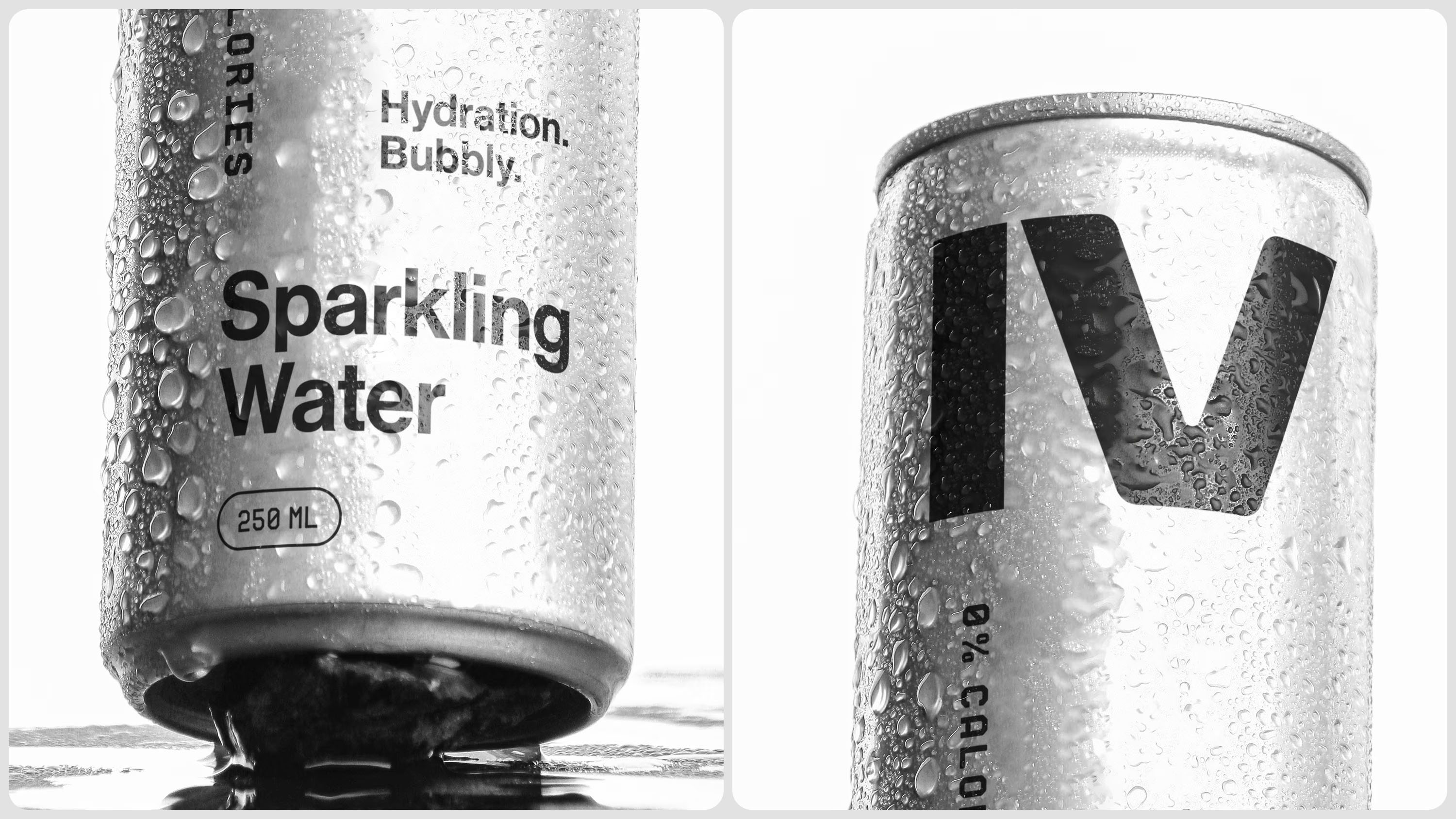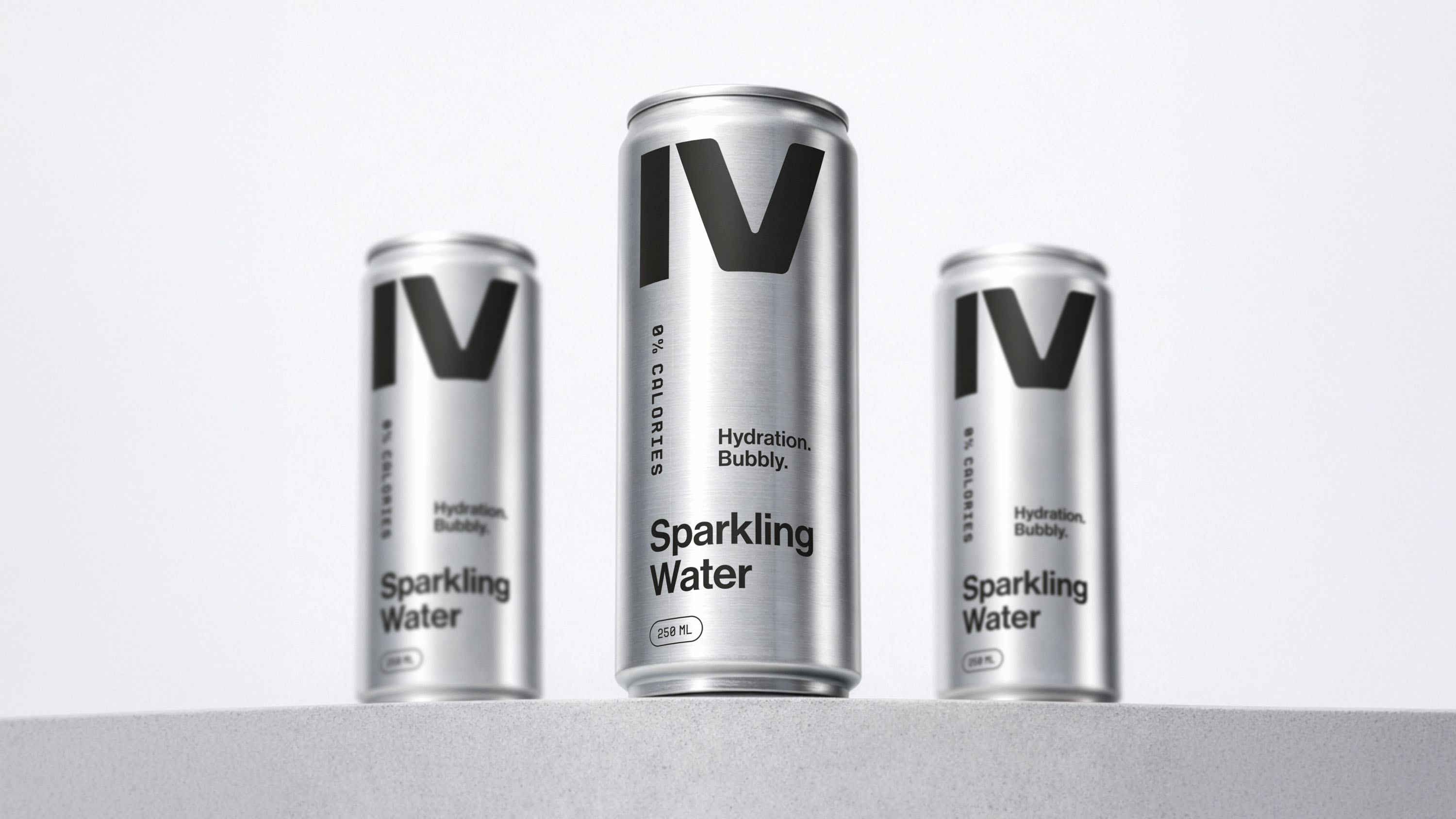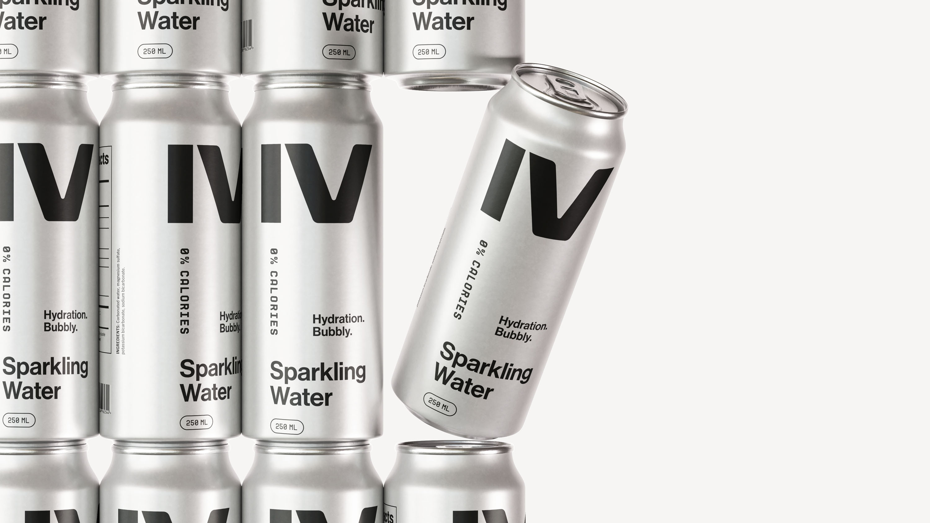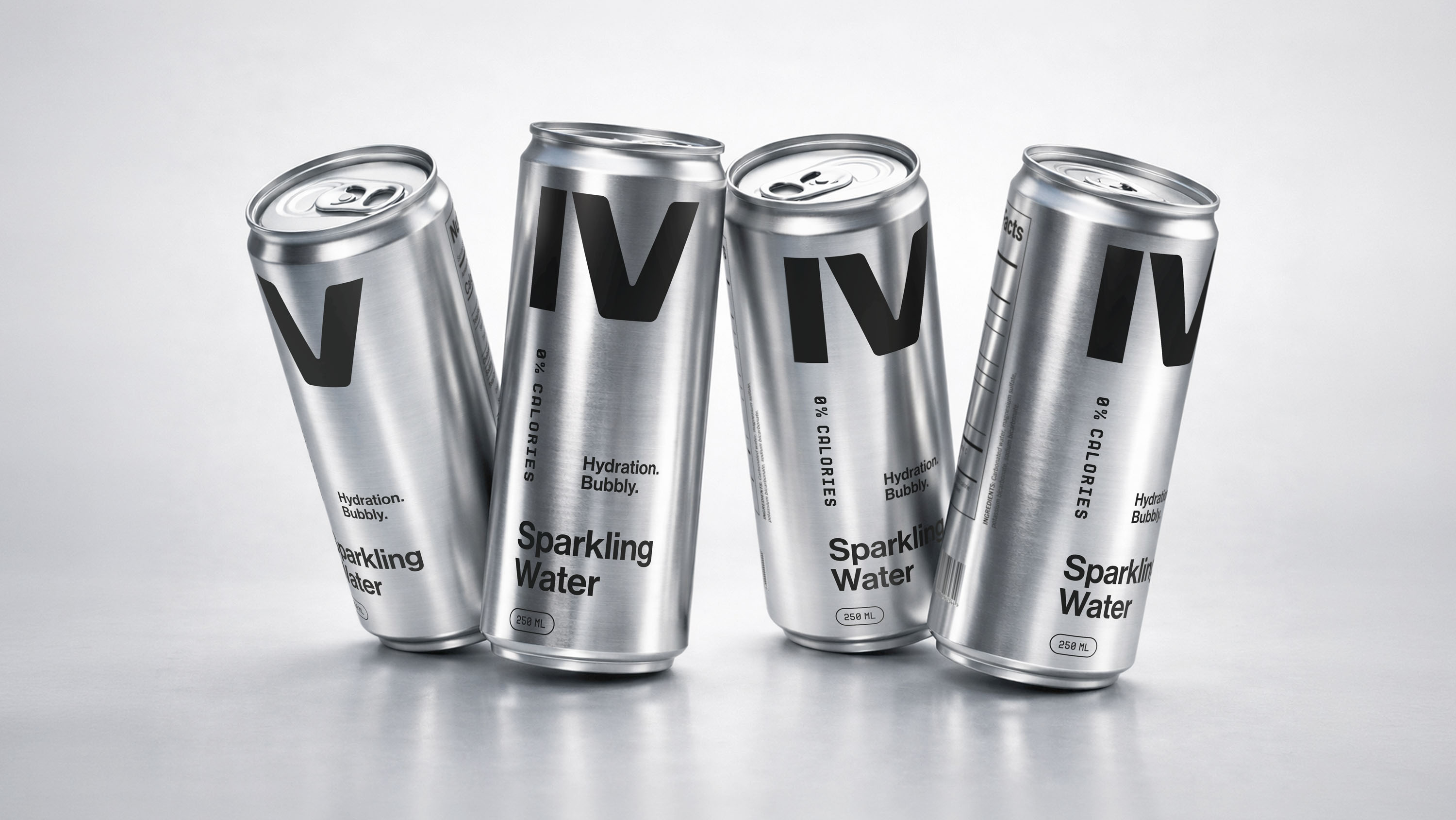 The IV mark was scaled to dominate, treated not as a logotype but as a visual monument, rendered in pure black directly onto uncoated aluminium. No label. No shrink wrap. Nothing between the brand and the consumer but the product itself. Every typographic decision, every word on the can, earns its place through function alone.