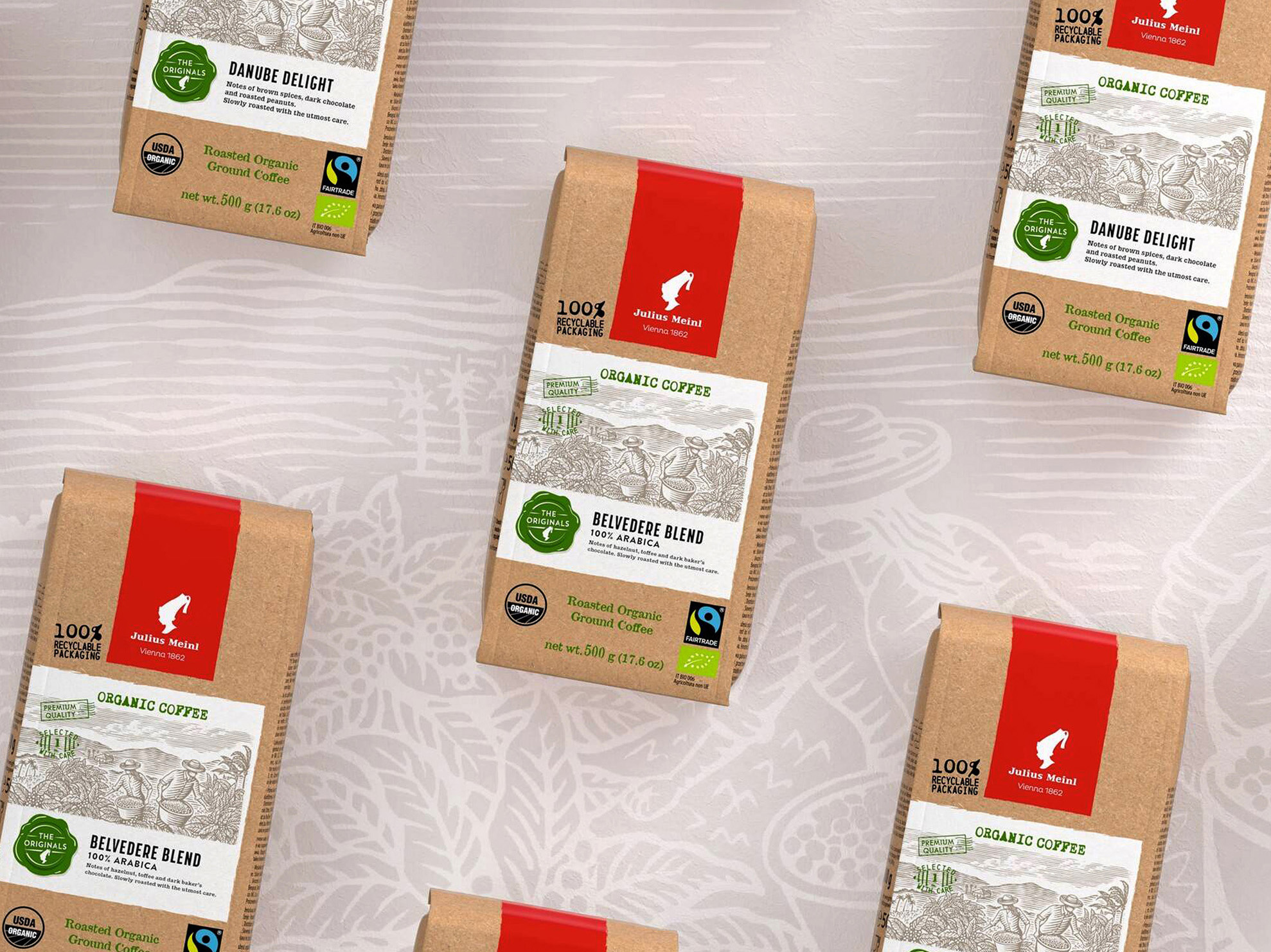 The illustrations on the new packaging designs for the three exciting Bio Fairtrade additions to The Originals coffee line by Julius Meinl have been thoughtfully imagined by the renowned American illustrator, Steven Noble. Celebrated for his artisanal approach to design, his illustrations feature complex and precise linework, created through the use of traditional hand-wood curving techniques. Steven’s illustrations capture the most meaningful moments in the coffee harvesting process including a coffee farm with its farmers which is key to this great premium coffee, and which can be seen on the front of the new packaging designs.The illustrations on the new packaging designs for the three exciting Bio Fairtrade additions to The Originals coffee line by Julius Meinl have been thoughtfully imagined by the renowned American illustrator, Steven Noble. Celebrated for his artisanal approach to design, his illustrations feature complex and precise linework, created through the use of traditional hand-wood curving techniques. Steven’s illustrations capture the most meaningful moments in the coffee harvesting process including a coffee farm with its farmers which is key to this great premium coffee, and which can be seen on the front of the new packaging designs. Steven’s illustrations capture the most meaningful moments in the coffee harvesting process including a coffee farm with its farmers which is key to this great premium coffee, and which can be seen on the front of the new pac