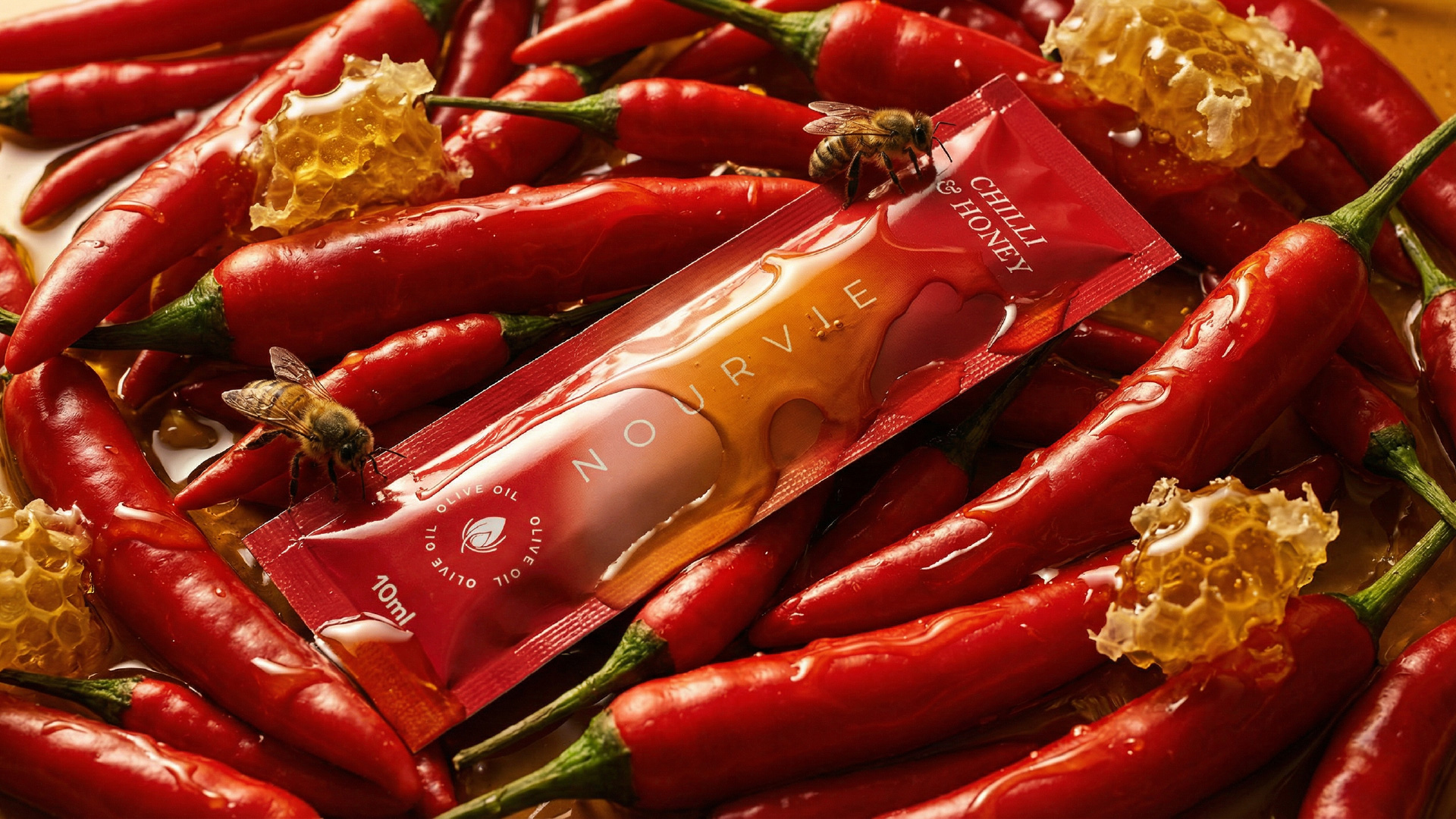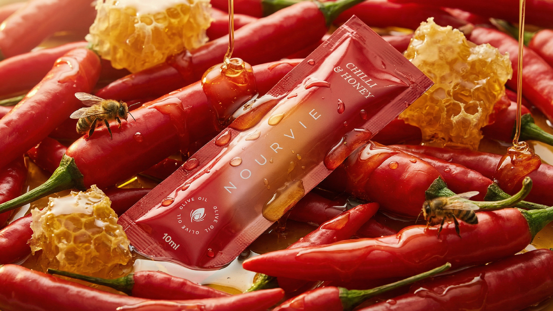 The creative photography amplifies the design’s sensory ambition. Each variant is staged within its own ingredient world — chillies and dripping honeycomb for the Chilli & Honey, a flat-lay of wild herbs for the Rosemary, olives gleaming in oil for the Classic — making the packaging feel inseparable from the ingredients it carries. Together, the design and art direction form a coherent visual language that positions Nourvie not merely as a condiment, but as an object of culinary intention.